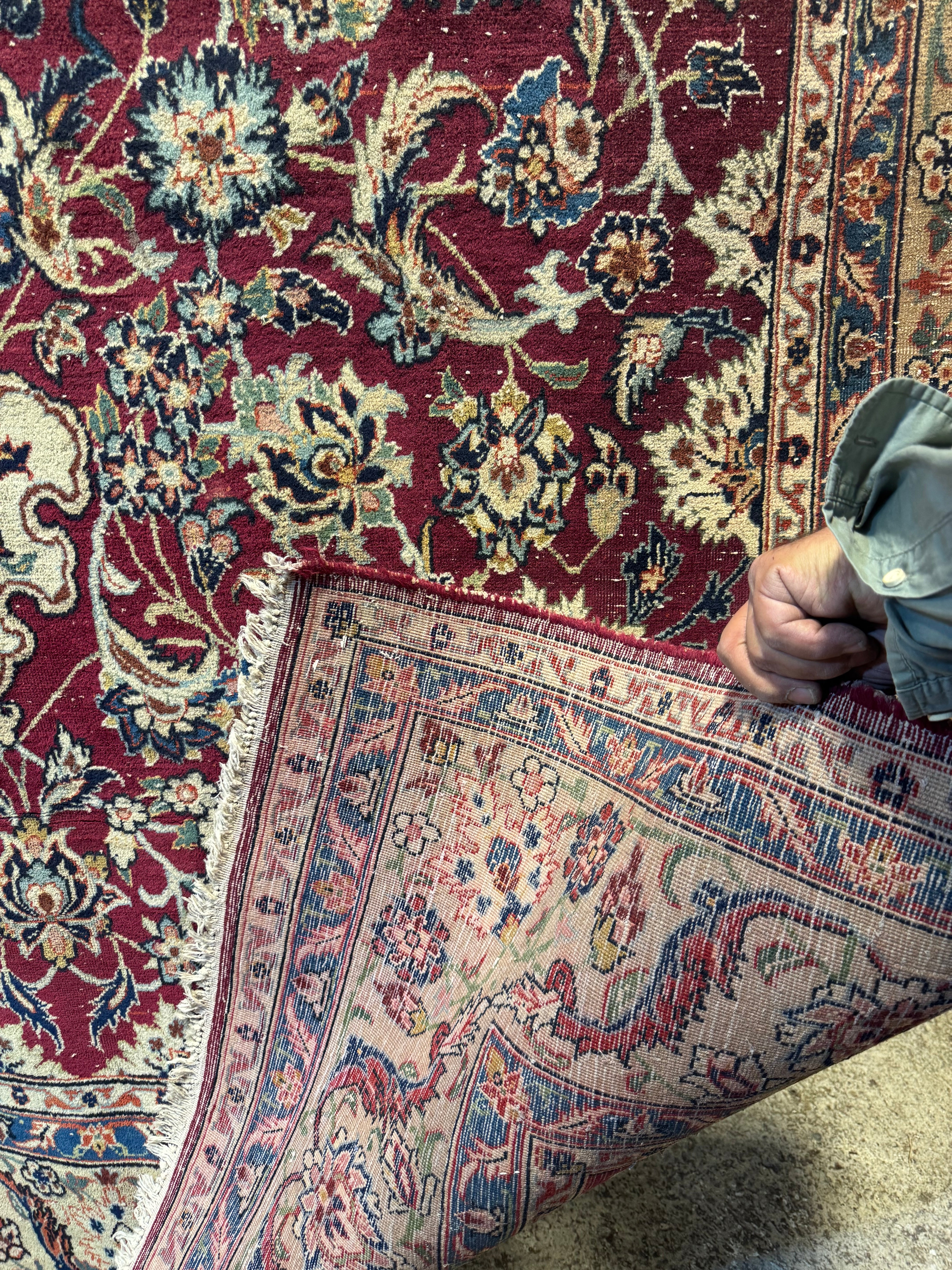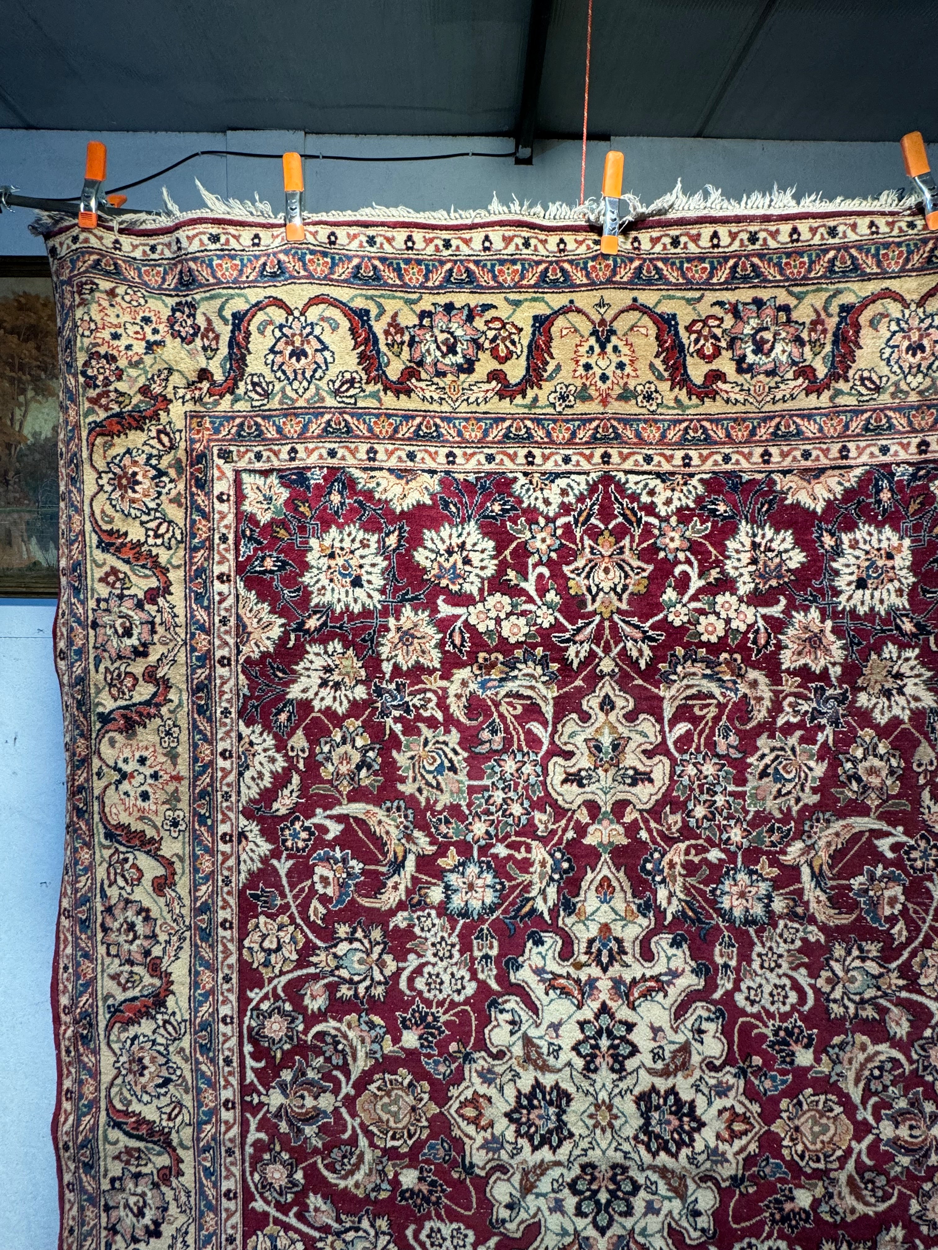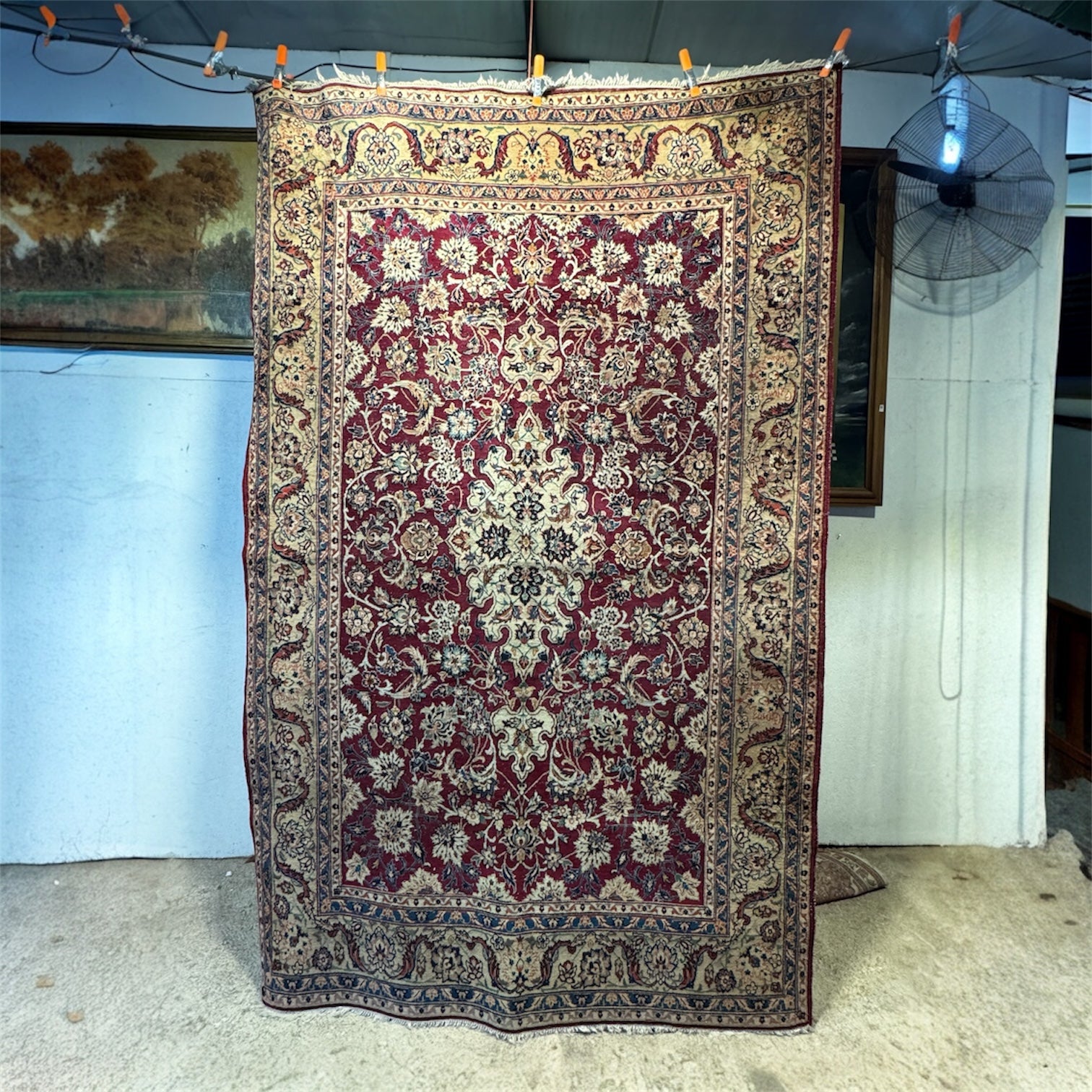 Fantástica alfombra persa de la región central, hecho de lana tejida y teñida a mano. Esta alfombra tiene un diseño de medallón floral, rodeado de intrincados motivos florales. El medallón central de color crema, es el foco principal del diseño de la alfombra. También predomina el rojo oscuro del fondo, con detalles en azul y crema en sus decoraciones.