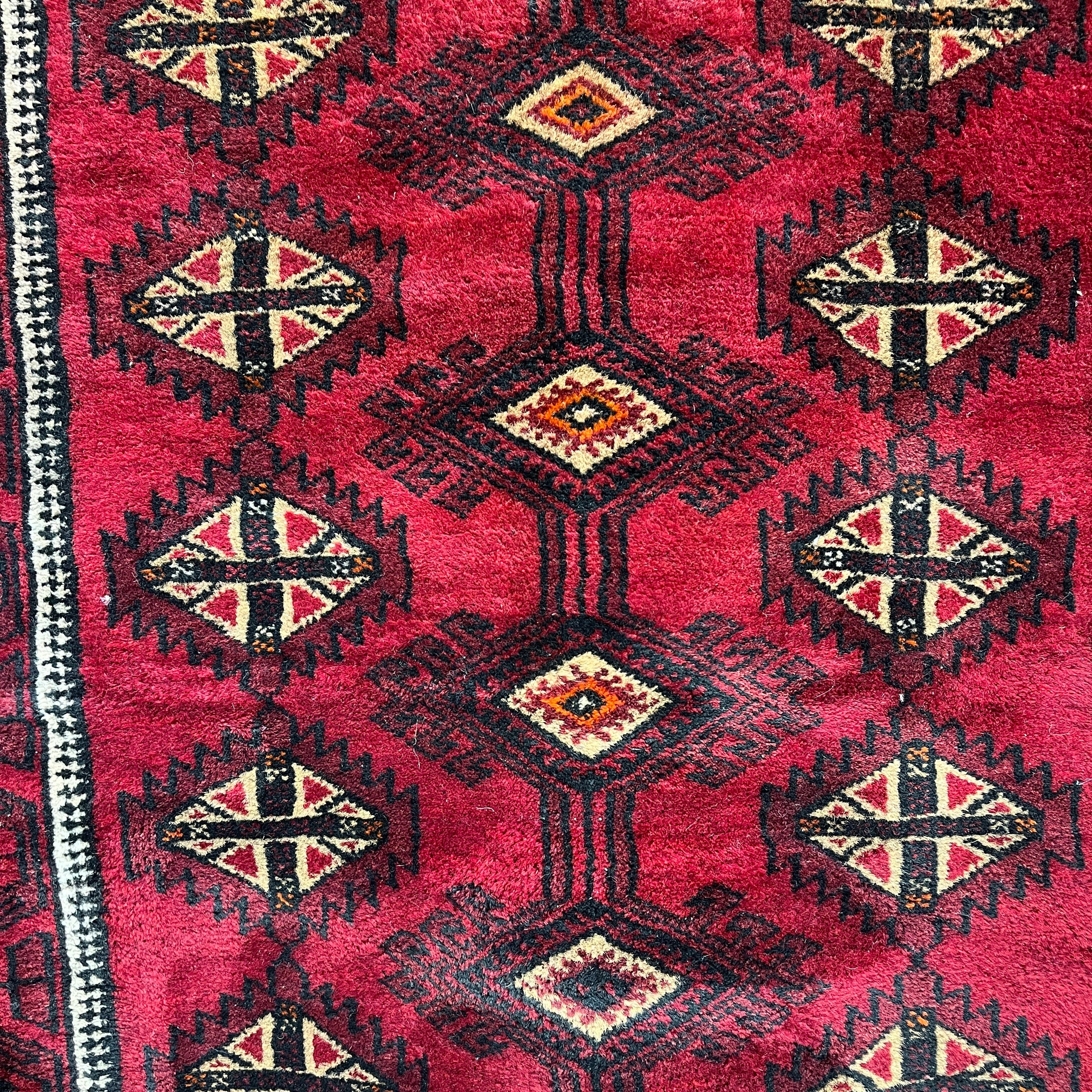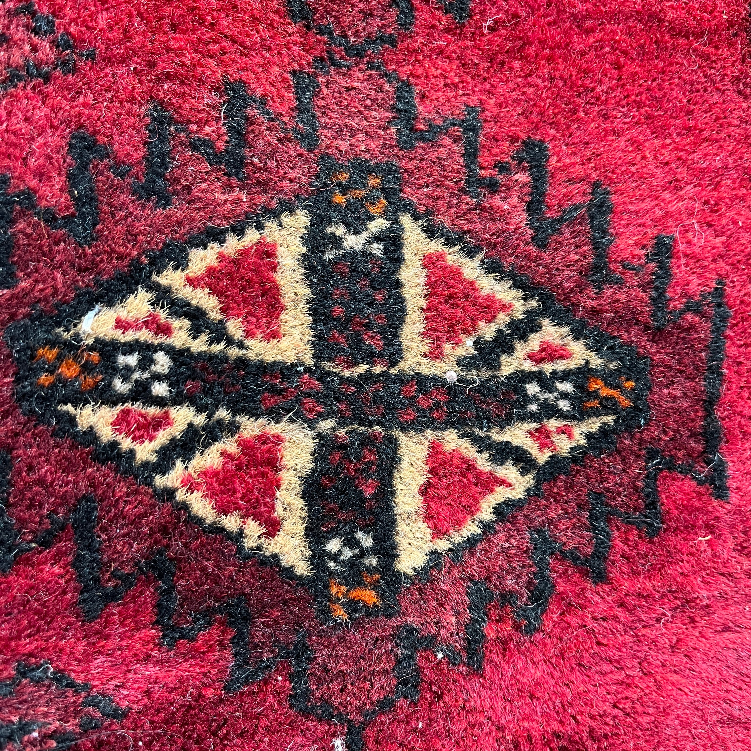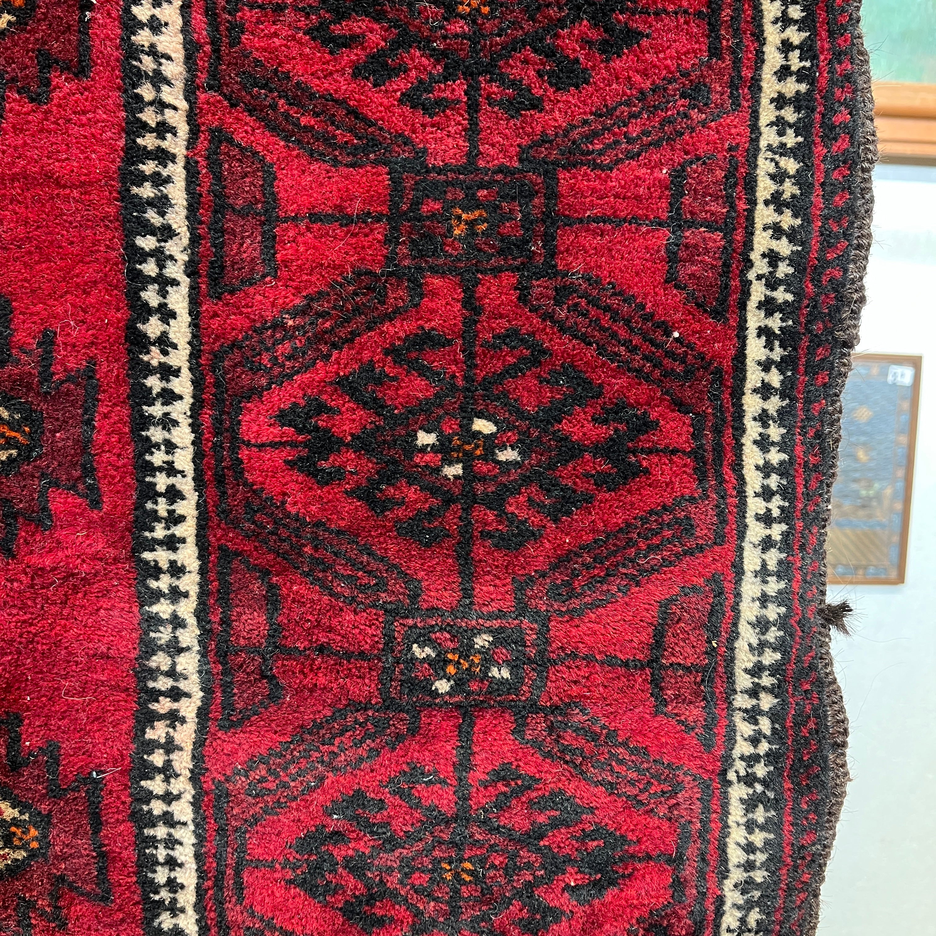 Bella alfombra, de origen pakistaní Buckhara. El nombre proviene de la antigua ciudad de Bujará en Uzbekistán, que era un centro cultural y comercial en la Ruta de la Seda. Las alfombras originales estaban vinculadas a los turcomanos que habitaban la región. Hoy en día esta tradición de alfombras se mantiene en Pakistán y Afganistán, manteniendo el  trabajo artesanal del tejido a mano y el teñido con tintes vegetales. Esta pieza presenta un diseño distintivo con motivos  repetitivos, a menudo llamados "pata de elefante", en una disposición geométrica. Predomina el rojo, blanco y negro.