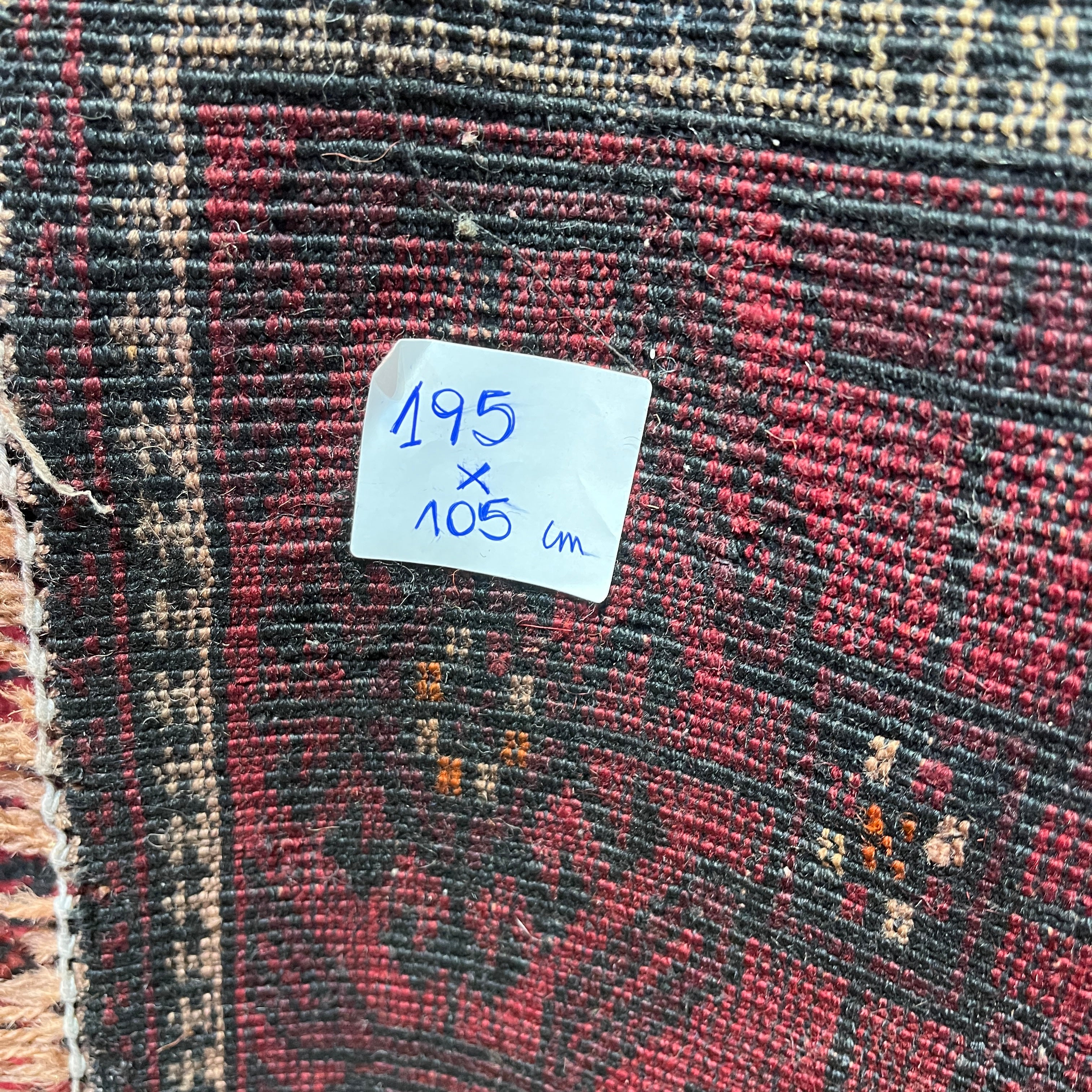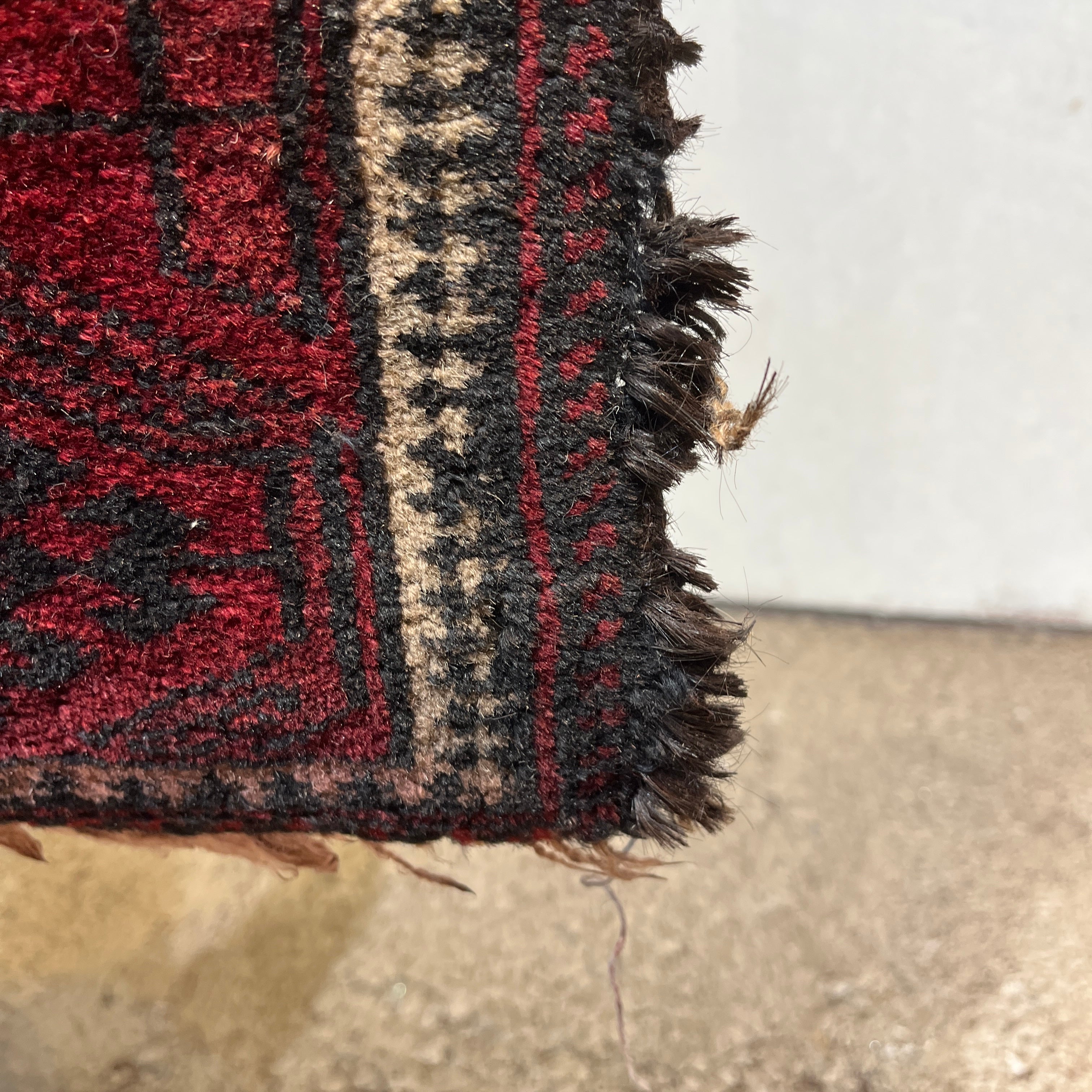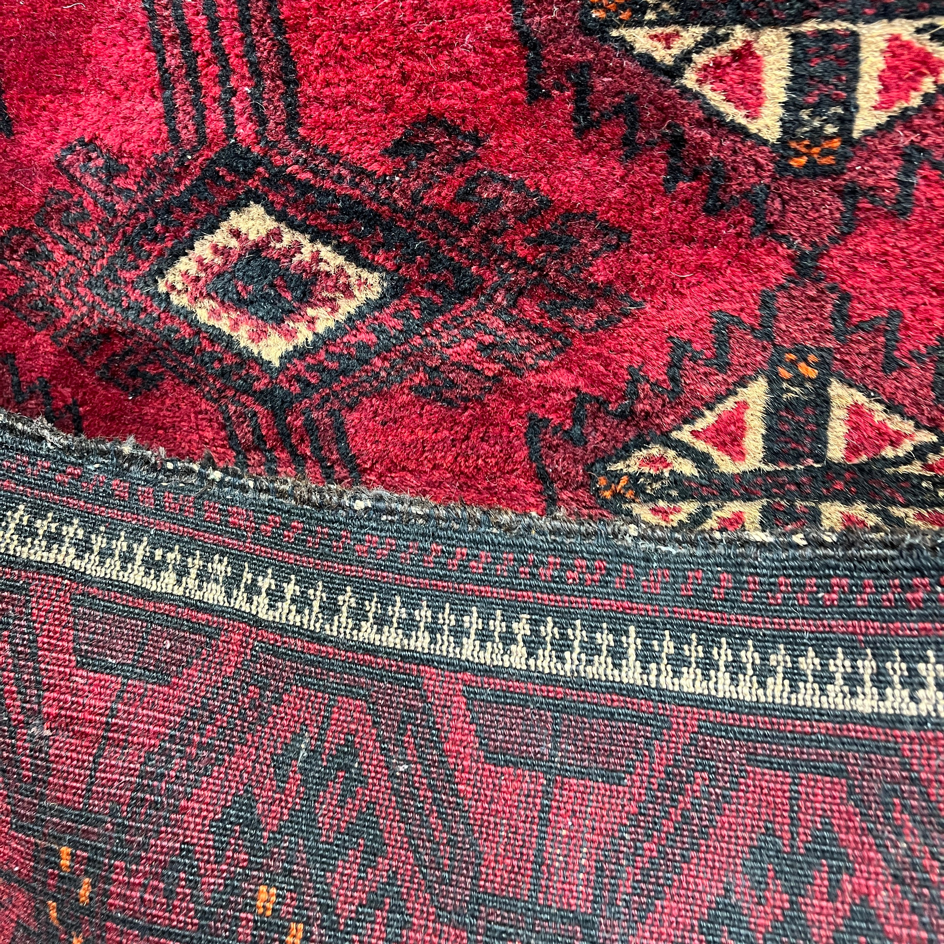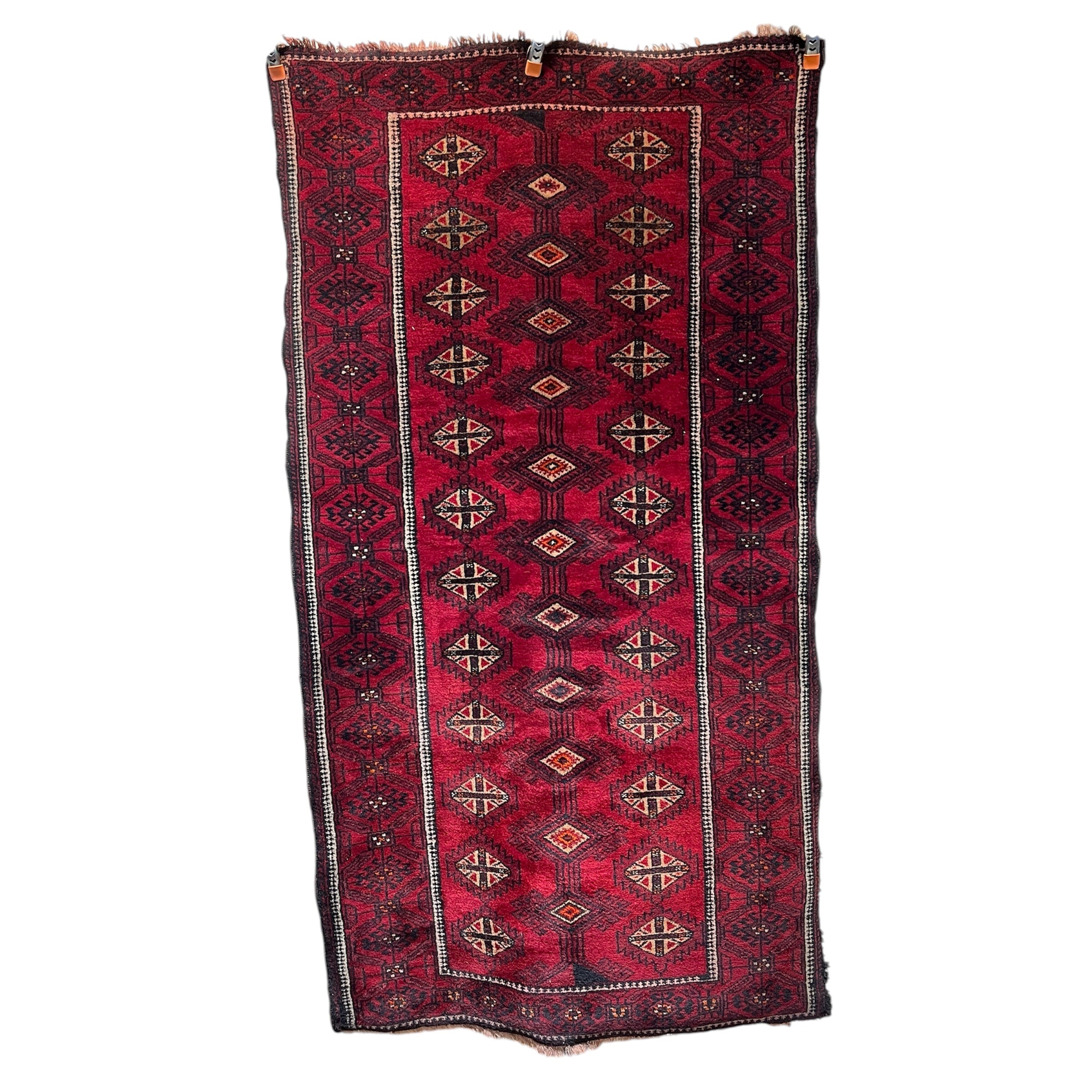 Bella alfombra, de origen pakistaní Buckhara. El nombre proviene de la antigua ciudad de Bujará en Uzbekistán, que era un centro cultural y comercial en la Ruta de la Seda. Las alfombras originales estaban vinculadas a los turcomanos que habitaban la región. Hoy en día esta tradición de alfombras se mantiene en Pakistán y Afganistán, manteniendo el  trabajo artesanal del tejido a mano y el teñido con tintes vegetales. Esta pieza presenta un diseño distintivo con motivos  repetitivos, a menudo llamados "pata de elefante", en una disposición geométrica. Predomina el rojo, blanco y negro.