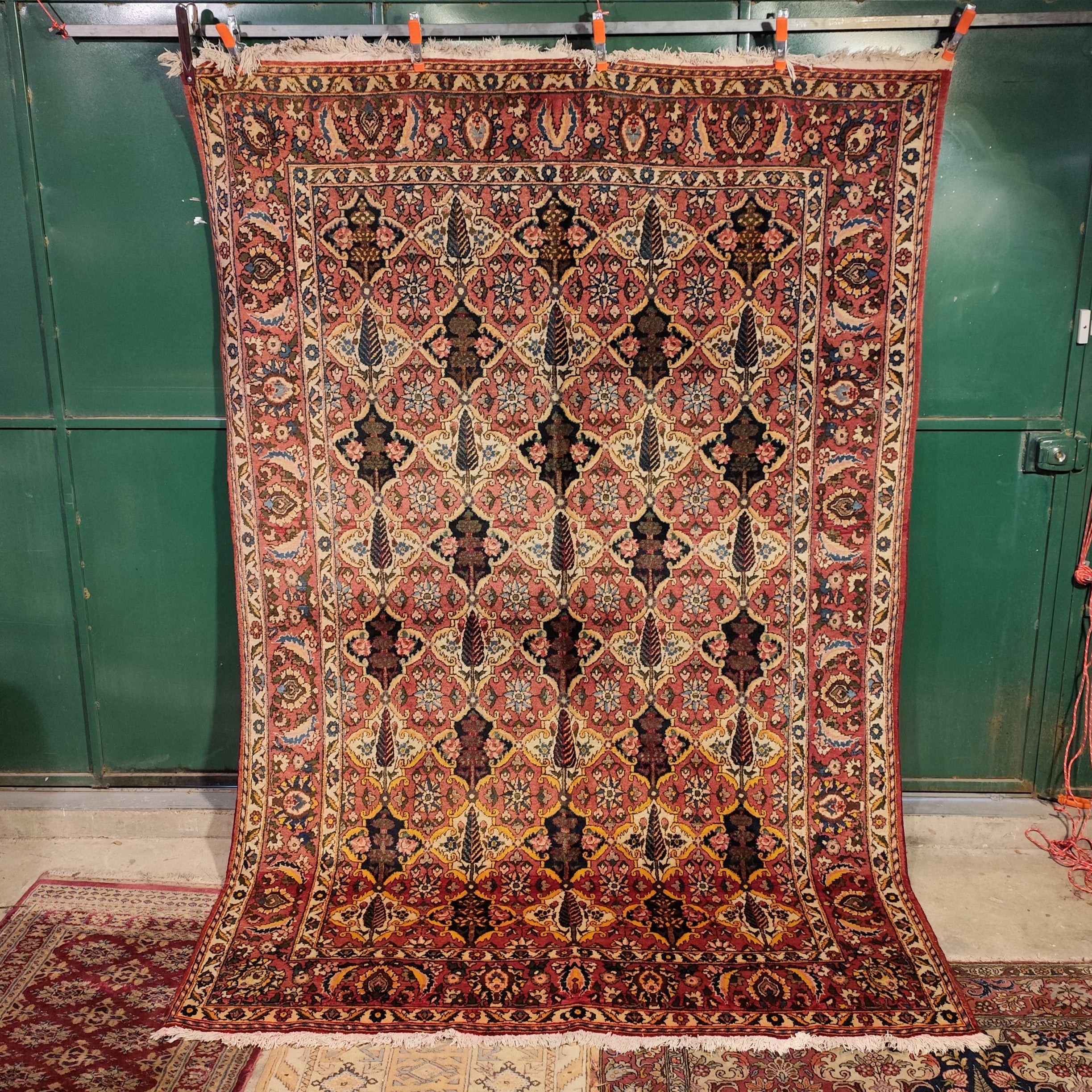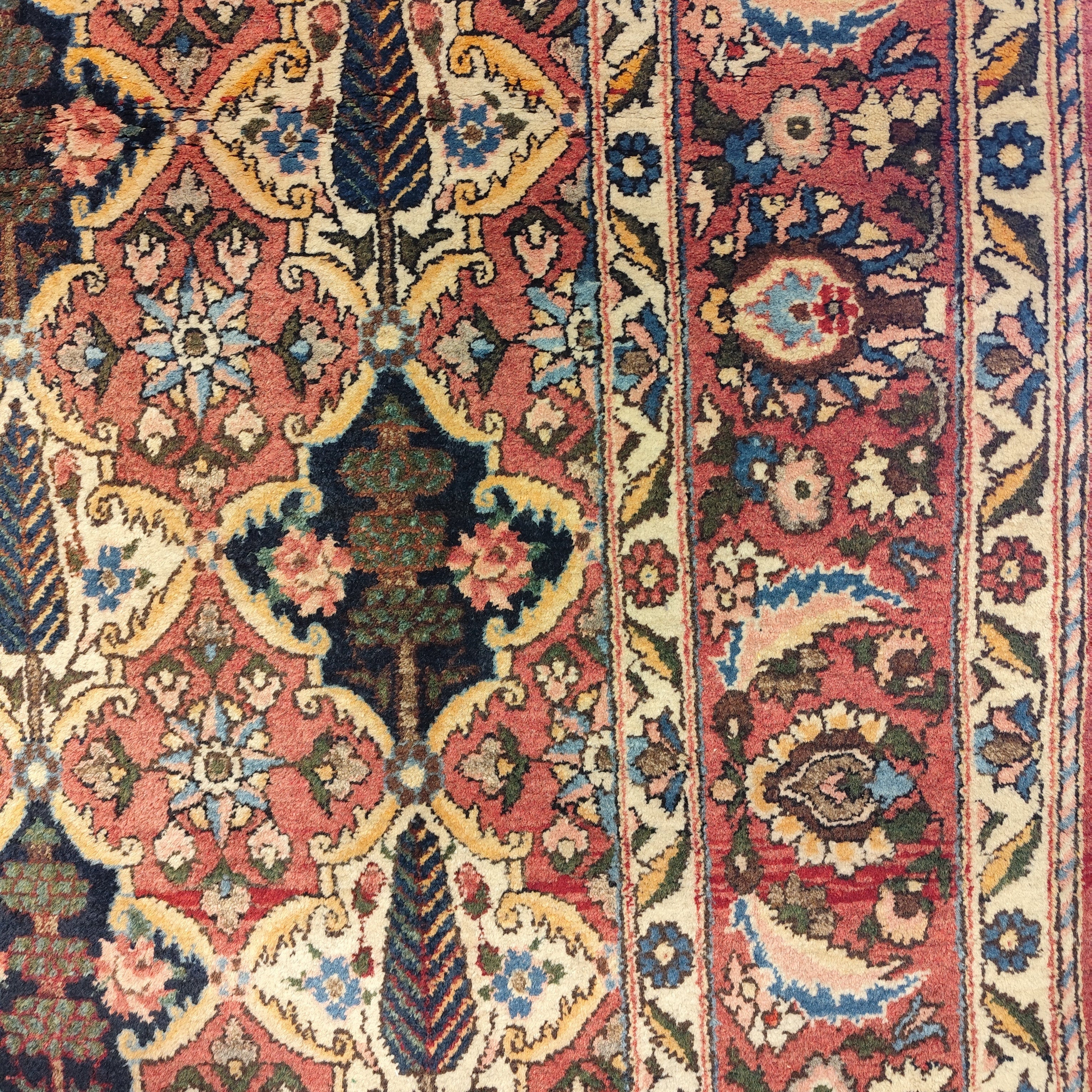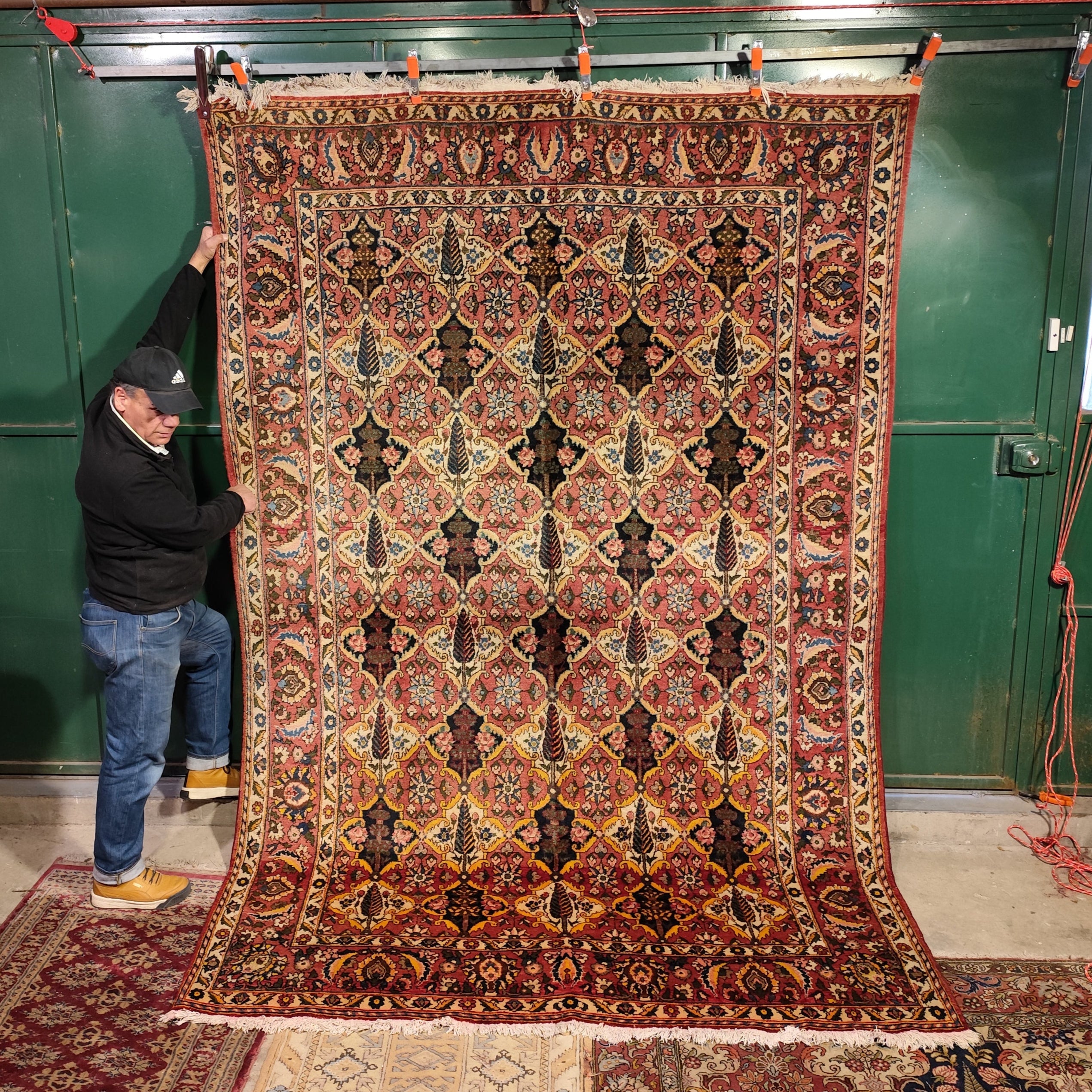 Hermosa alfombra iraní de Isfahán. Destaca por su diseño tradicional en un juego de patrones combinados con el motivo de la piña (fruto del pino), representativo del desarrollo cultural de Oriente medio.