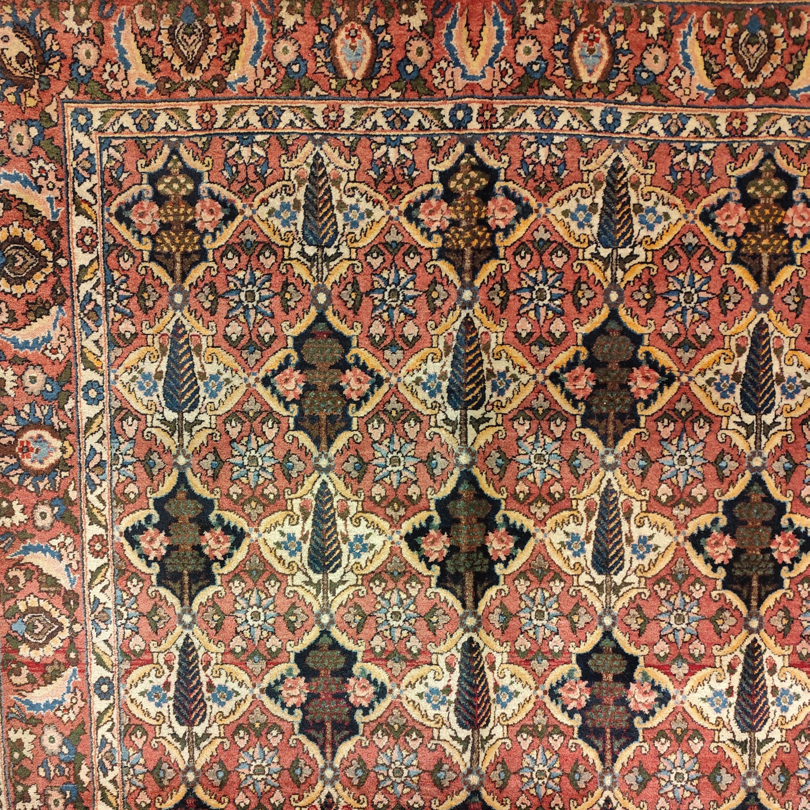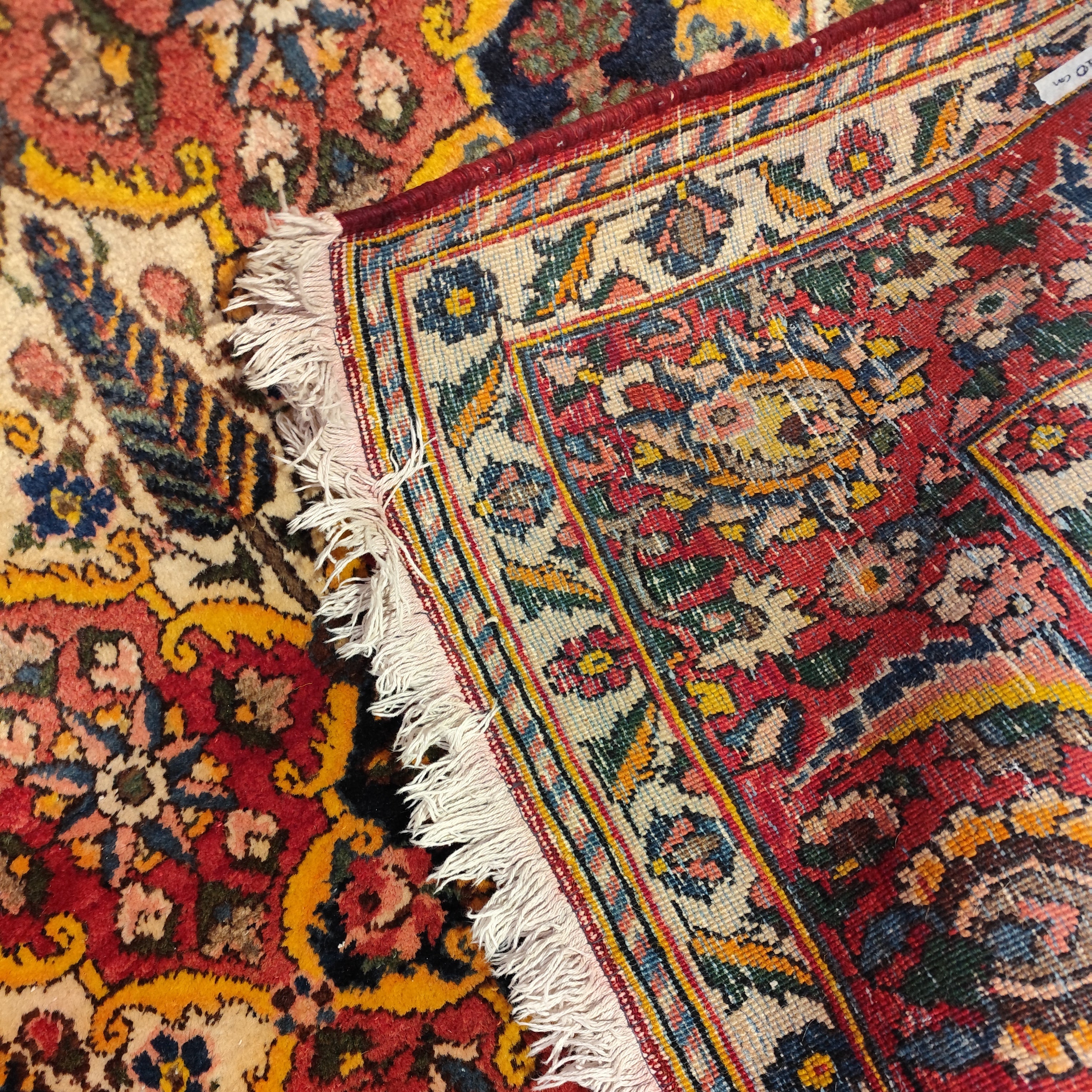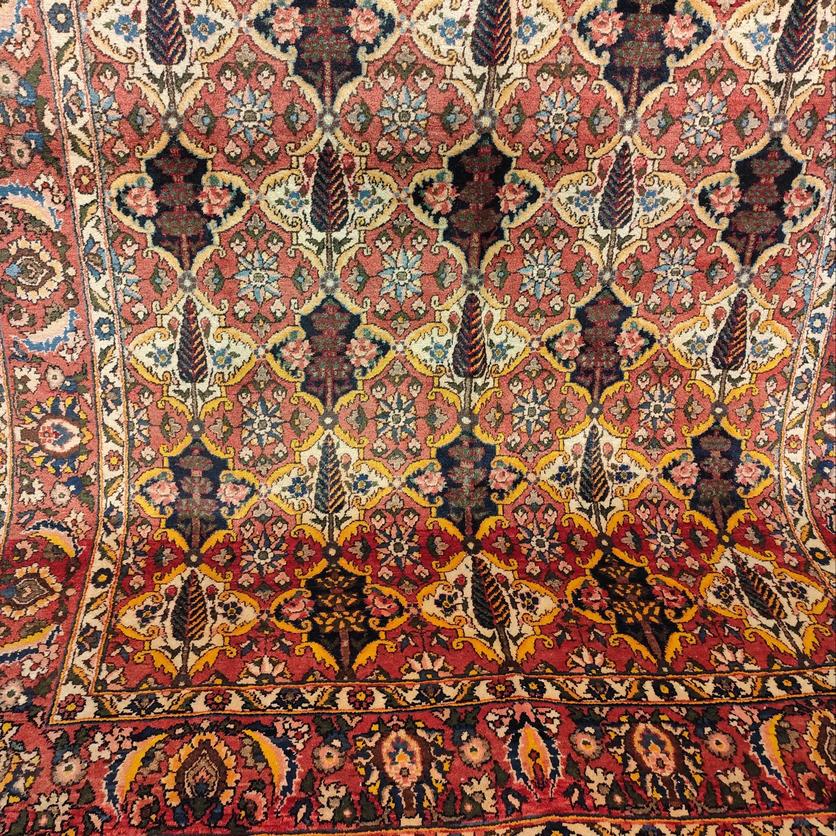 Hermosa alfombra iraní de Isfahán. Destaca por su diseño tradicional en un juego de patrones combinados con el motivo de la piña (fruto del pino), representativo del desarrollo cultural de Oriente medio.