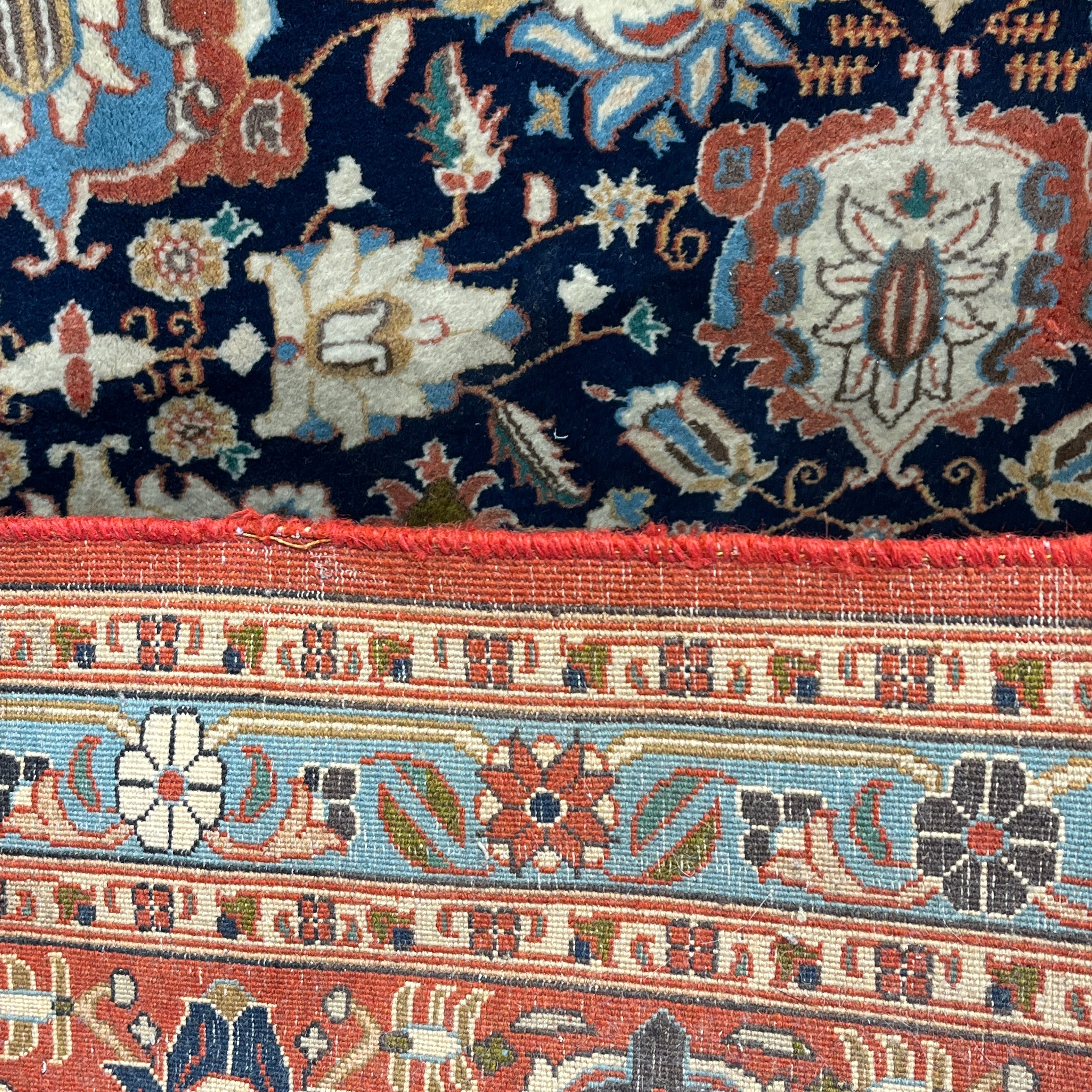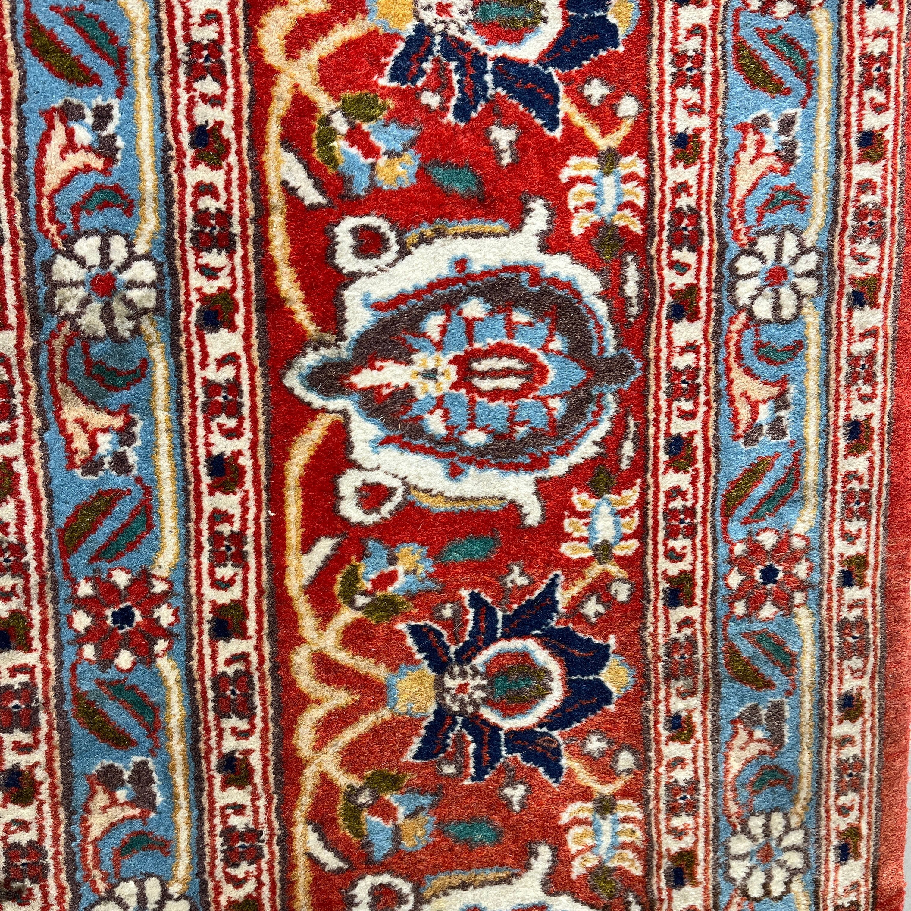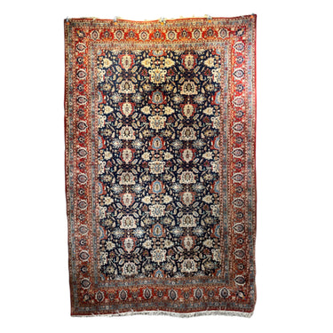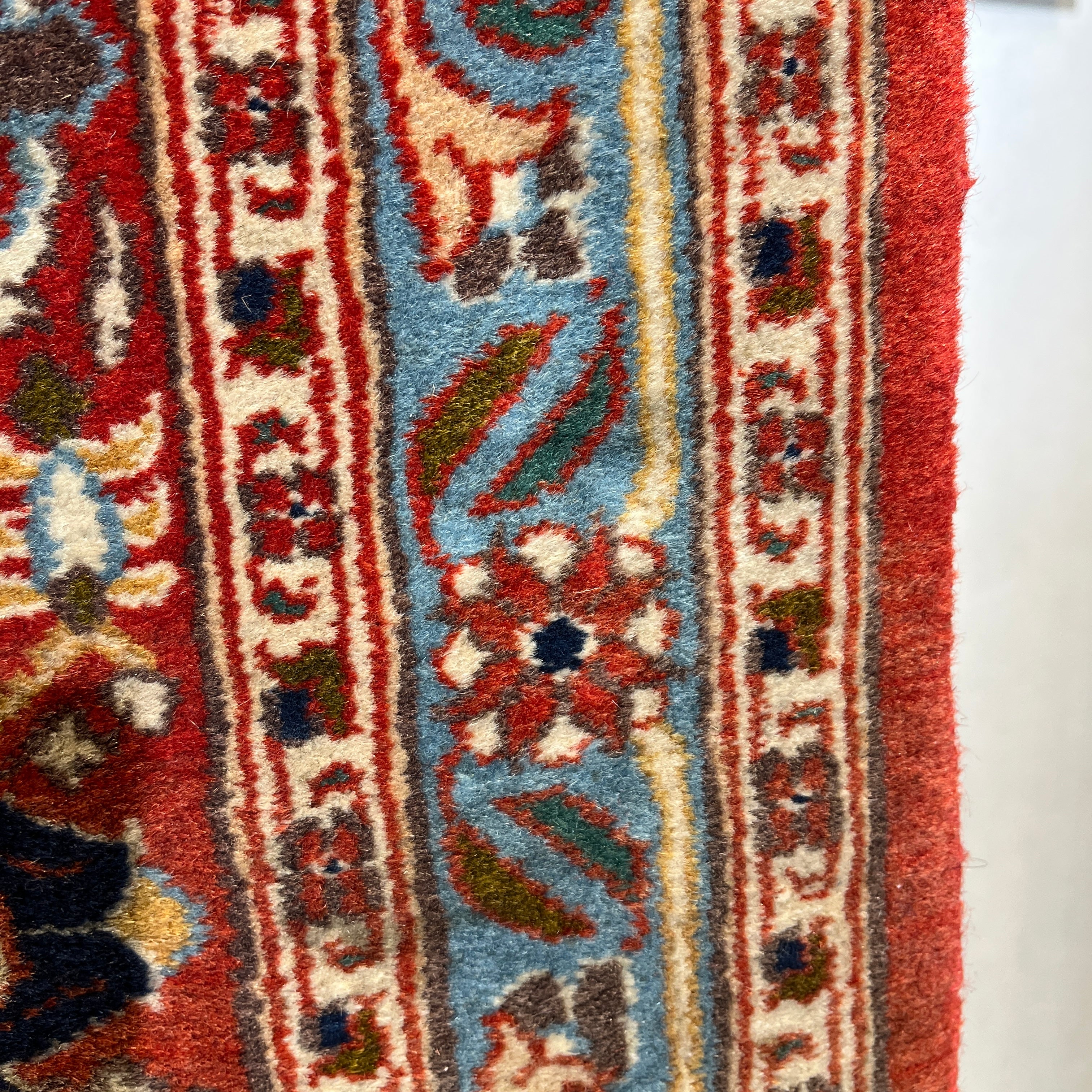 Alfombra persa Vehrahine hecha de lana tejida a mano y teñida con tintes naturales de origen vegetal. Estas alfombras son tejidas a mano por pastores de las zonas rurales de Hamadán, en el noroeste de Irán. Se caracterizn por su diseño de patrón repetitivo conocido como mina khani. Este diseño se compone de hileras de flores conectadas por líneas en tonos azules, rojos y crema, con detalles en indigo. Sus cenefas son predominantemente rojas, con patrones florales y geométricos.