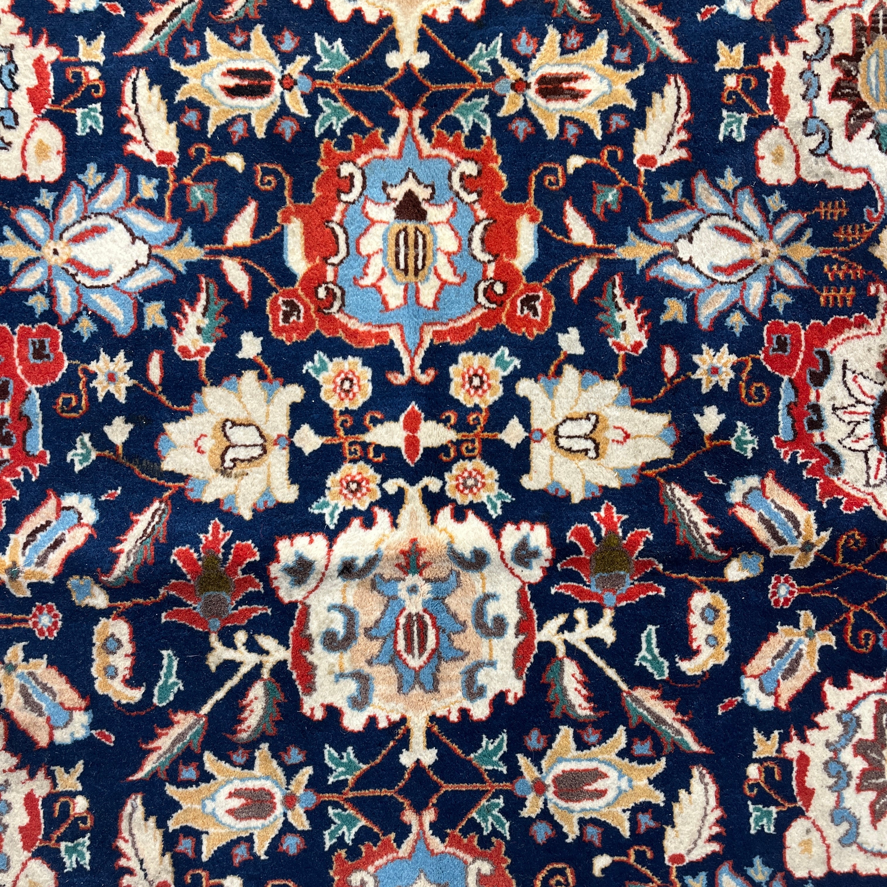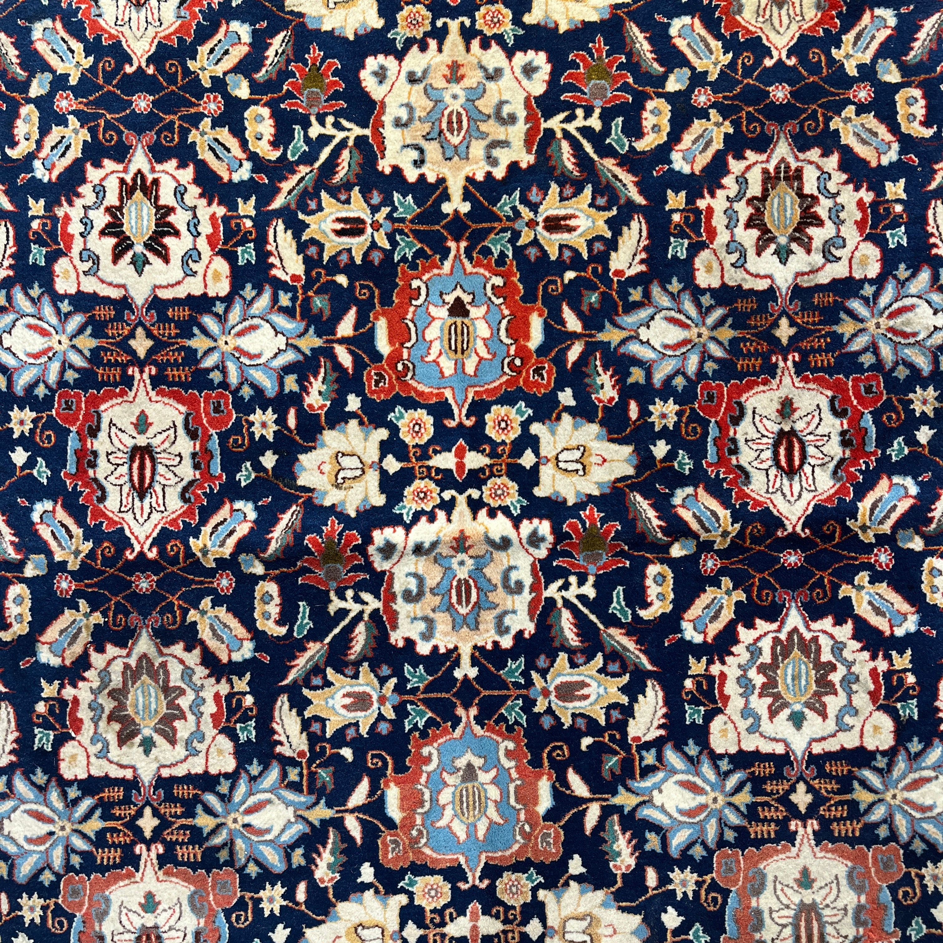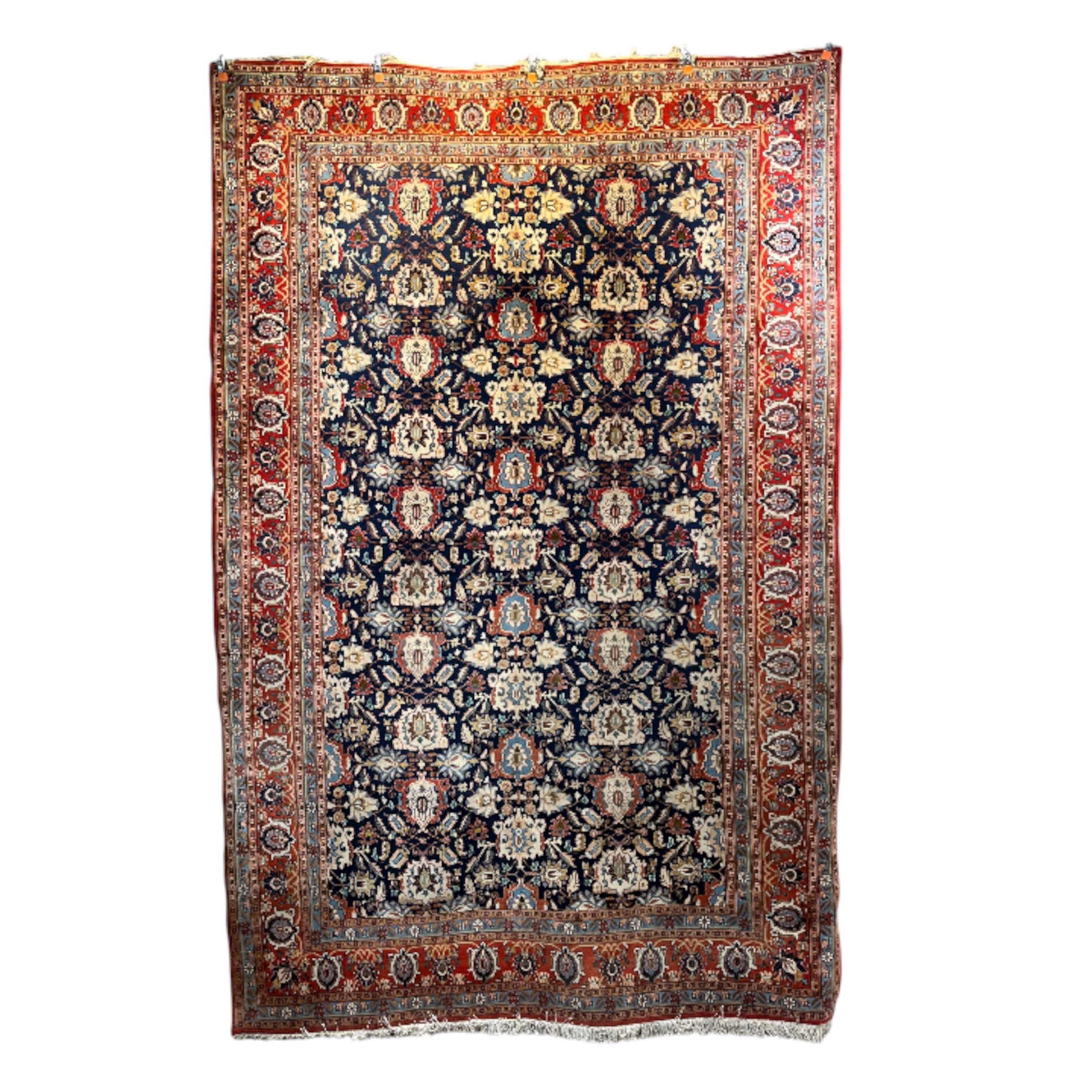Alfombra persa Vehrahine hecha de lana tejida a mano y teñida con tintes naturales de origen vegetal. Estas alfombras son tejidas a mano por pastores de las zonas rurales de Hamadán, en el noroeste de Irán. Se caracterizn por su diseño de patrón repetitivo conocido como mina khani. Este diseño se compone de hileras de flores conectadas por líneas en tonos azules, rojos y crema, con detalles en indigo. Sus cenefas son predominantemente rojas, con patrones florales y geométricos.
