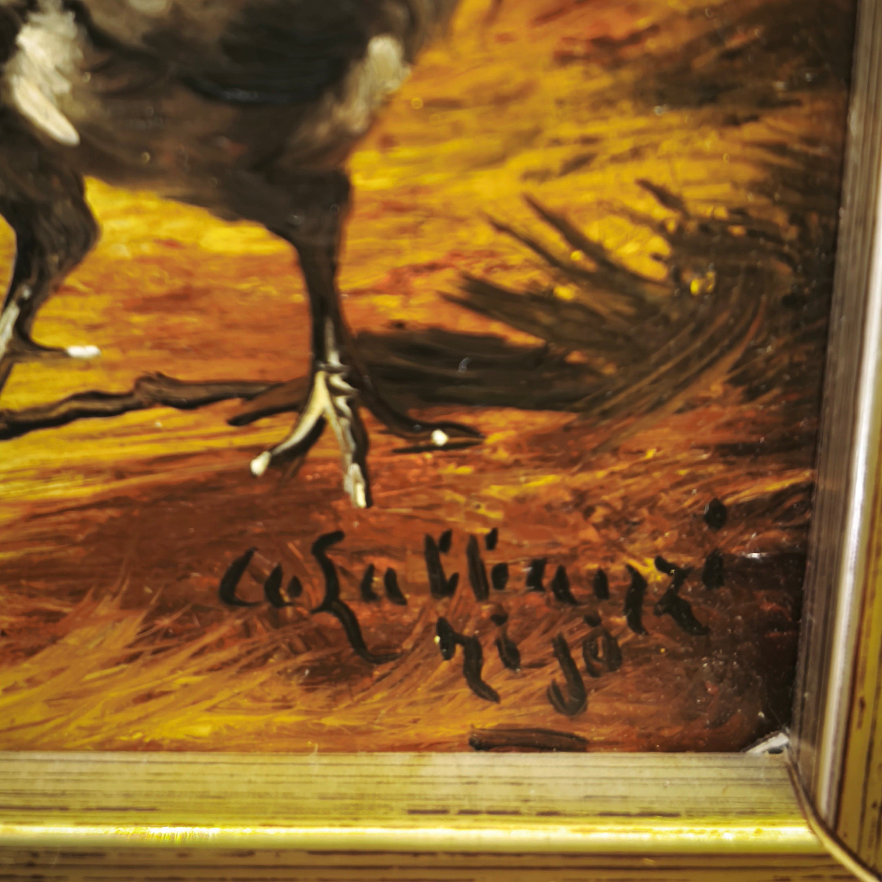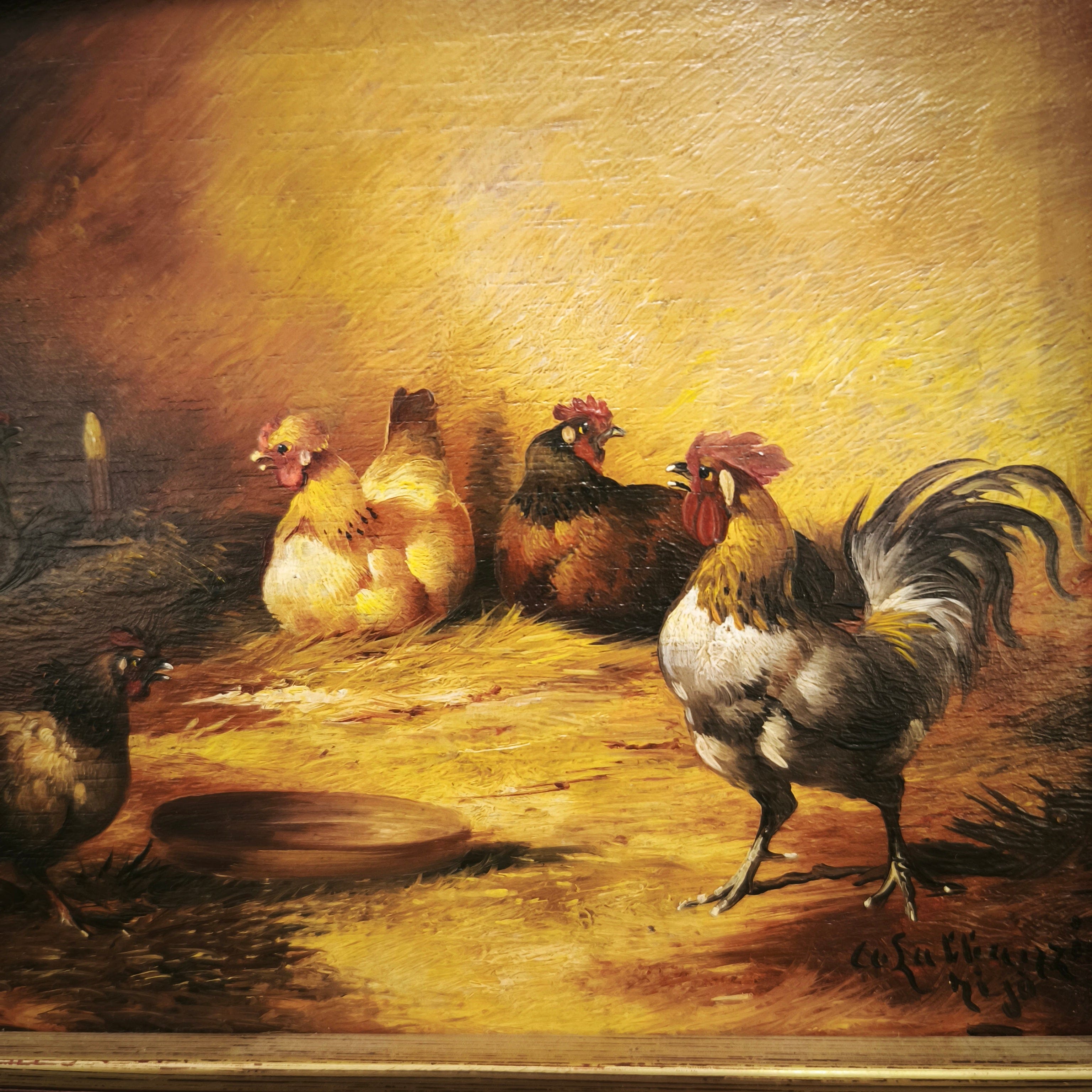 Óleo sobre madela del pintor chileno, nacido en Santiago, Aristodemo Lattanzi Villela (1952). En esta obra vemos unas gallinas reunidas junto a un plato en su gallinero, capturadas con un hermoso trabajo de la luz. La obra, con la temática tan reconocible de este artista, tiene un elegante marco de madera, con bordes tallados en relieves, y terminado en dorado.