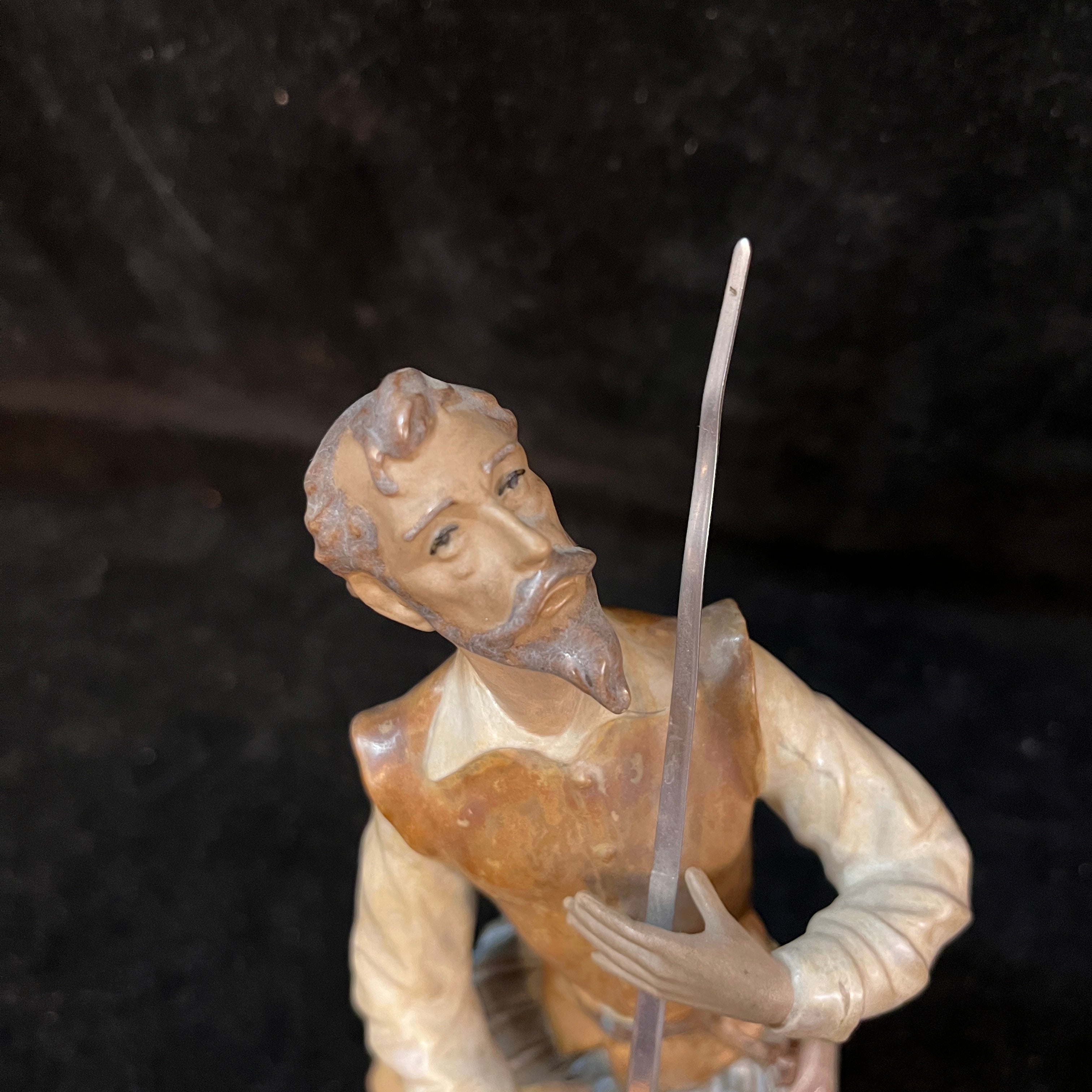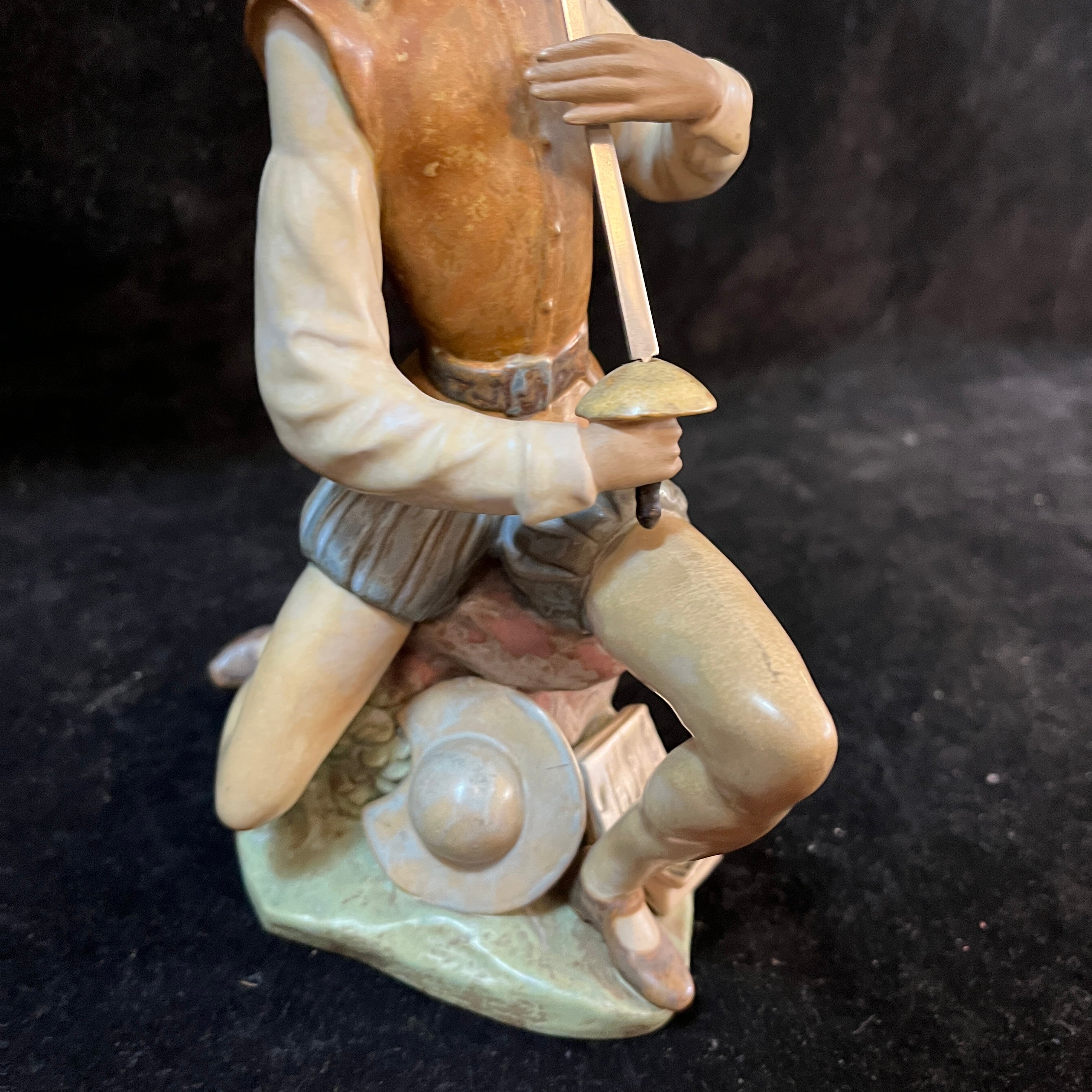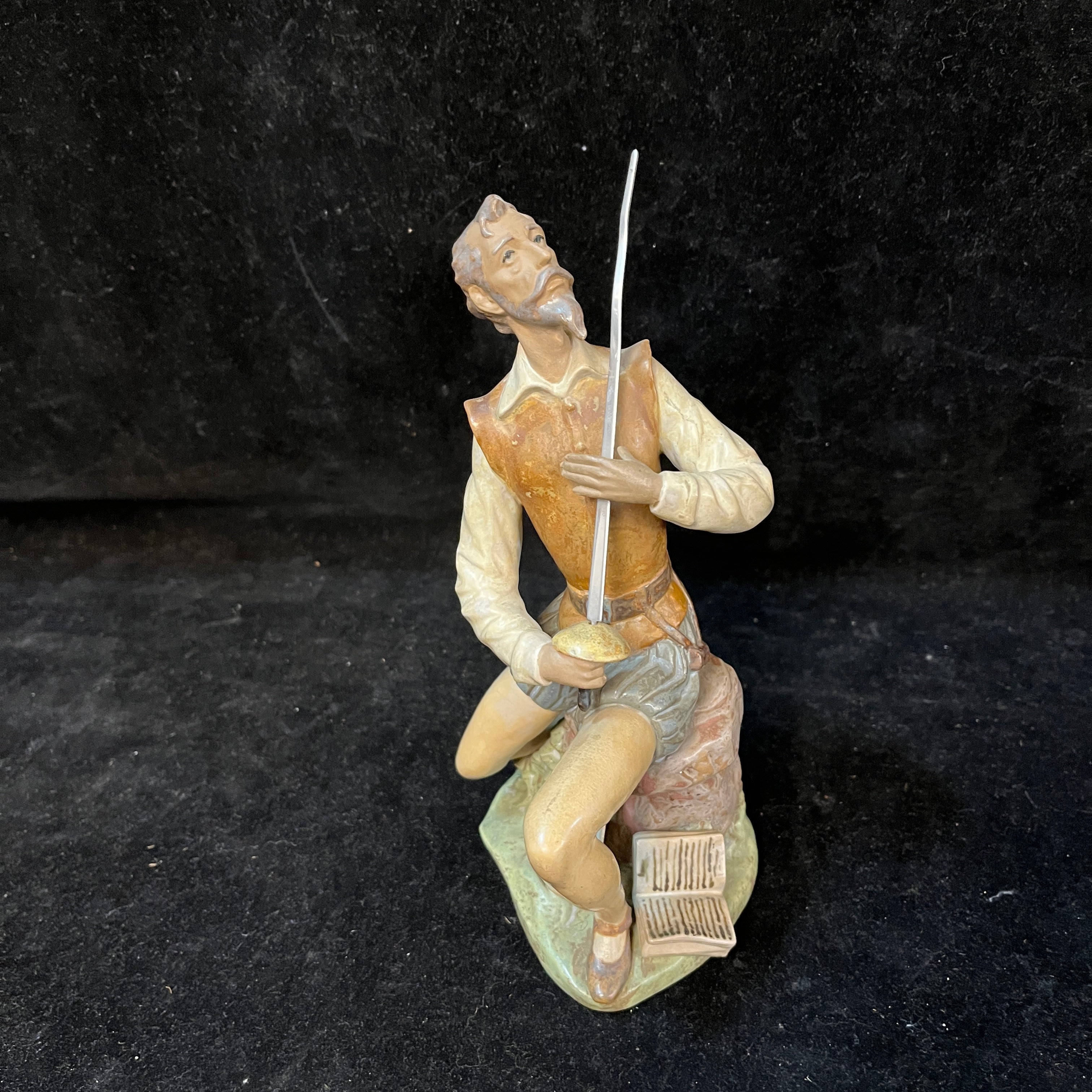 Figura de cerámica gres de la reconocida marca española Lladró, representando al personaje del Quijote sentado sobre una piedra en un gesto pensativo, con su espada, su casco y un libro abierto. La figura, esmaltada en tonos terrosos, contrasta con la pieza de la hoja de su espada, terminada en un metal brillante. La figura tiene el sello Lladró en su base.