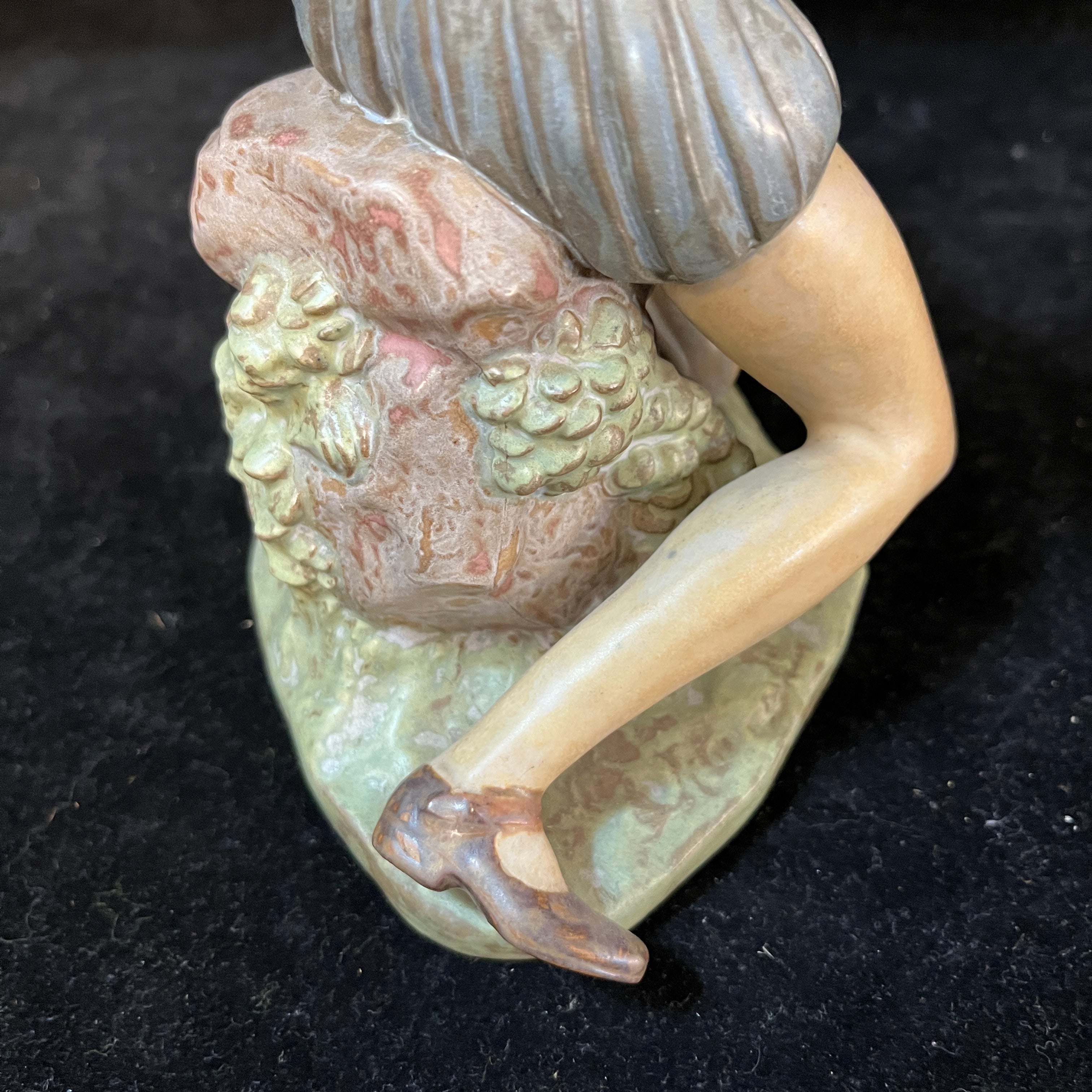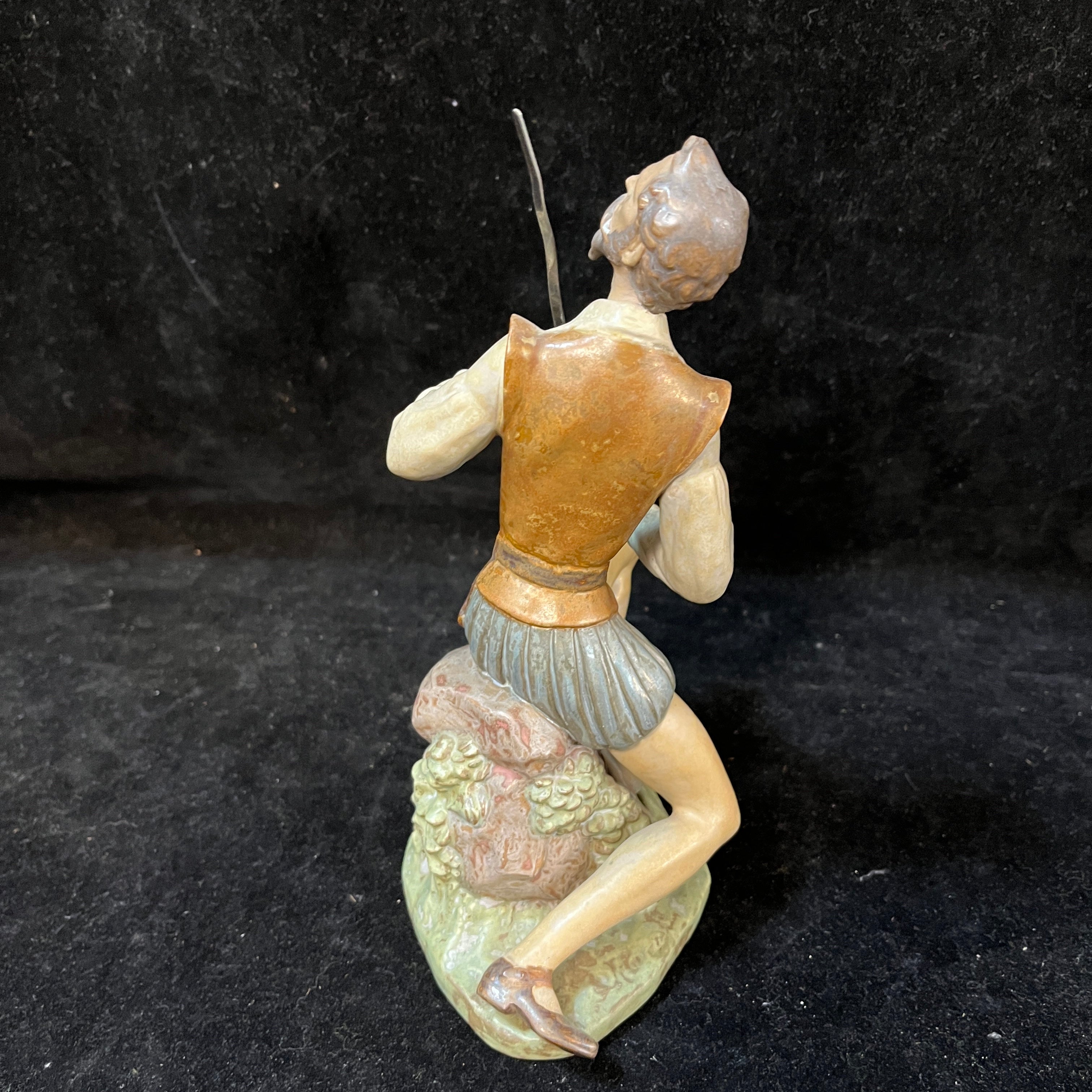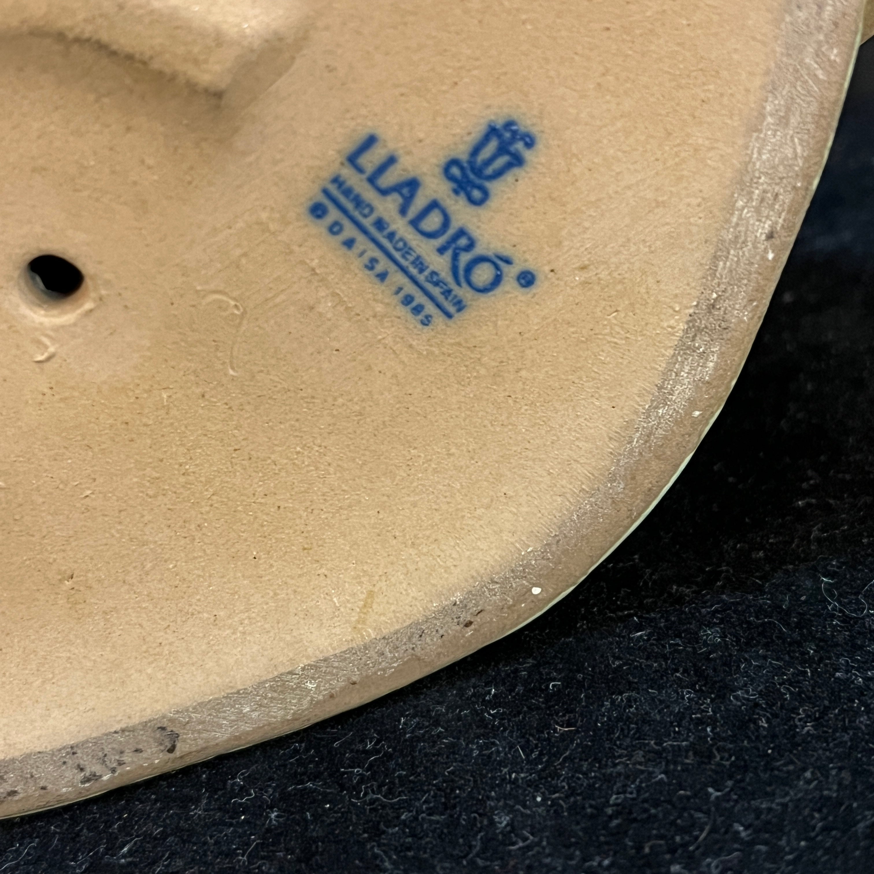 Figura de cerámica gres de la reconocida marca española Lladró, representando al personaje del Quijote sentado sobre una piedra en un gesto pensativo, con su espada, su casco y un libro abierto. La figura, esmaltada en tonos terrosos, contrasta con la pieza de la hoja de su espada, terminada en un metal brillante. La figura tiene el sello Lladró en su base.