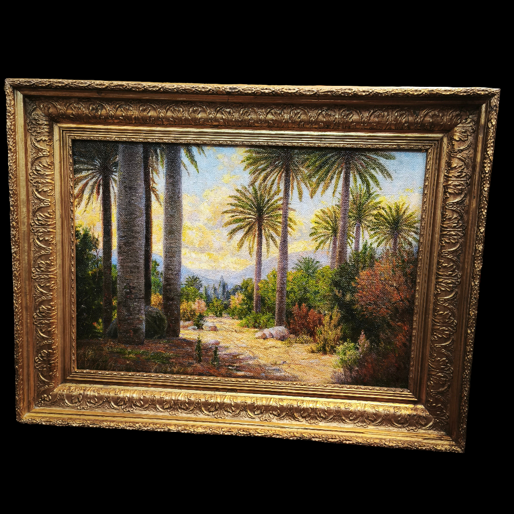 Óleo sobre tela del artista R. Stillfried, representando un cálido paisaje del valle central, con su vegetación distintiva como palmas y diferentes arbustos, con los cerros o posiblemente la cordillera de la costa de fondo. La composición se basa en dos secciones de de vegetación llena de textura en los costados, en tonos verdes, amarillos y rojos, separadas en el centro por un camino de tierra amarillo que abre hacia el horizonte, dándole un punto de fuga y balanceado visualmente la obra. Cabe destacar también que la tela presenta una textura granulosa que realza el material y la da más dimensión a la vegetación del paisaje. La pieza está enmarcada bellamente en madera tallada en relieves y pintada de elegante dorado.