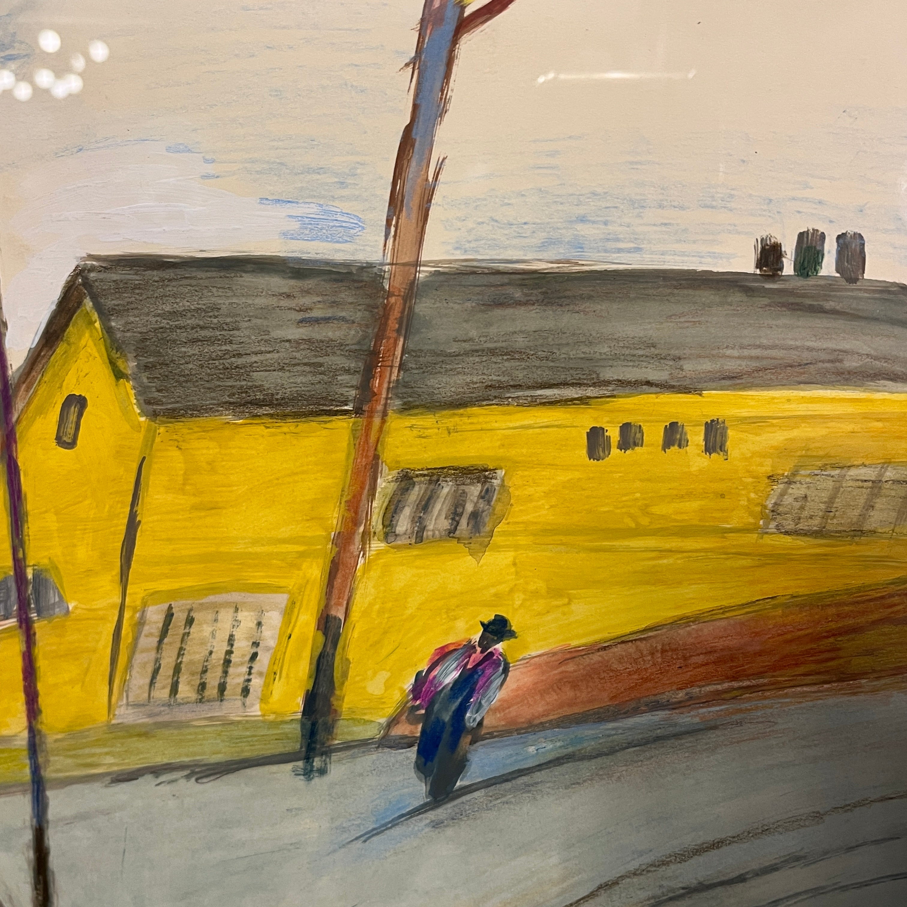 Óleo sobre papel del artista chileno Luis Tejada, representando un paisaje de casas, en donde el color amarillo prepondera en todos los elementos de la composición. El paisaje tiene una deconstrucción de las perspectivas, elemento reconocible en la obra del artista, dándole un aspecto geométrico al paisaje. Un elemento particular que resalta en la composición es un personaje entrando a una de estas casas a través de una puerta roja, que contrasta con el paisaje. La obra está enmarcada en madera de diseño sobrio, terminada en pintura plateada.