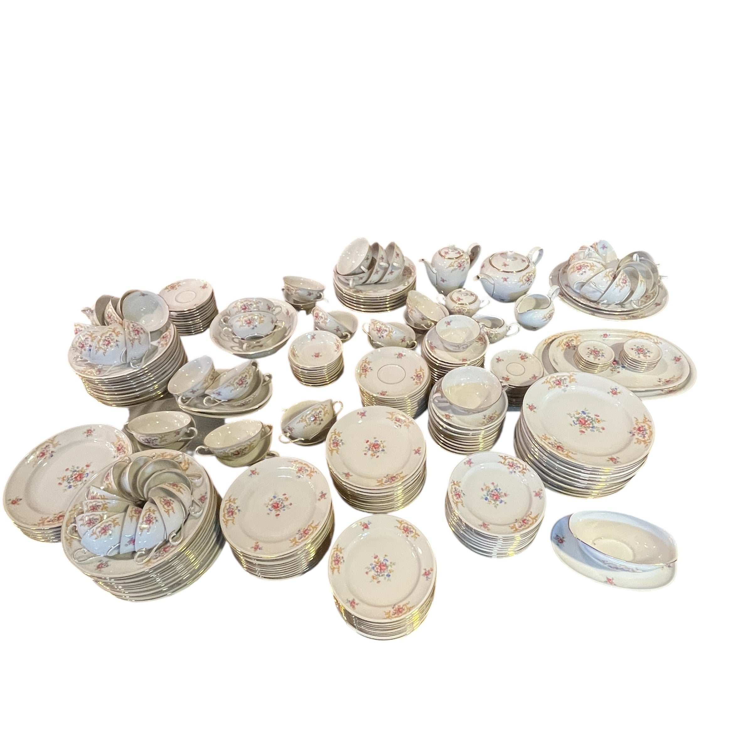 Gran juego de porcelana alemana Hutschenreuter, con un delicado diseño de flores y guirnaldas doradas, con terminaciones en dorado en sus asas y bordes. El juego incluye el juego de mesa, juego de té, café y diversas piezas de servir.