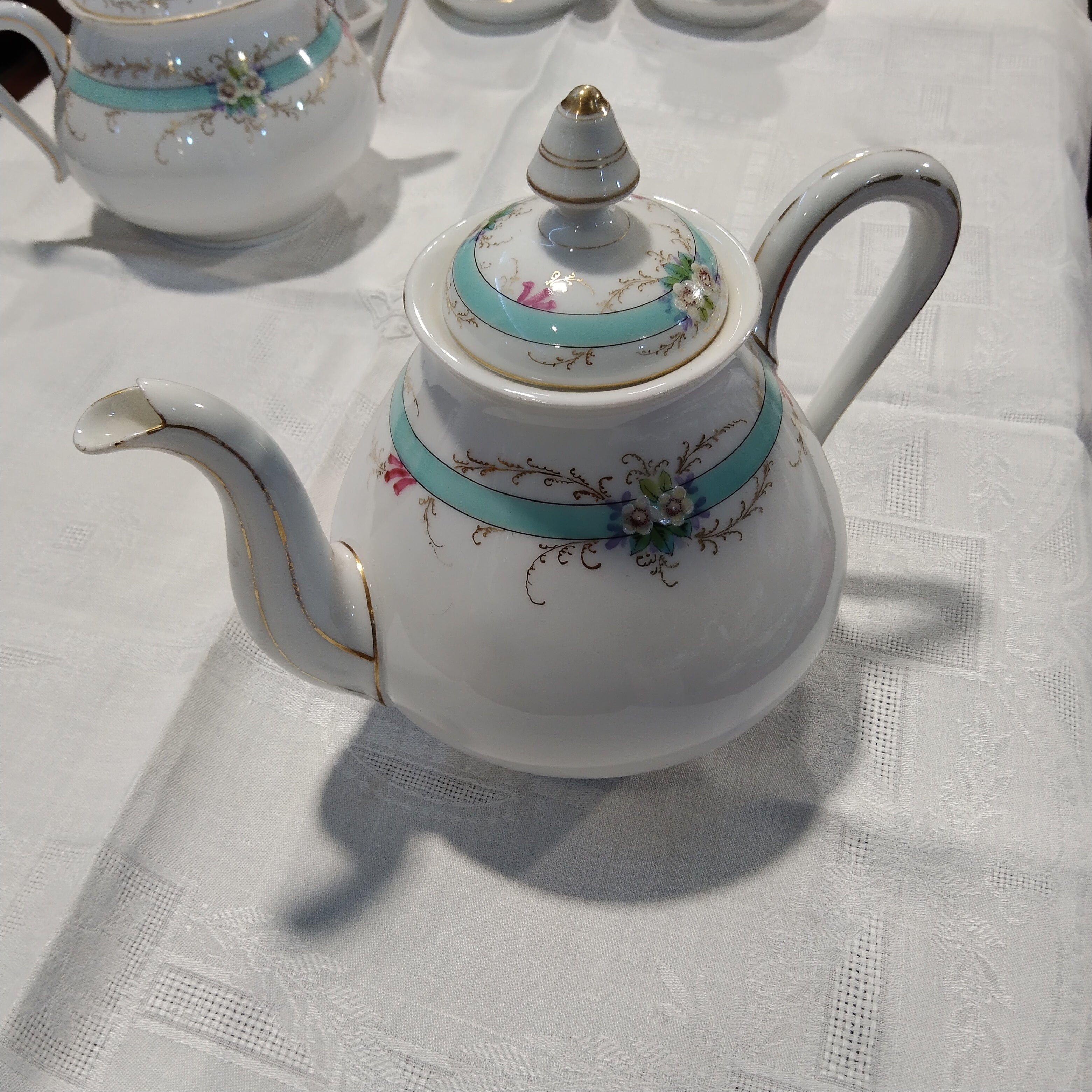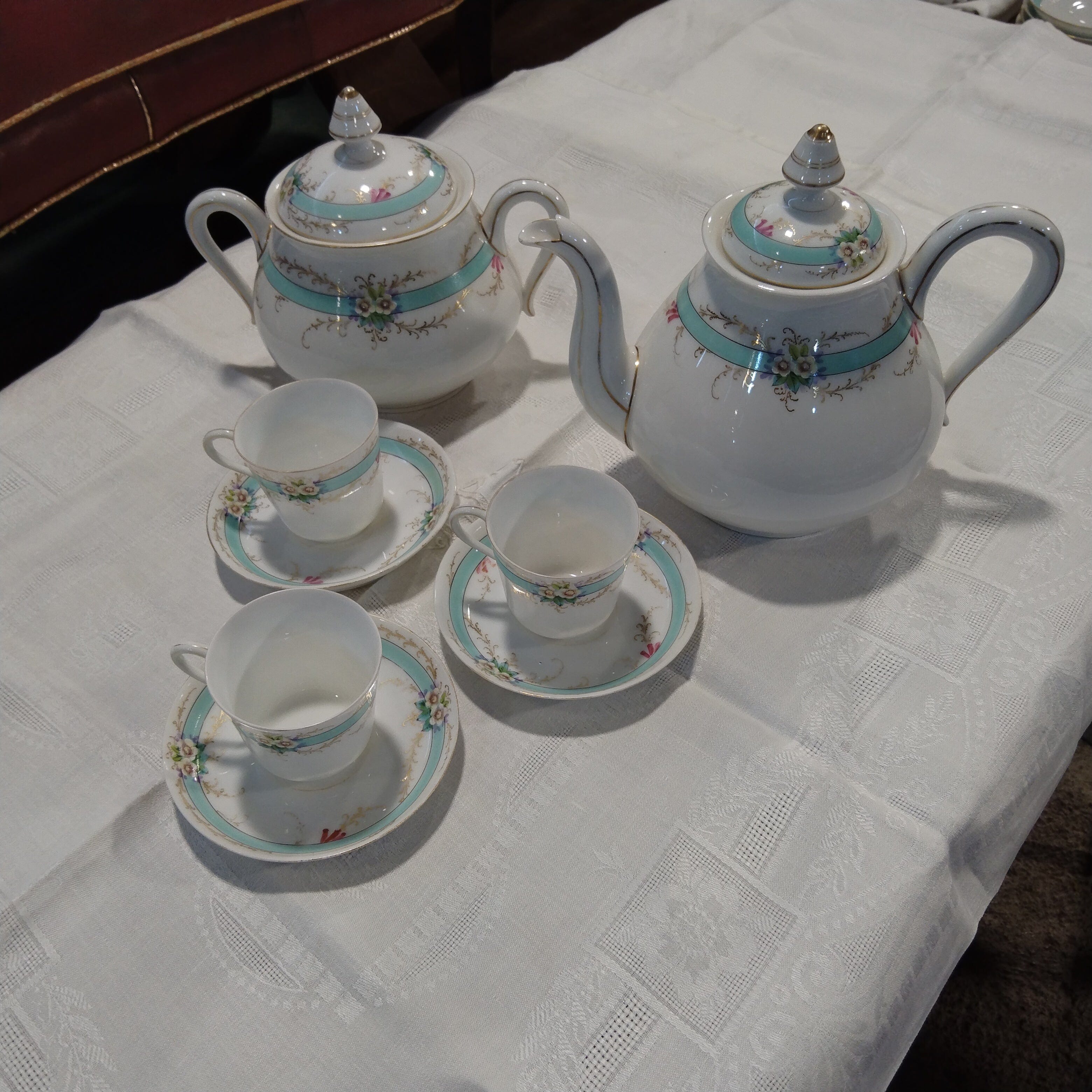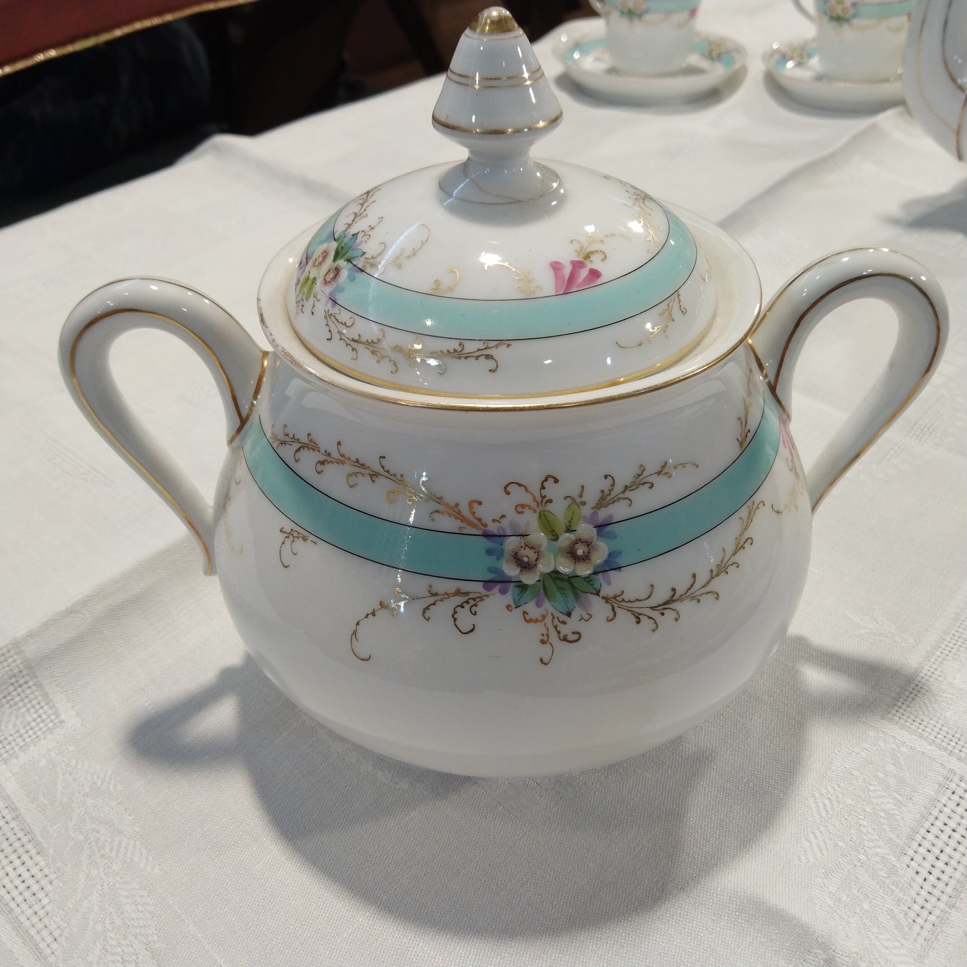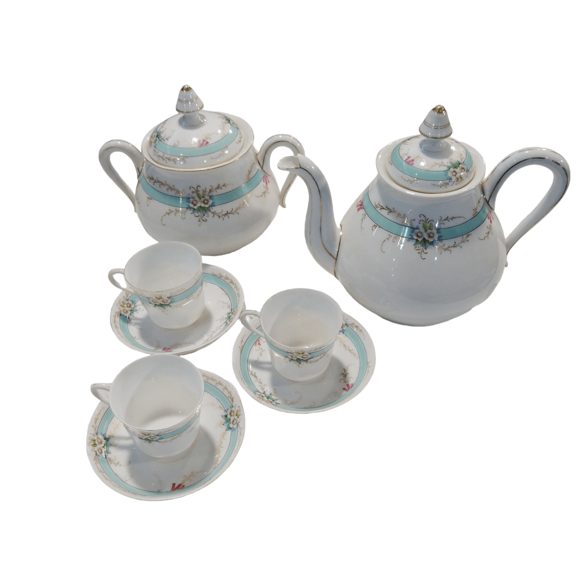 Juego de té para tres porcelana francesa cinto celeste y flores