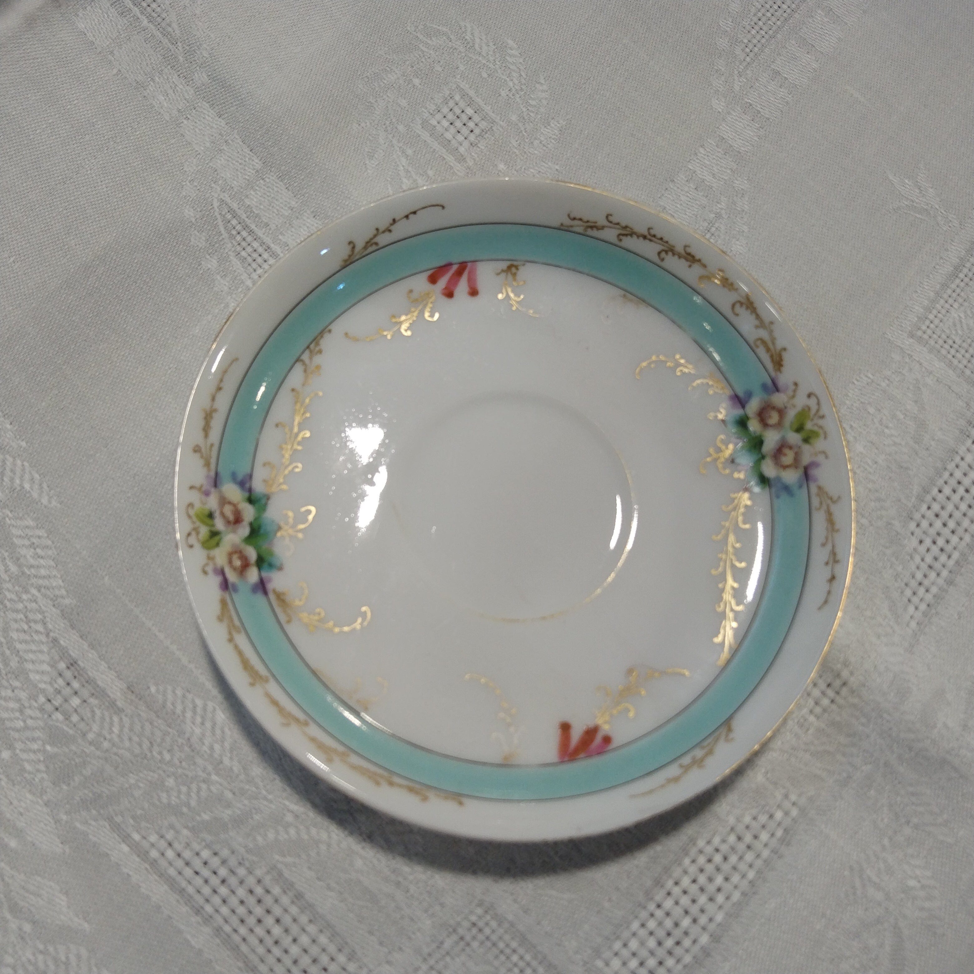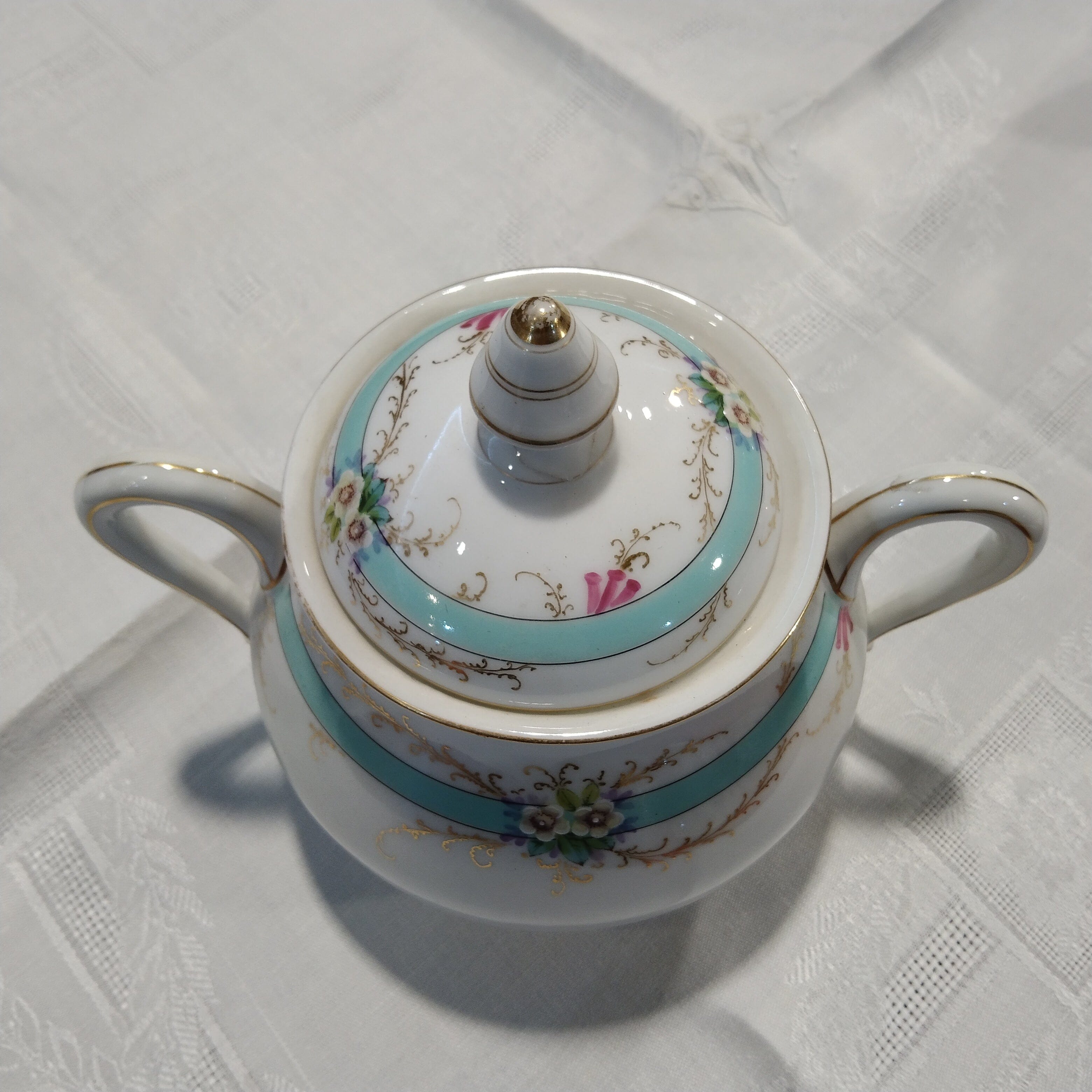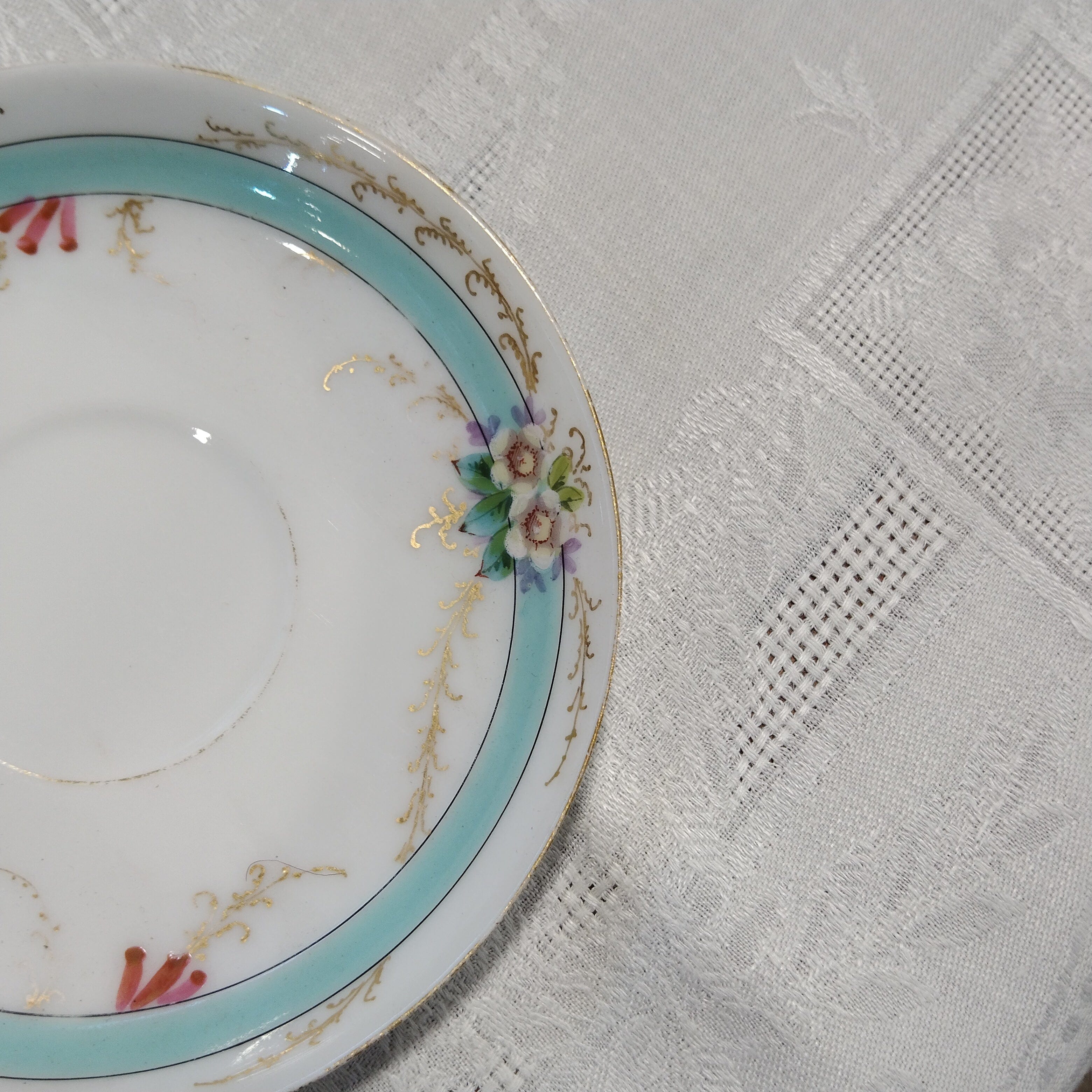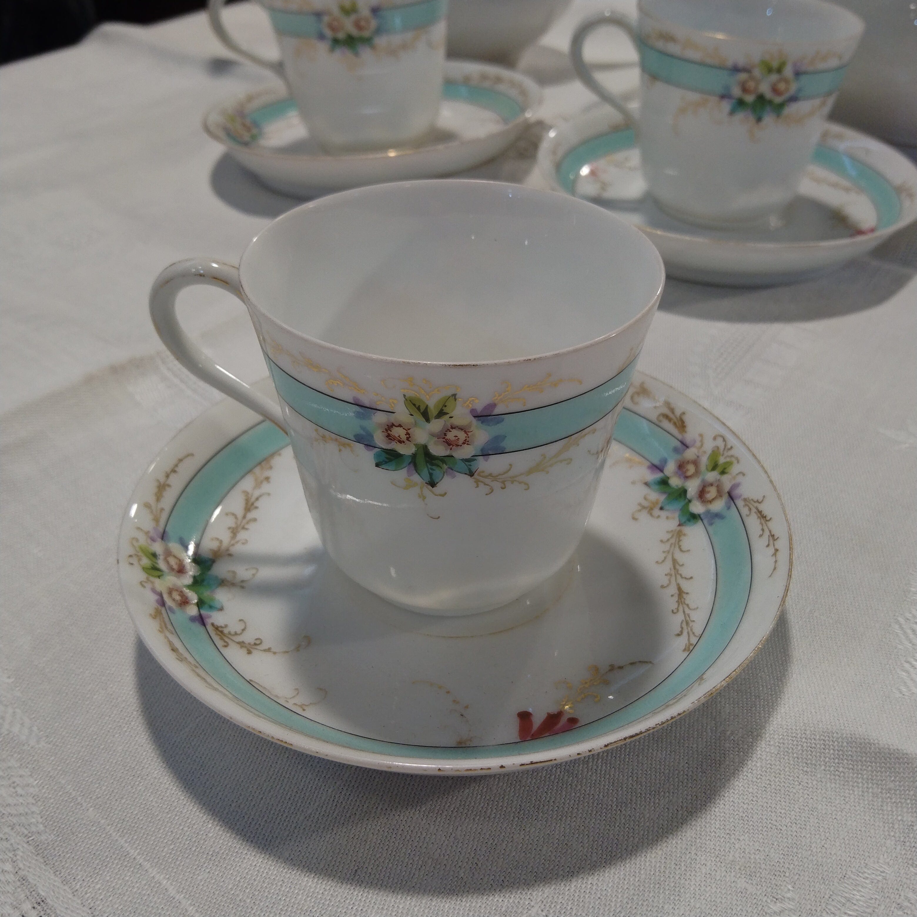 Juego de té para tres porcelana francesa cinto celeste y flores