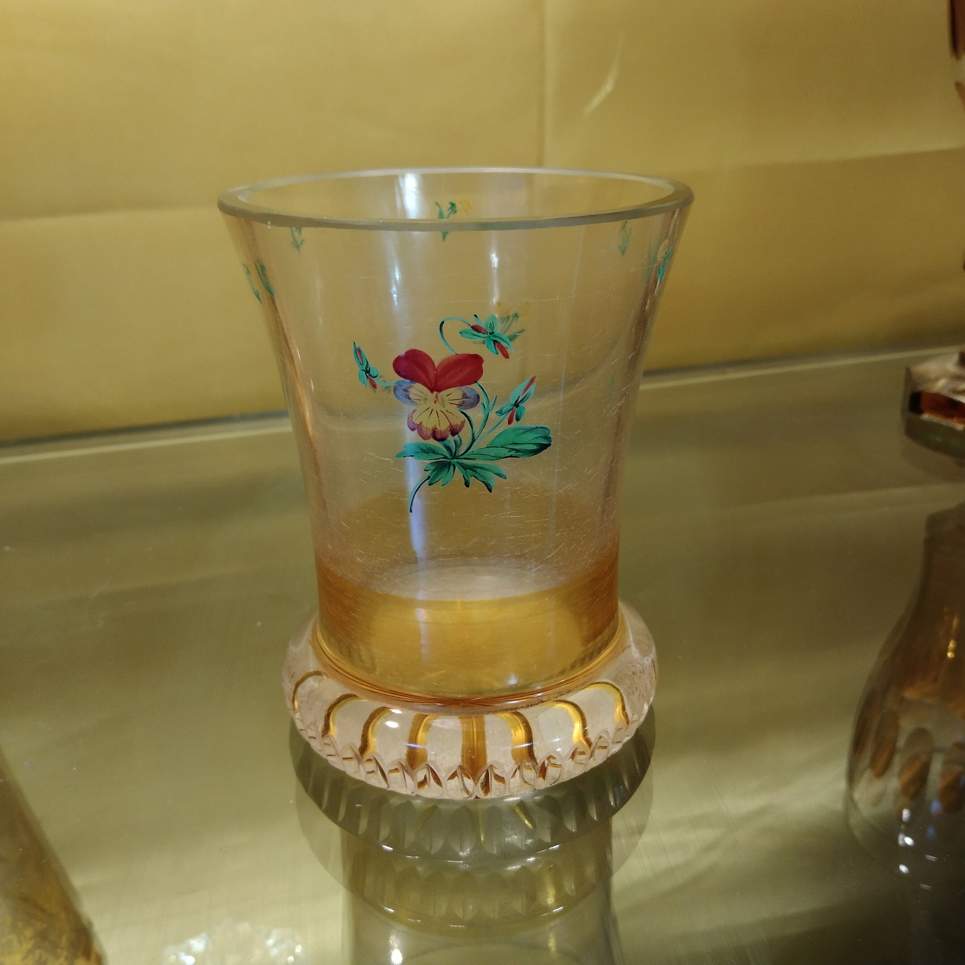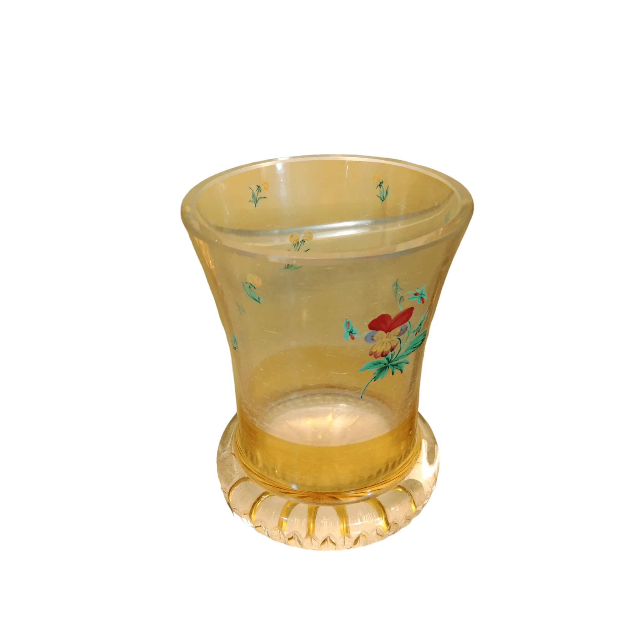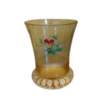 Vaso de cristal tallado amarillo y flores pintadas