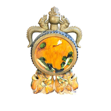 Bella estatua Tang San Cai, también llamada cerámica vidriada tricolor y una joya del arte chino antiguo, es un tipo de cerámica vidriada hecha a mano de exquisita artesanía creada en la Dinastía del Norte y del Sur (386-589) hace unos 1.400 años. Durante la Dinastía Tang (618-907), la producción de Tang San Cai alcanzó su punto álgido, lo que en parte explica que la cerámica recibiera el nombre de Tang San Cai.
