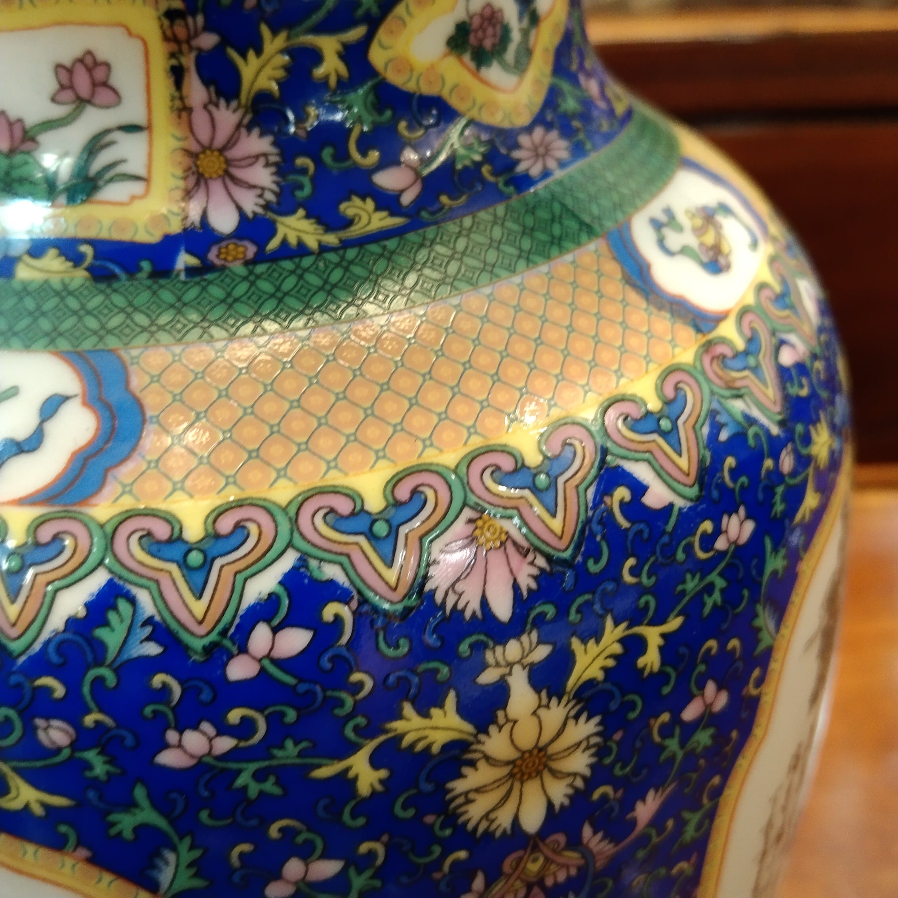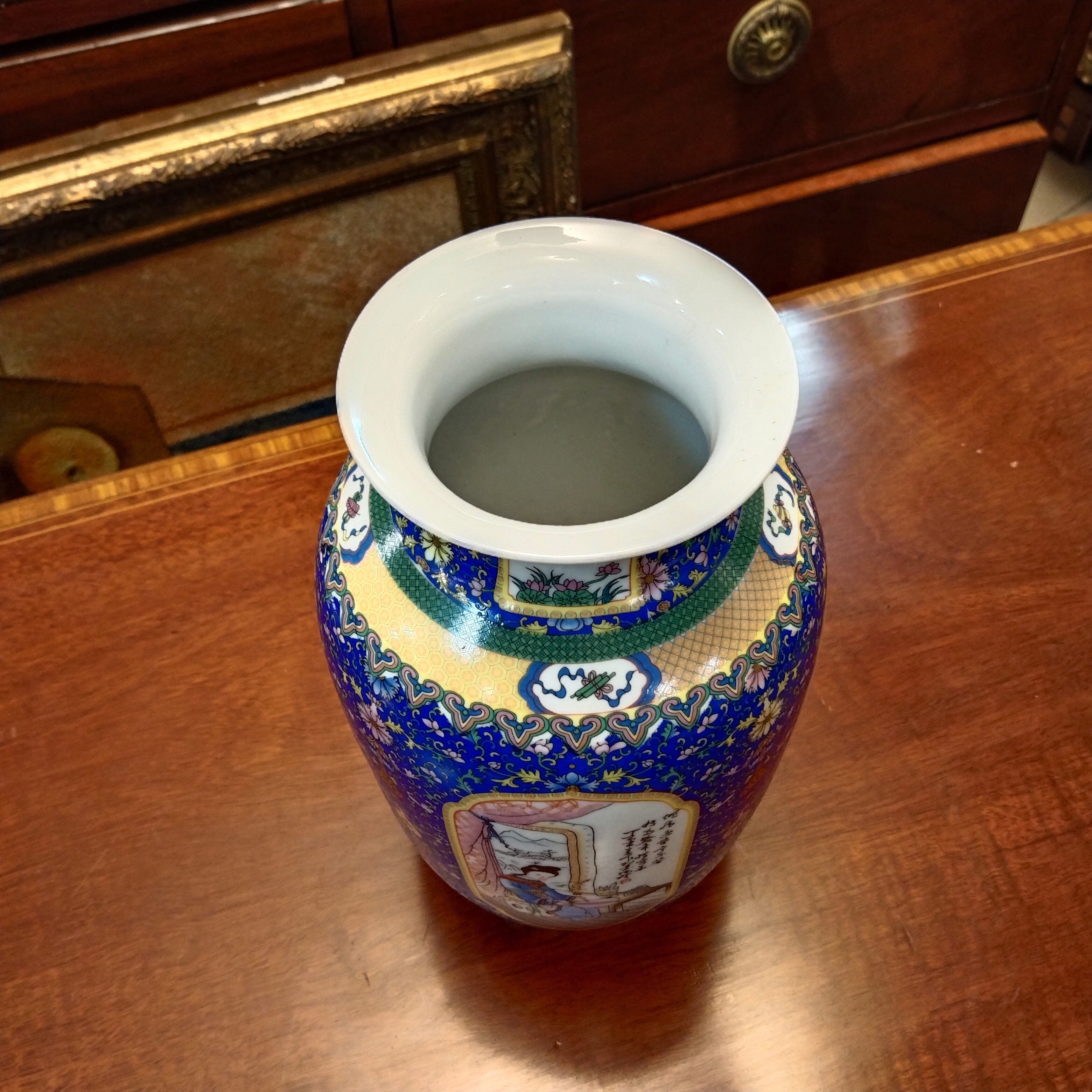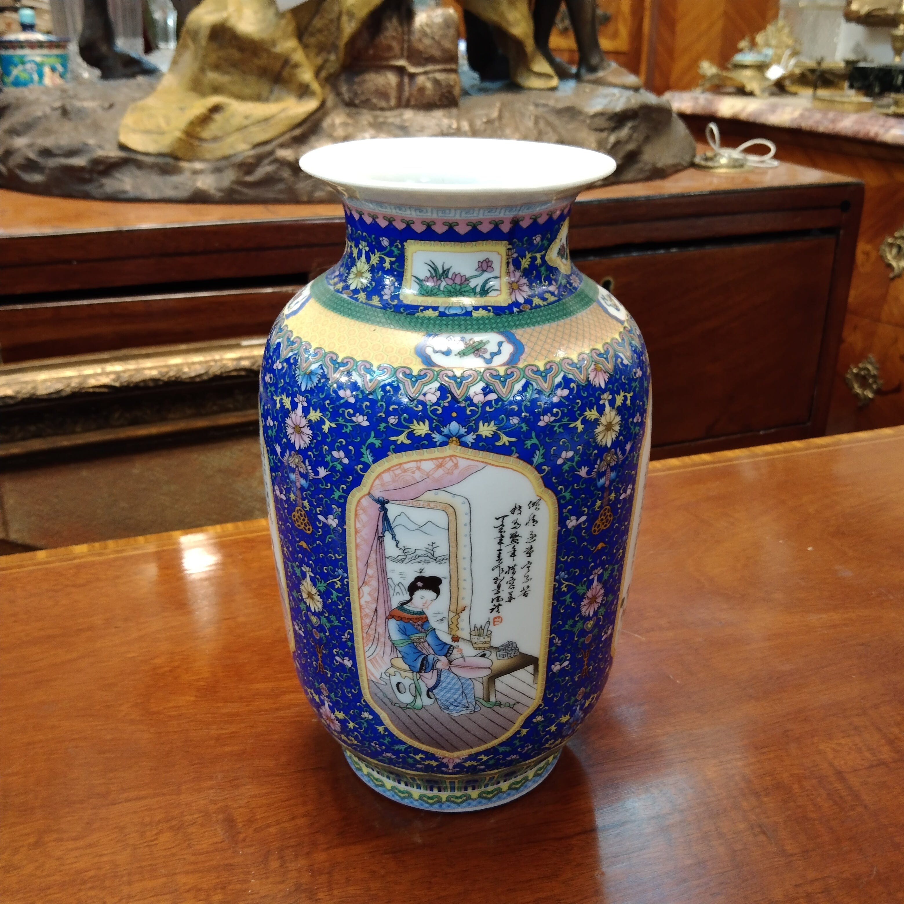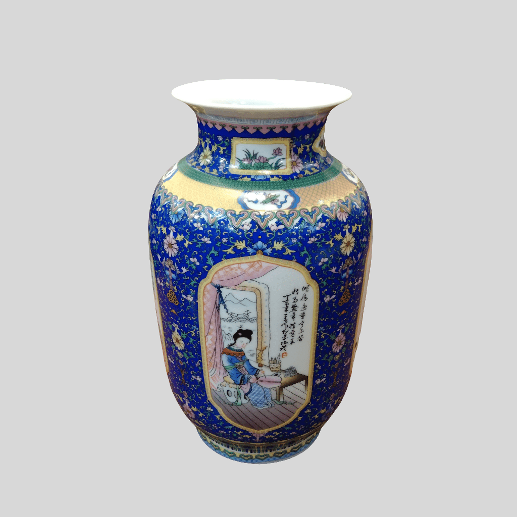 Bellísimo jarrón de porcelana china, esmaltado en azul y con diseños hechos a mano, representando escenas de mujeres realizando distintos oficios, enmarcadas por un detallado patrón floral.