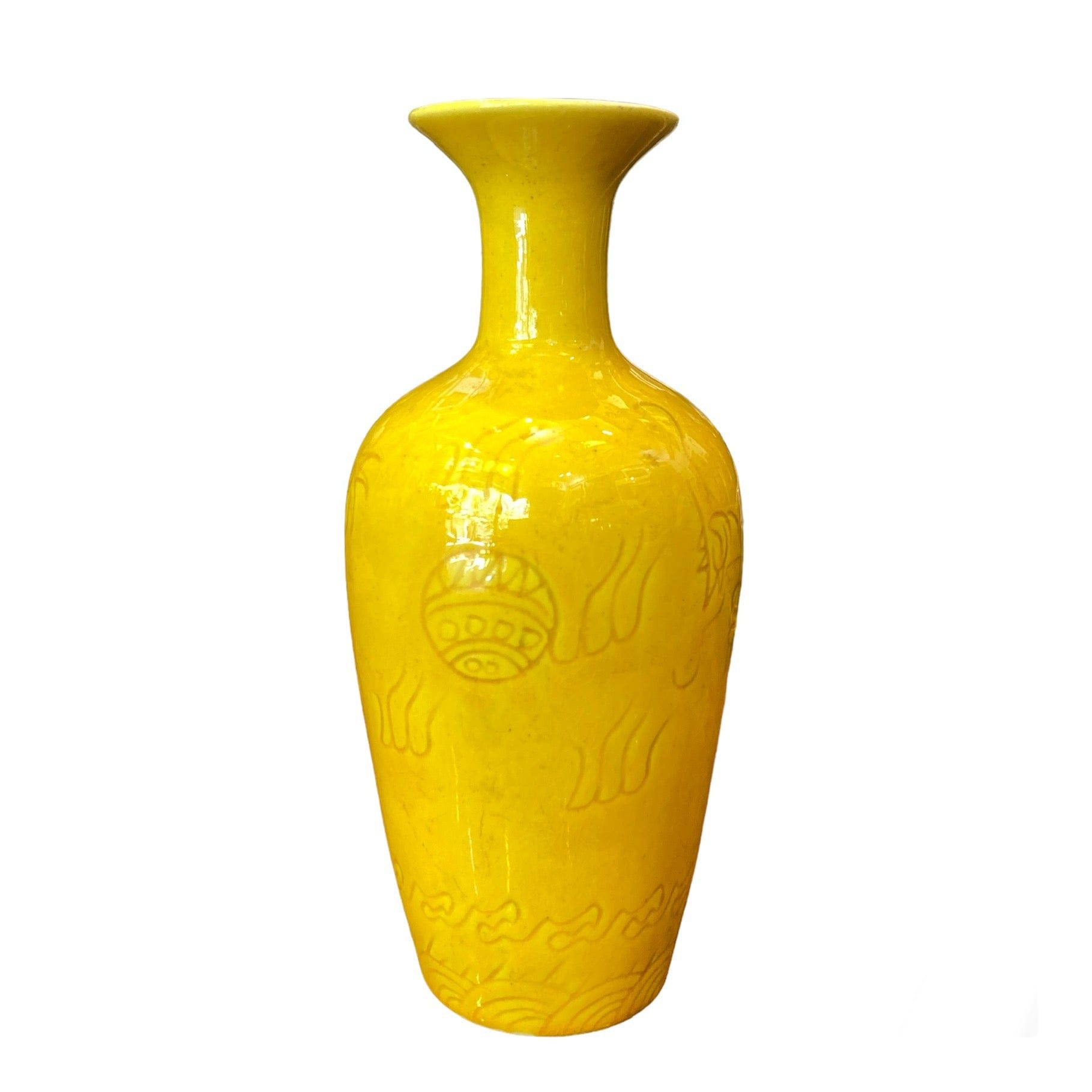 Bello jarroncito de porcelana amarilla, con sutil diseño tallado en su contorno.