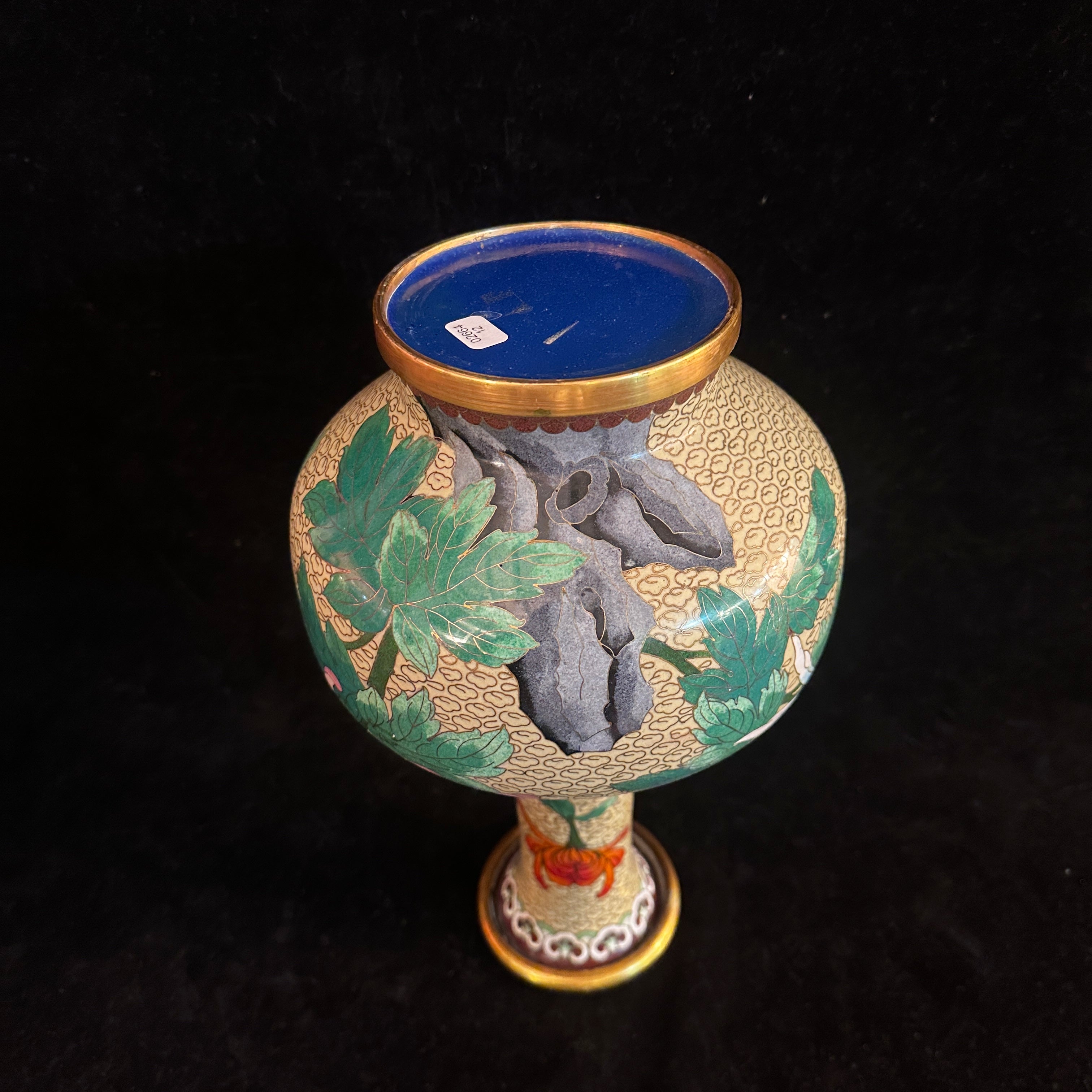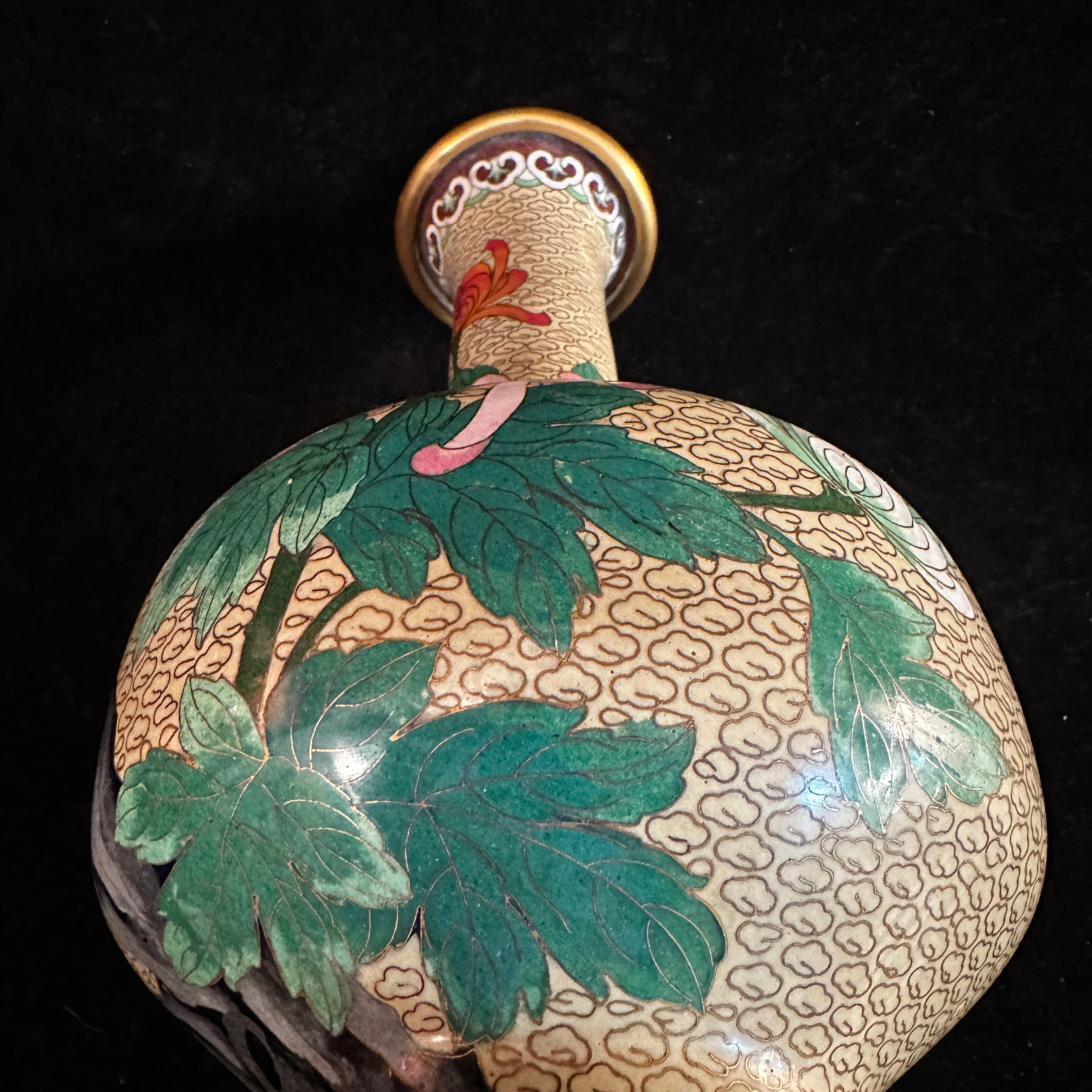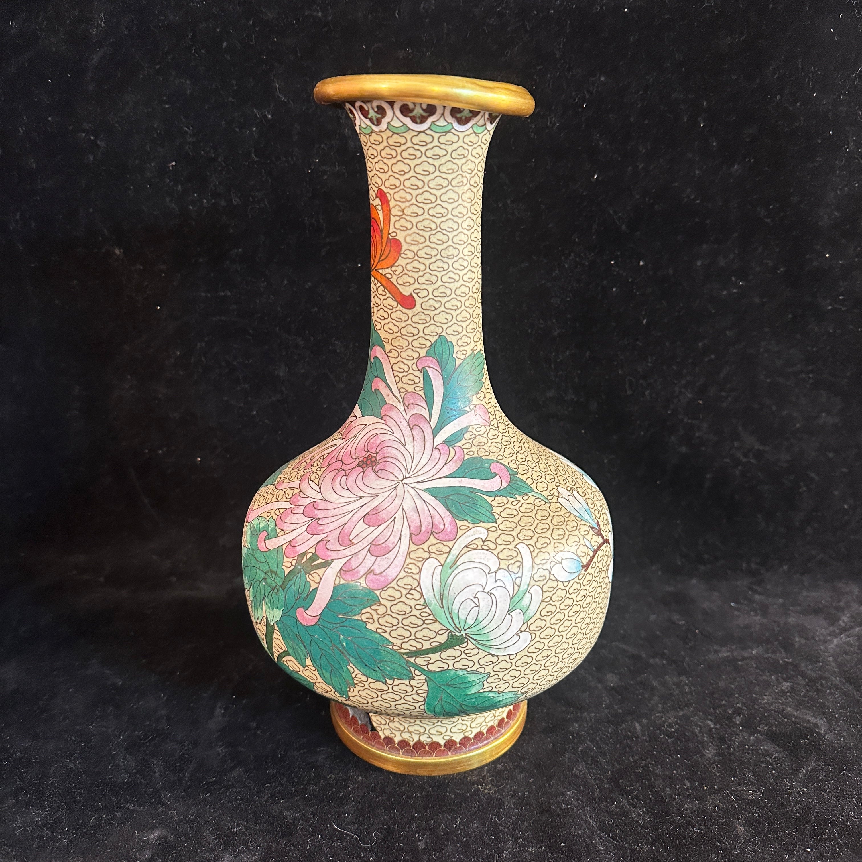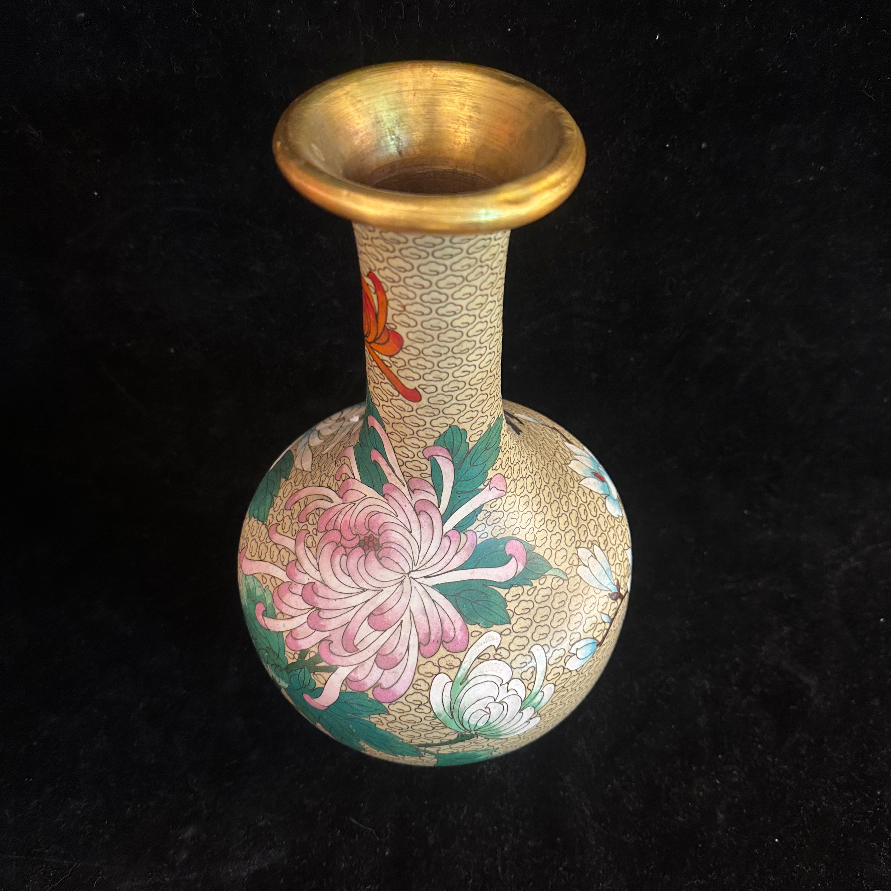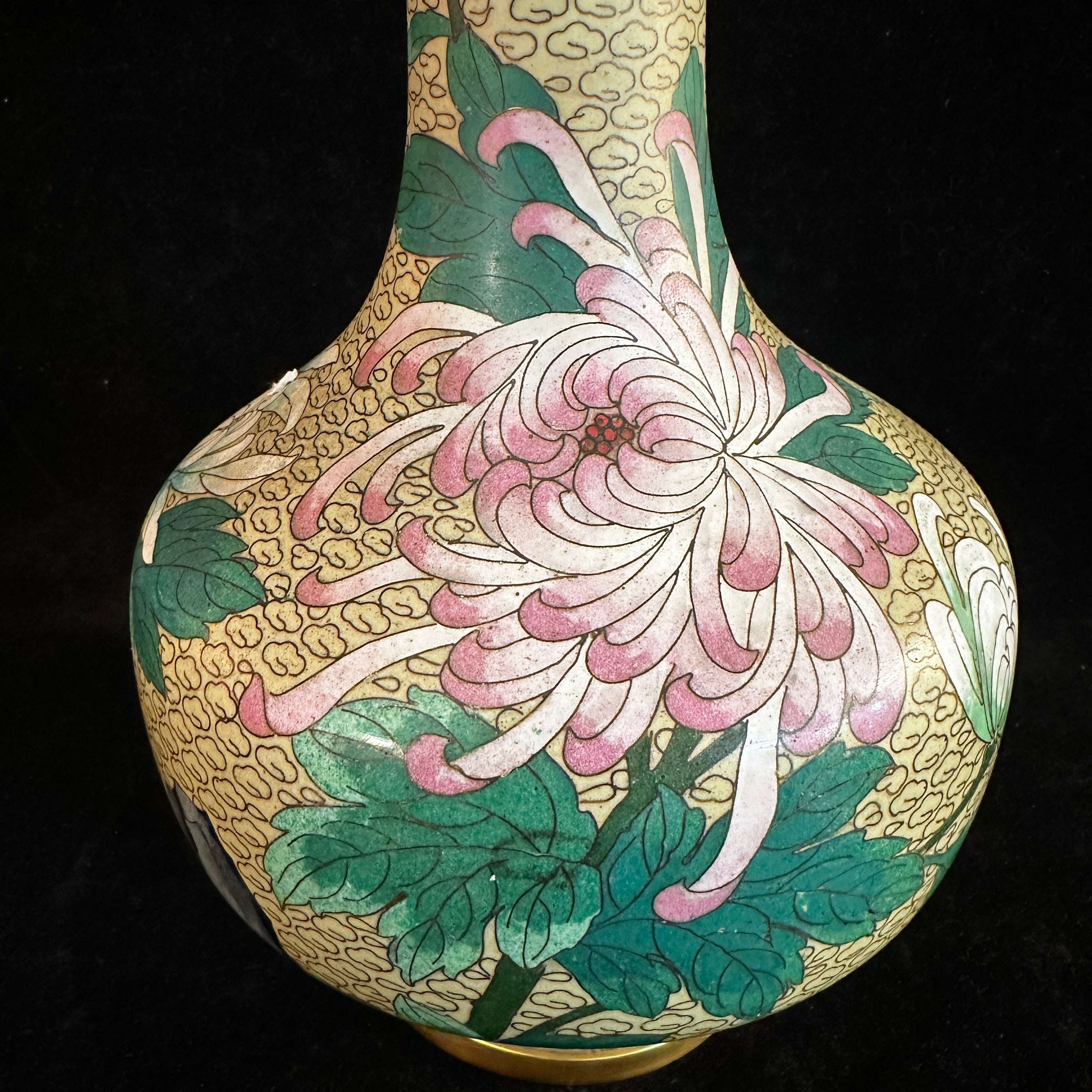 Jarrón chino cloissone en bronce esmaltado amarillo y flores