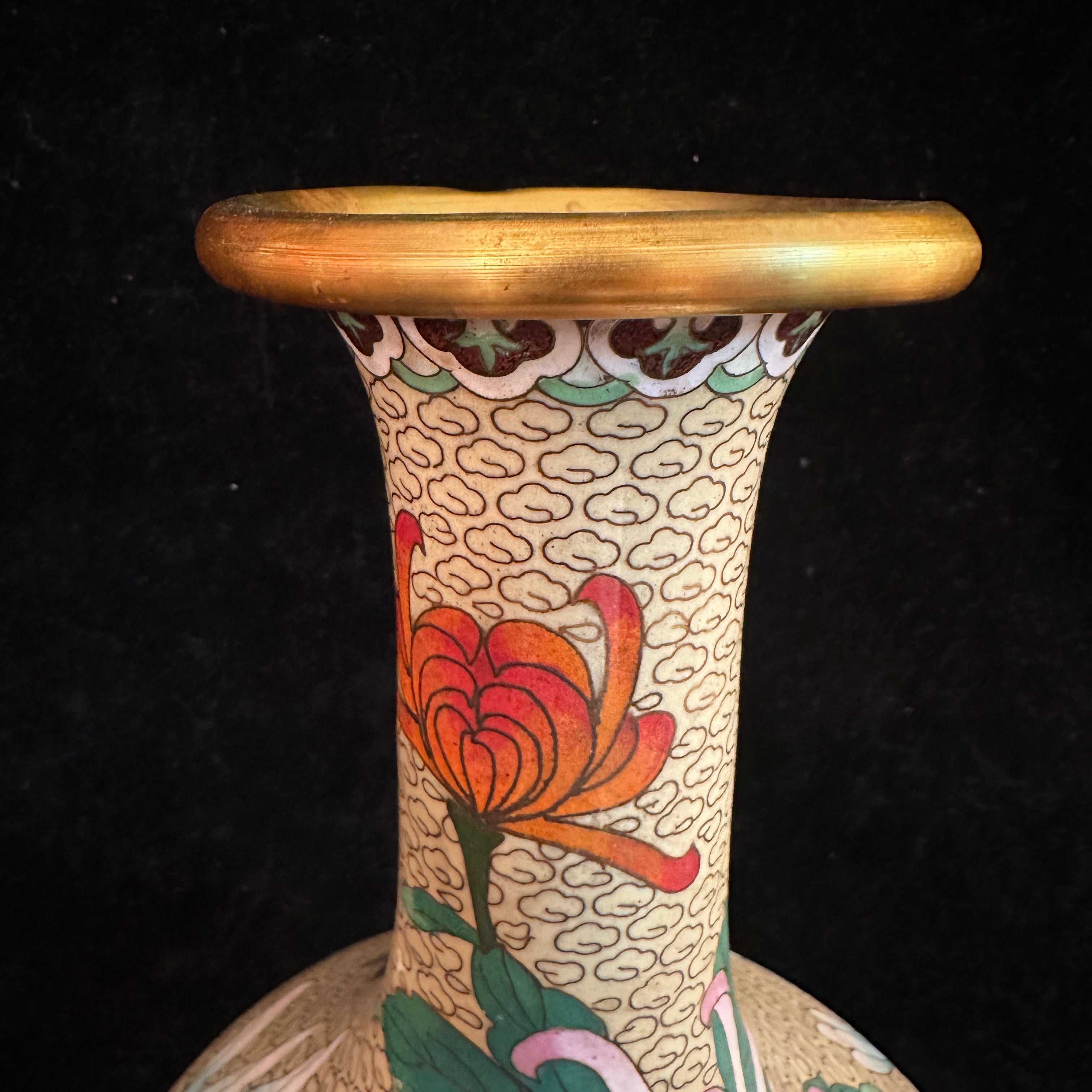 Bellísimo jarrón de bronce cloissoné, de origen chino, con espectacular esmaltado en amarillo con un patrón de nubes negras, y decorados de aves, flores y árboles. La pieza tiene el borde terminado en dorado en su cuello y base, además de una base de color azul.