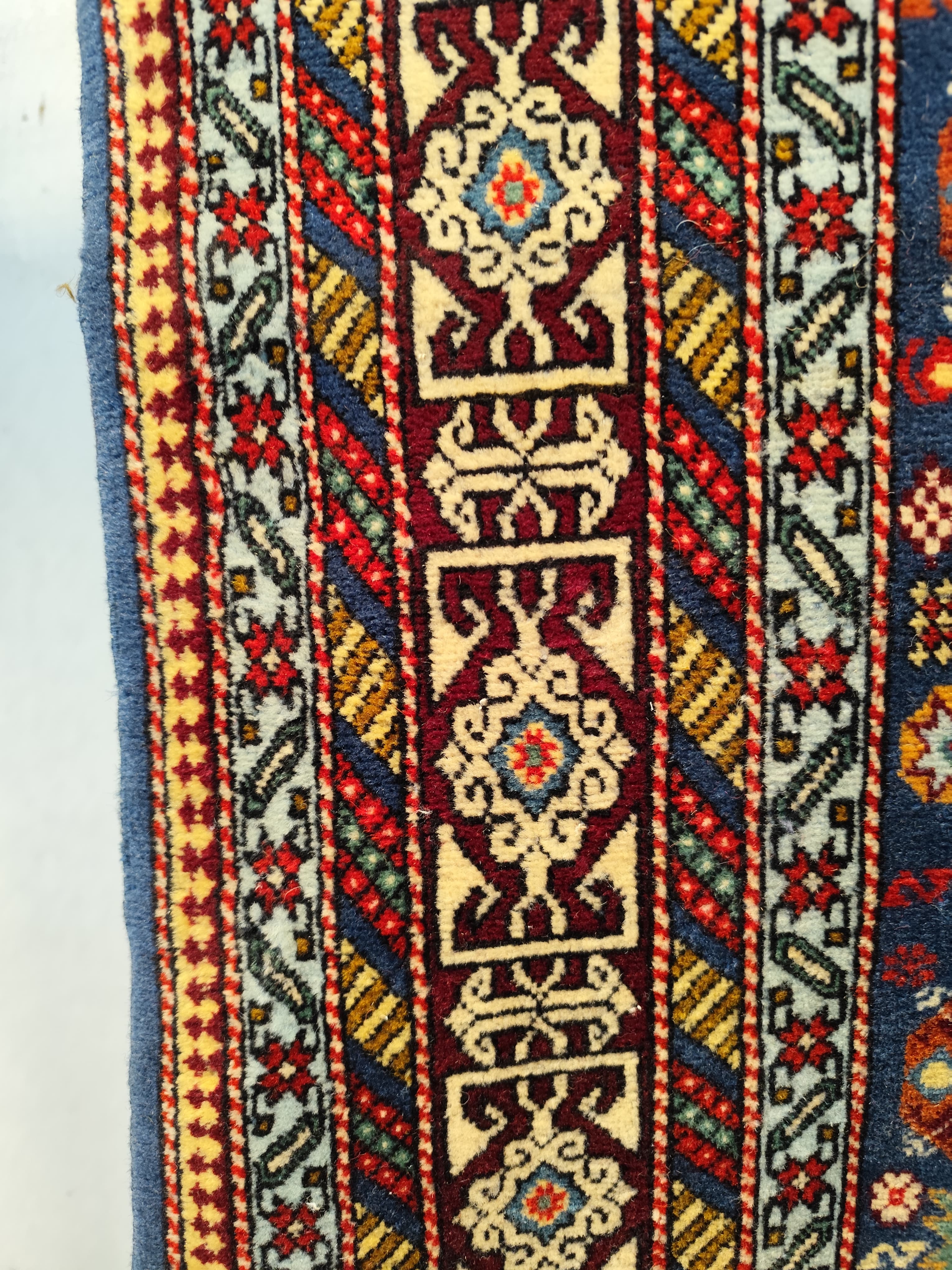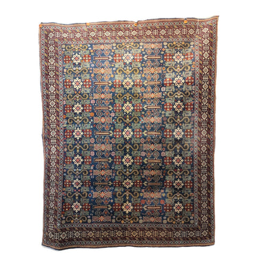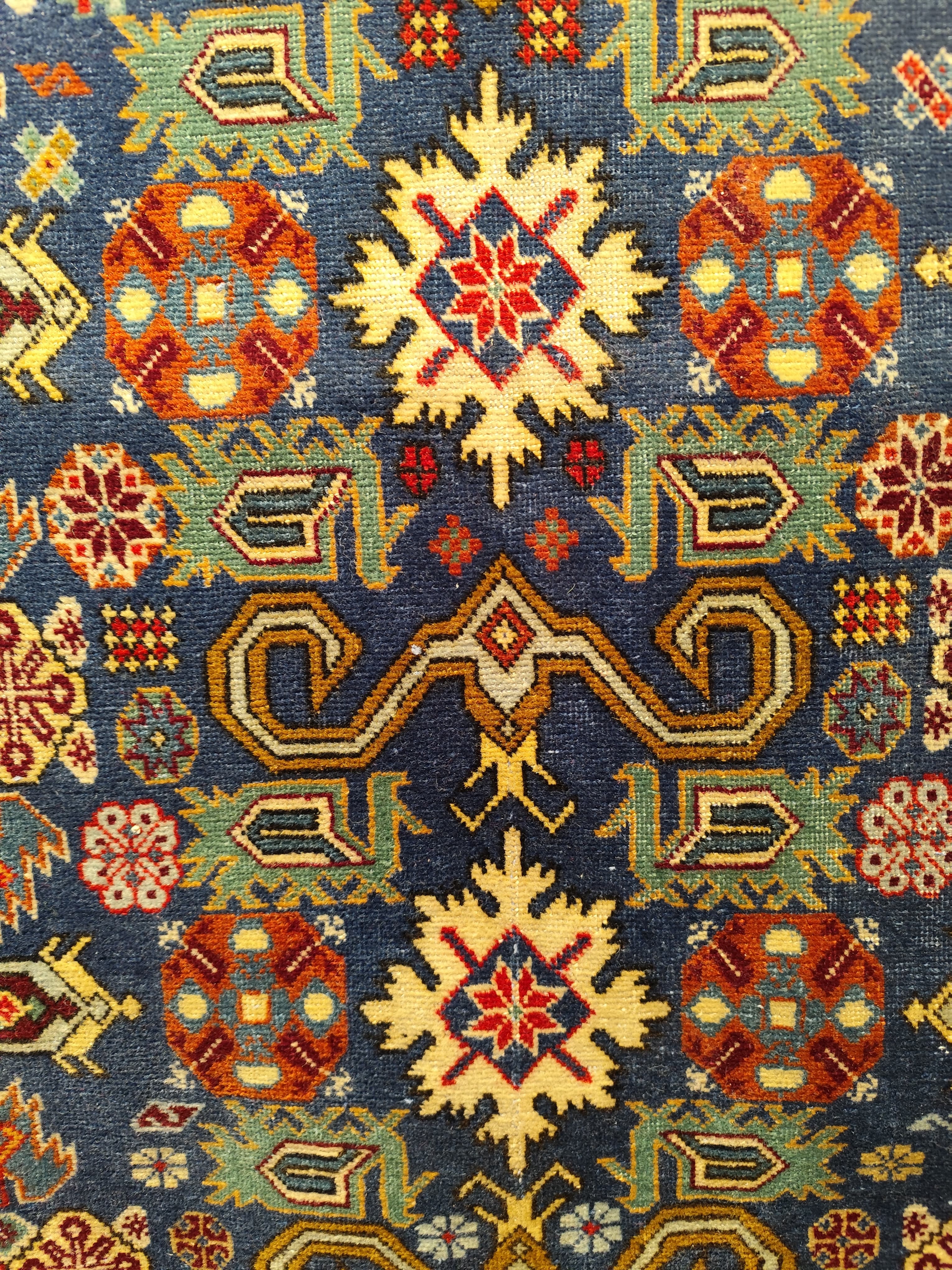 Preciosa alfombra Derbend, de origen caucasiano, hecha de lana tejida a mano, en distintivos diseños geométricos, centrados alrededor de medallones o cartuchos abstractos, en tonos rojos, azules y verdes, con bordes blancos. La composición se completa con un borde de diseños repetidos, en el que destaca el blanco, haciendo contrapunto con el diseño total.