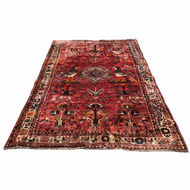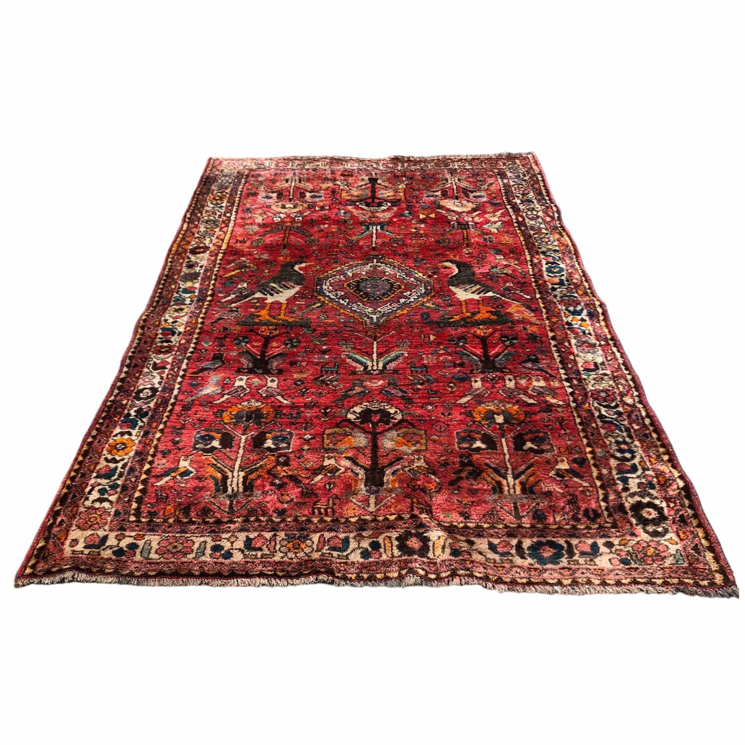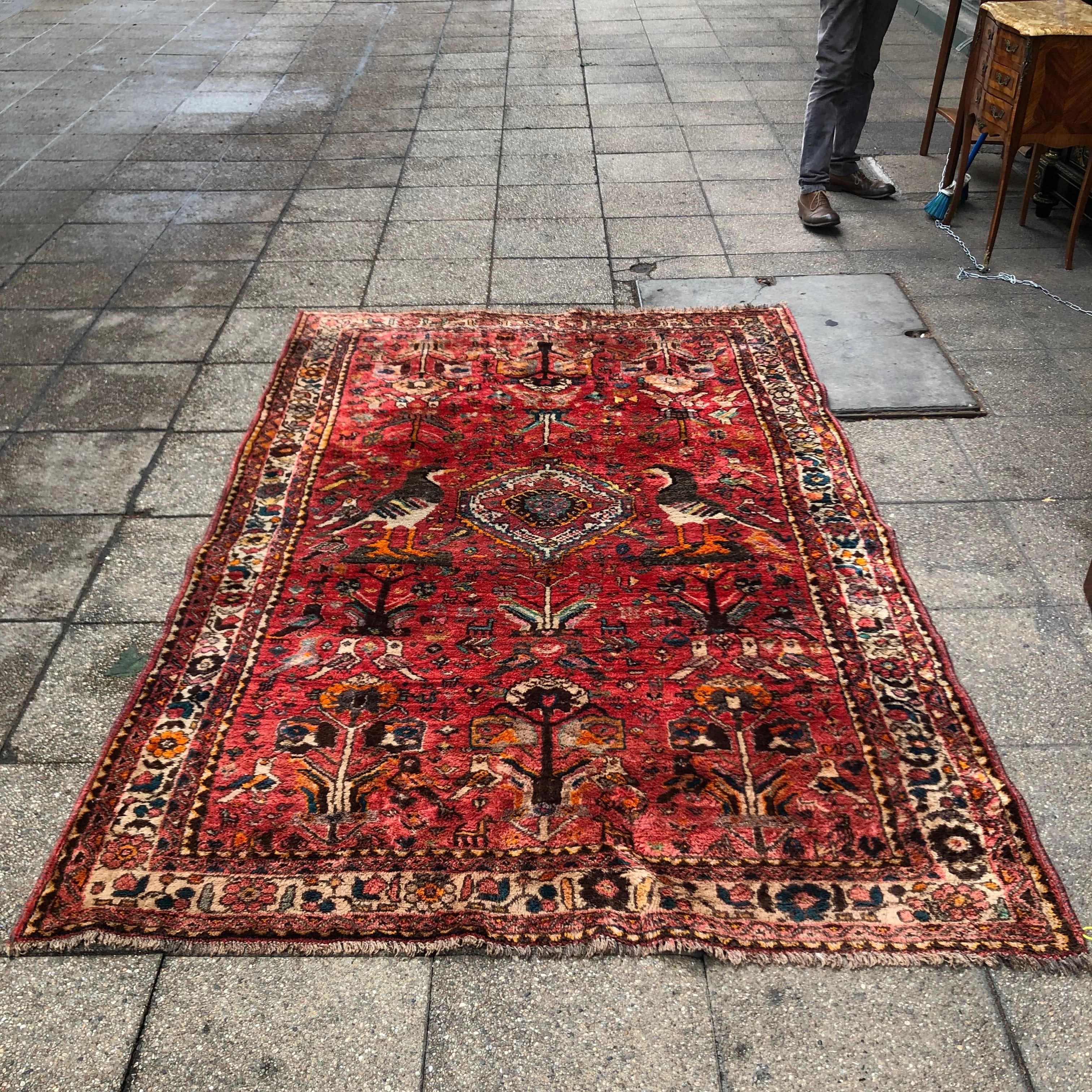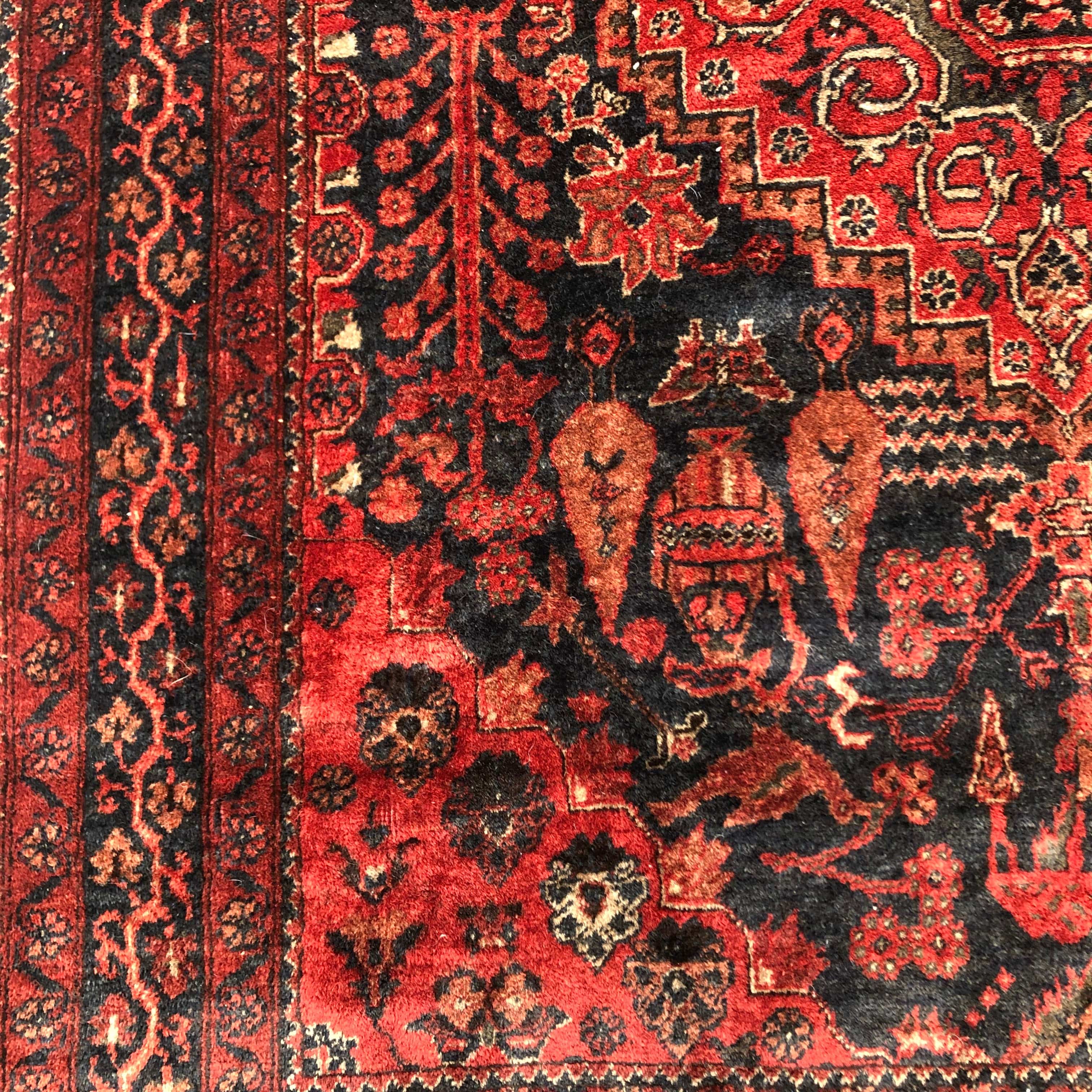 Bella alfombra de origen persa, región de Hamadhan, anudada a mano. Detallados diseños geométricos, flores y figura central en tonos azules y rojizos.