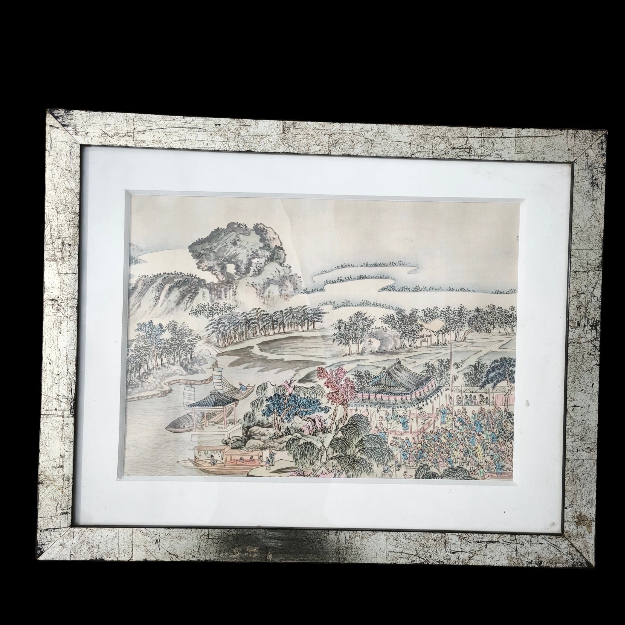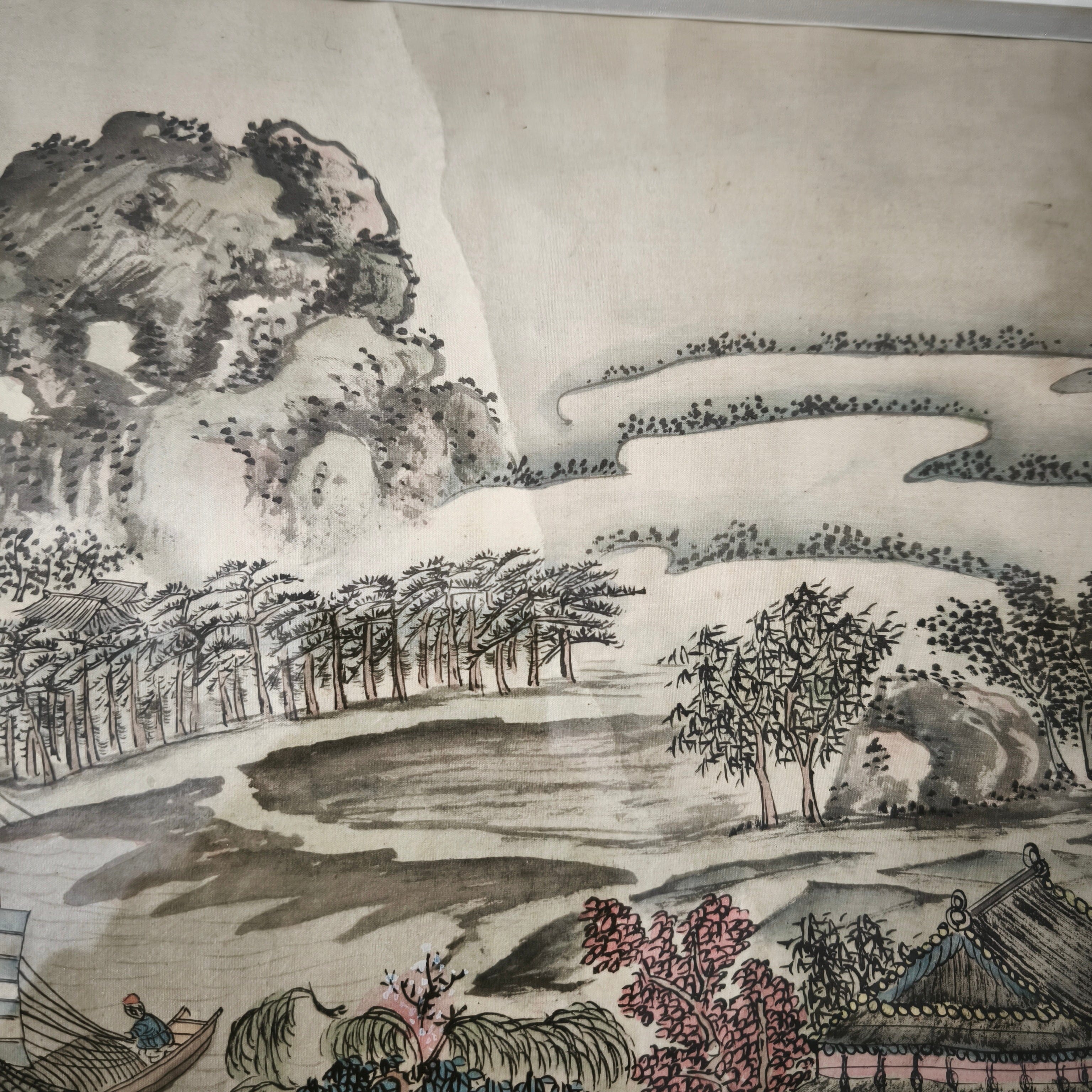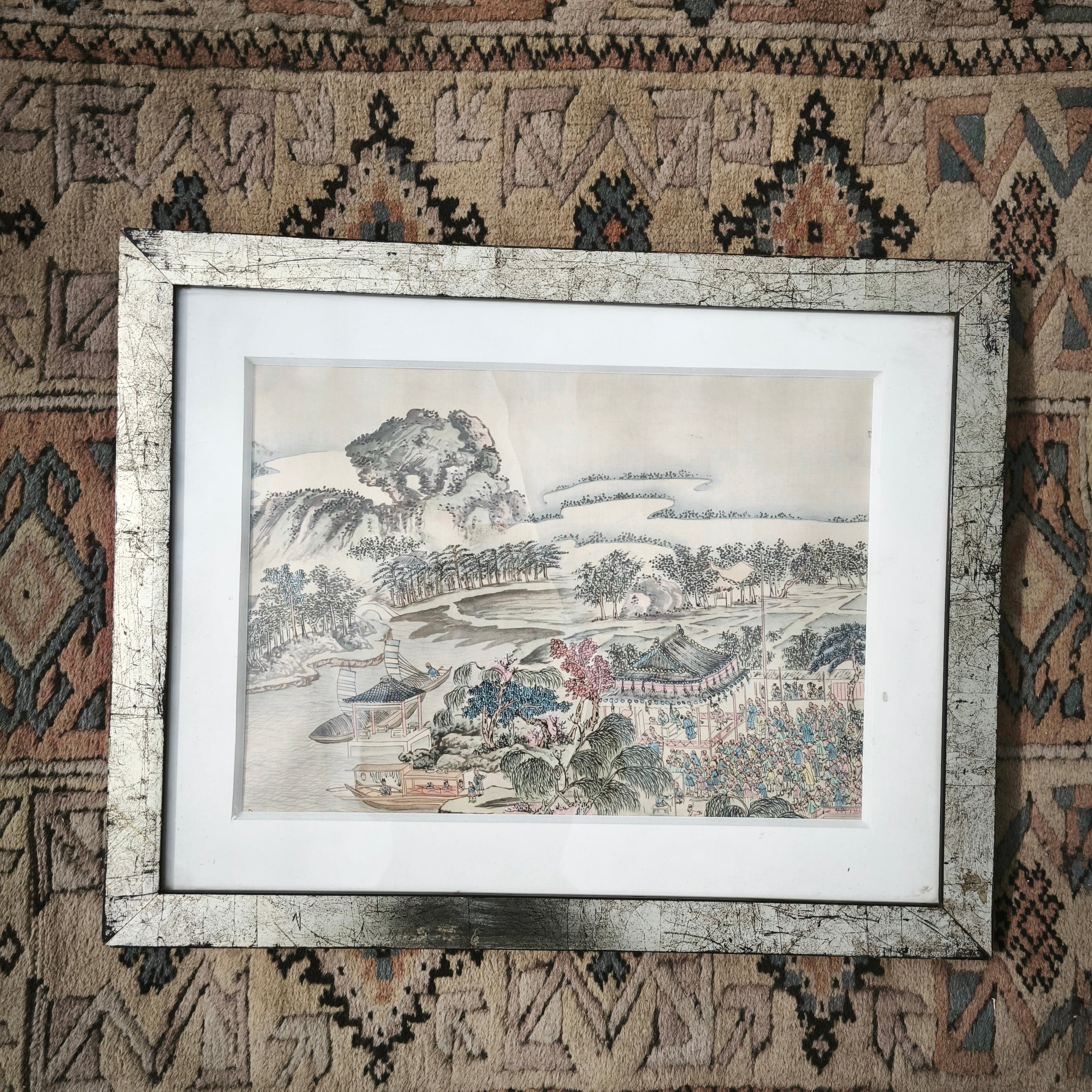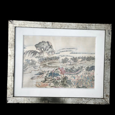 Hermoso grabado de origen chino sobre tela, retratando un paisaje de naturaleza, mar y bosque, bellos colores y delicado trazo muy propios del origen del grabado. la obra esta enmarcada en un marco de metal.