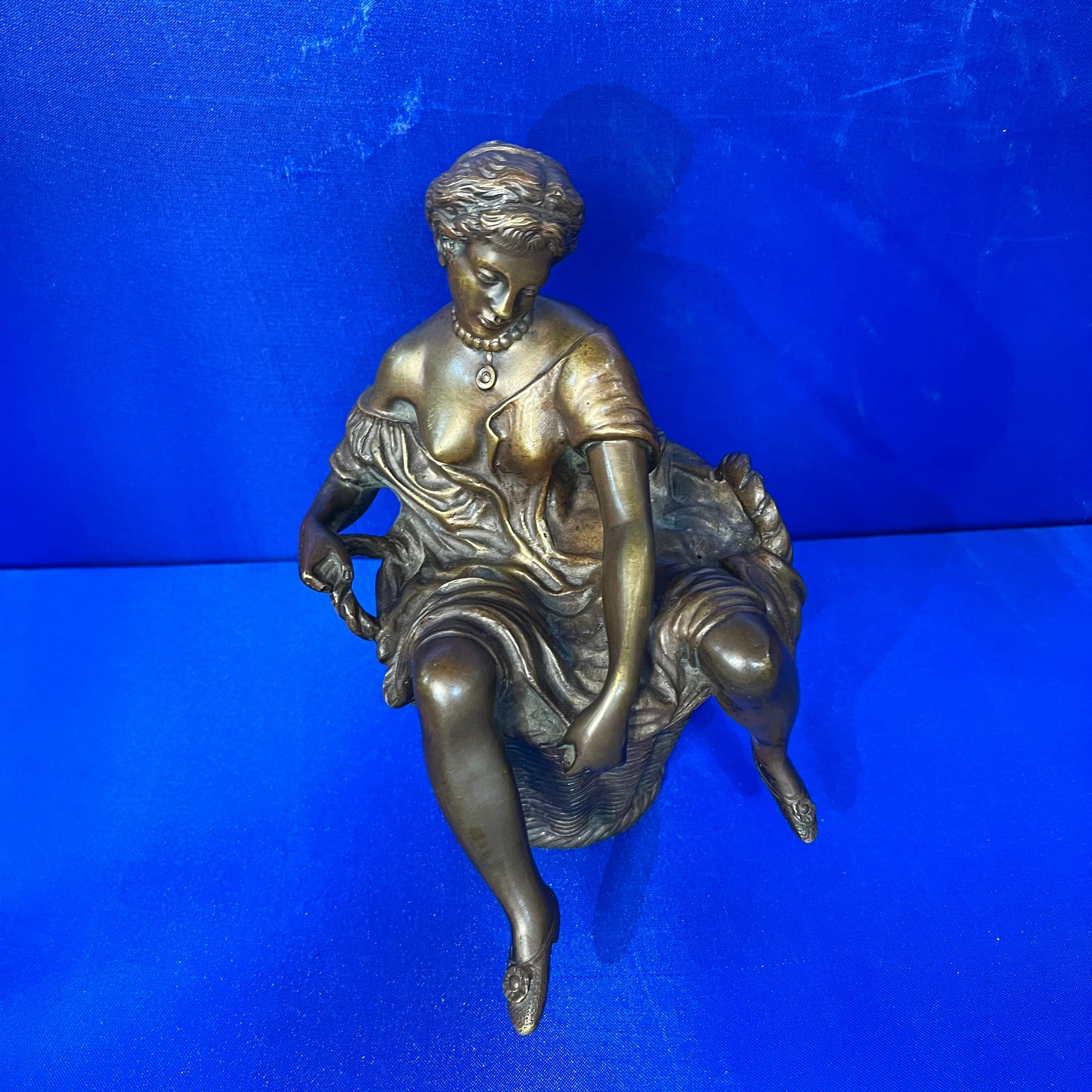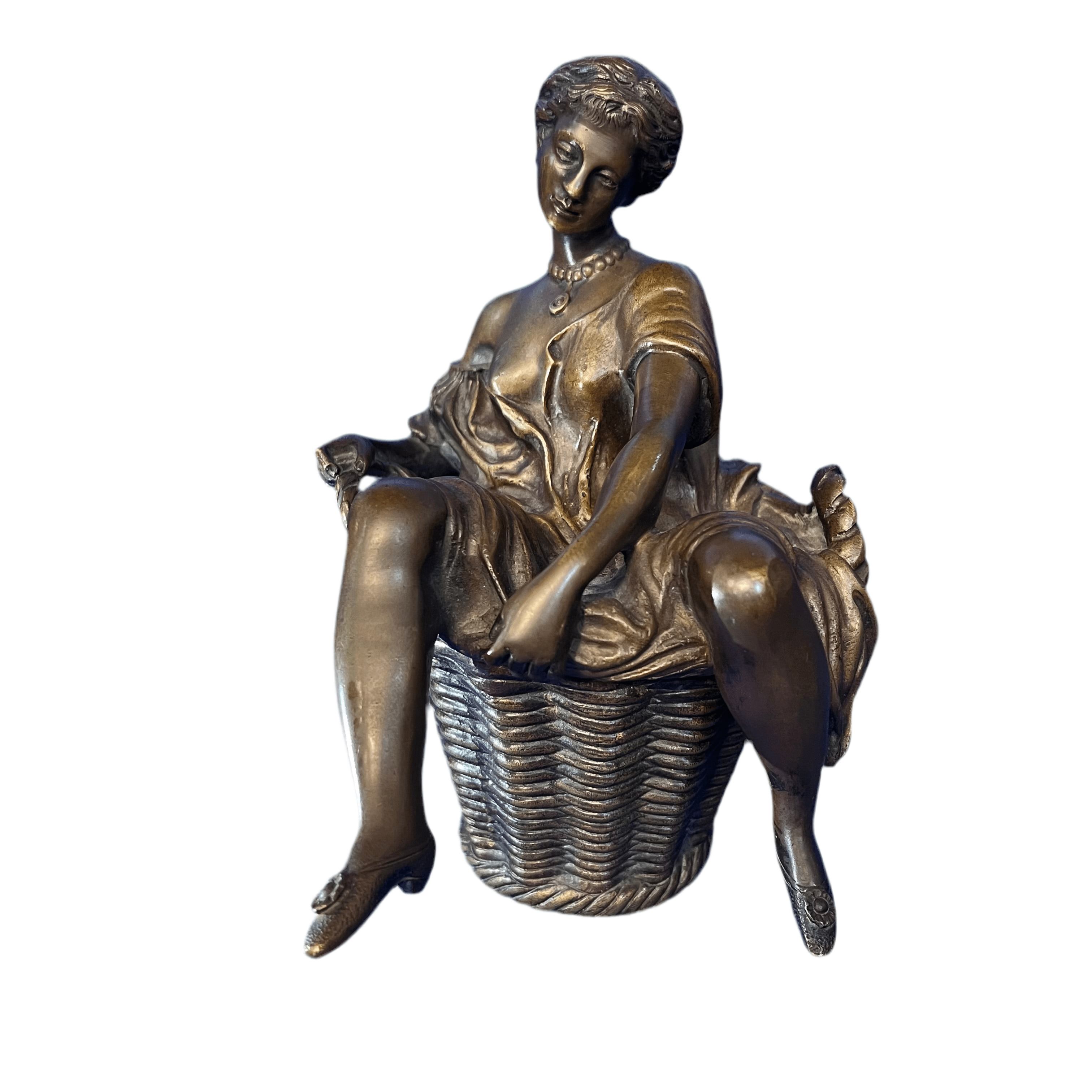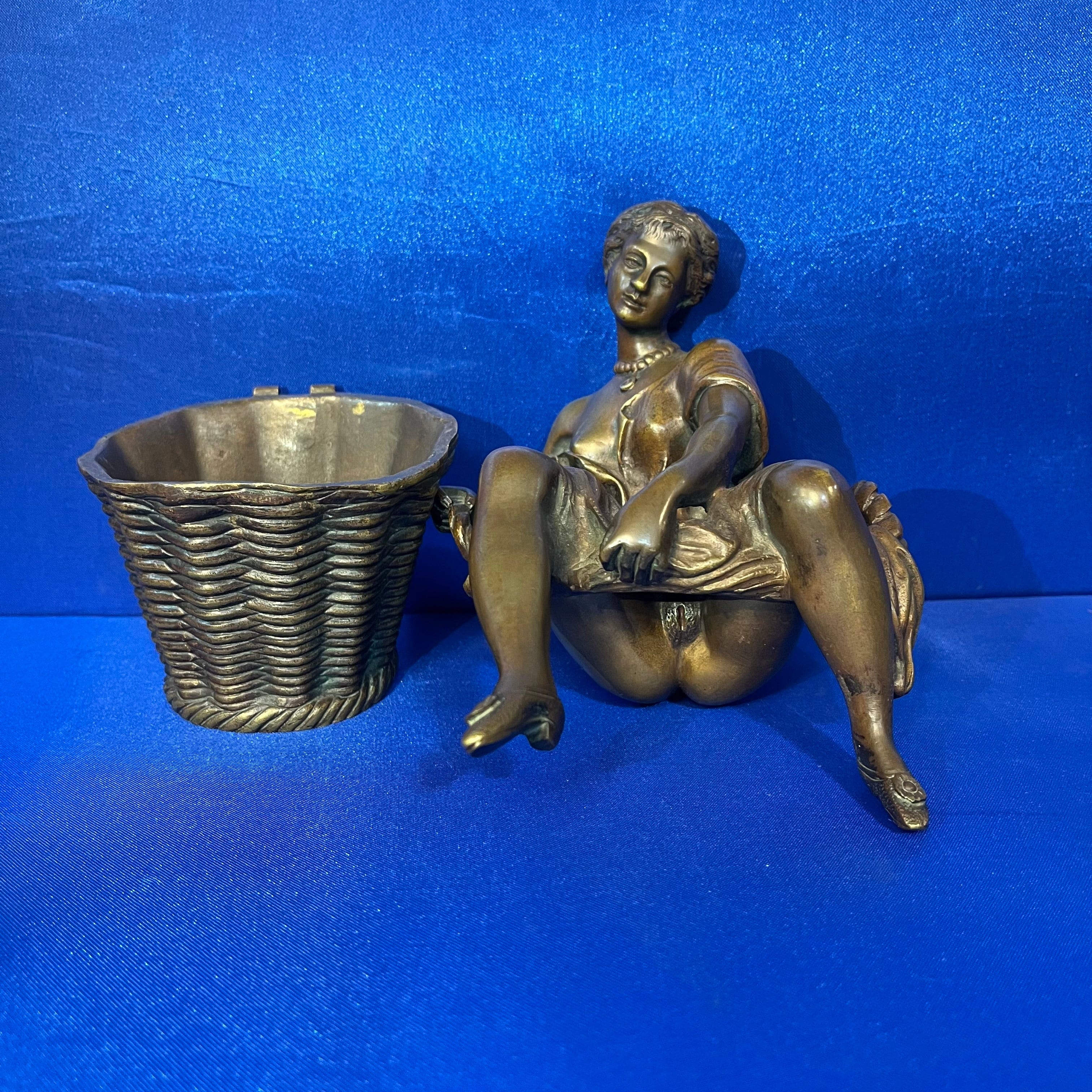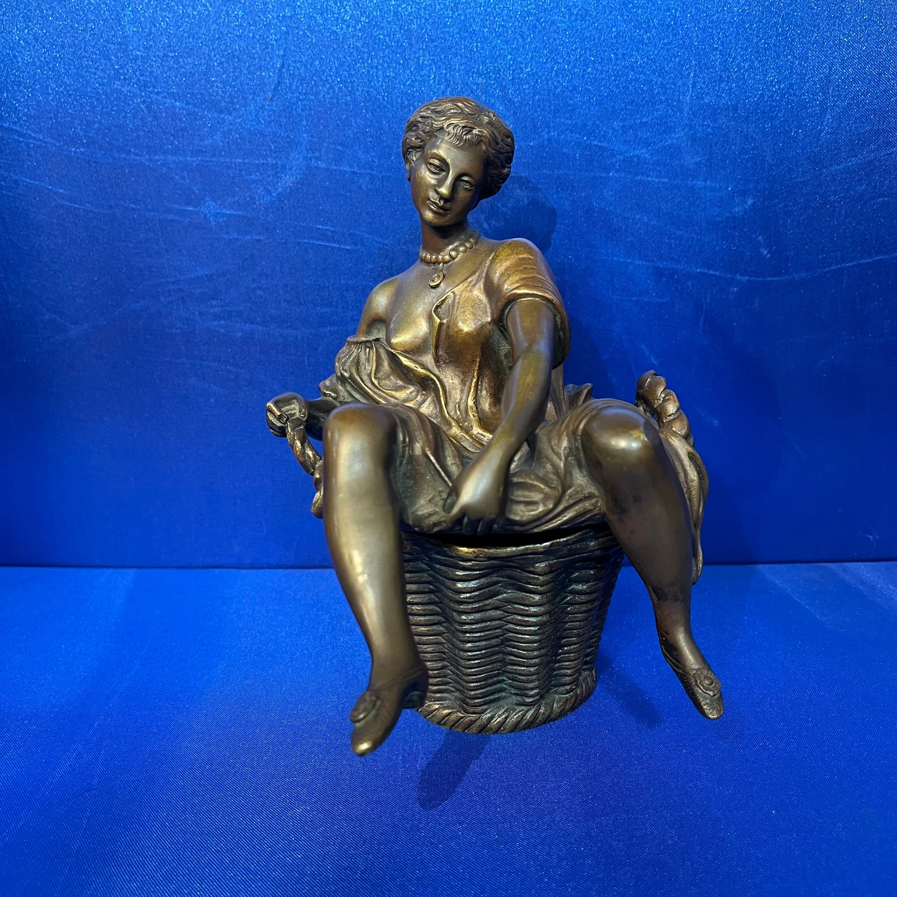 Provocativa figura de broce de mujer sentada sobre canasto de lavandería. Siglo XIX Se atribuye al escultor francés Charles Bory (1788-1856)