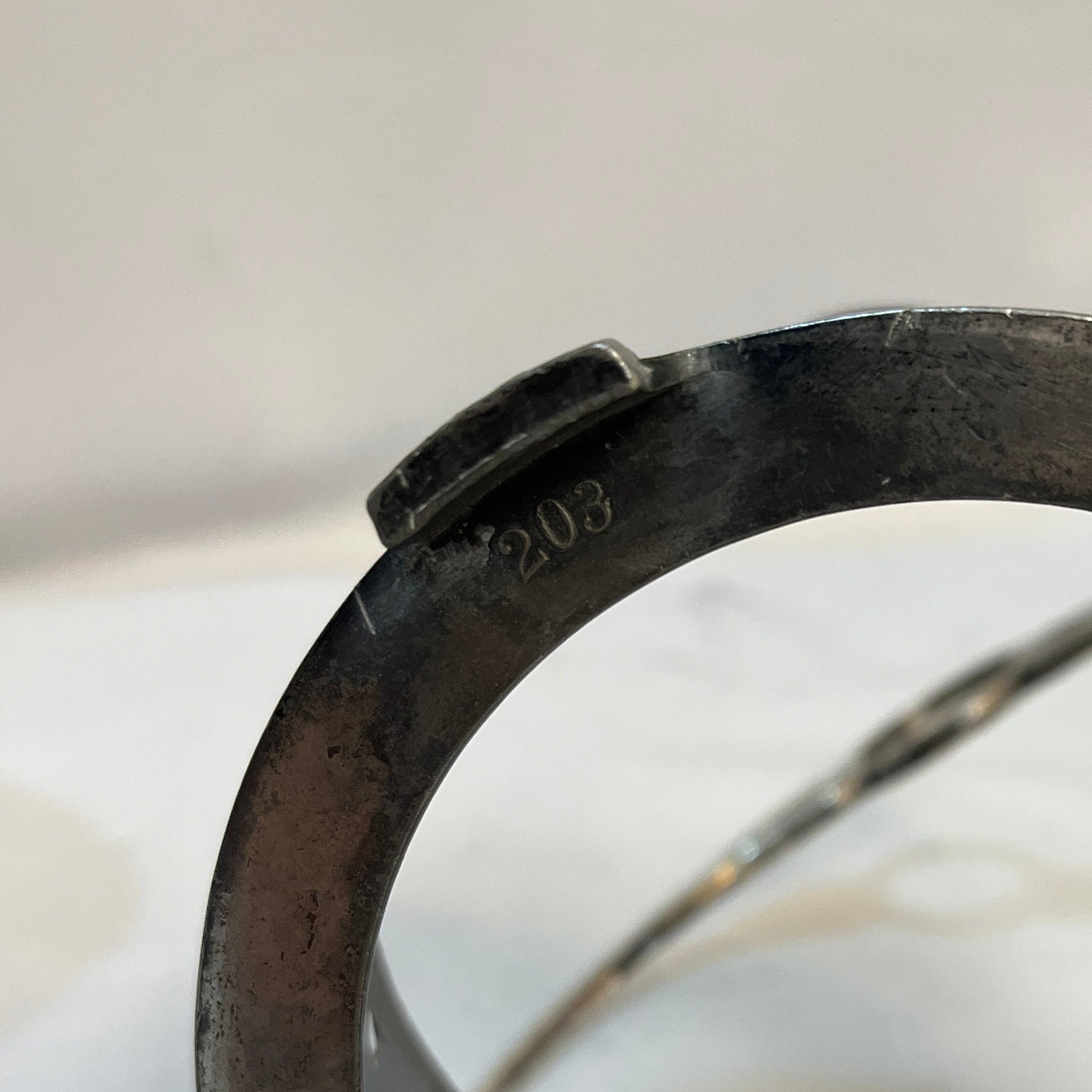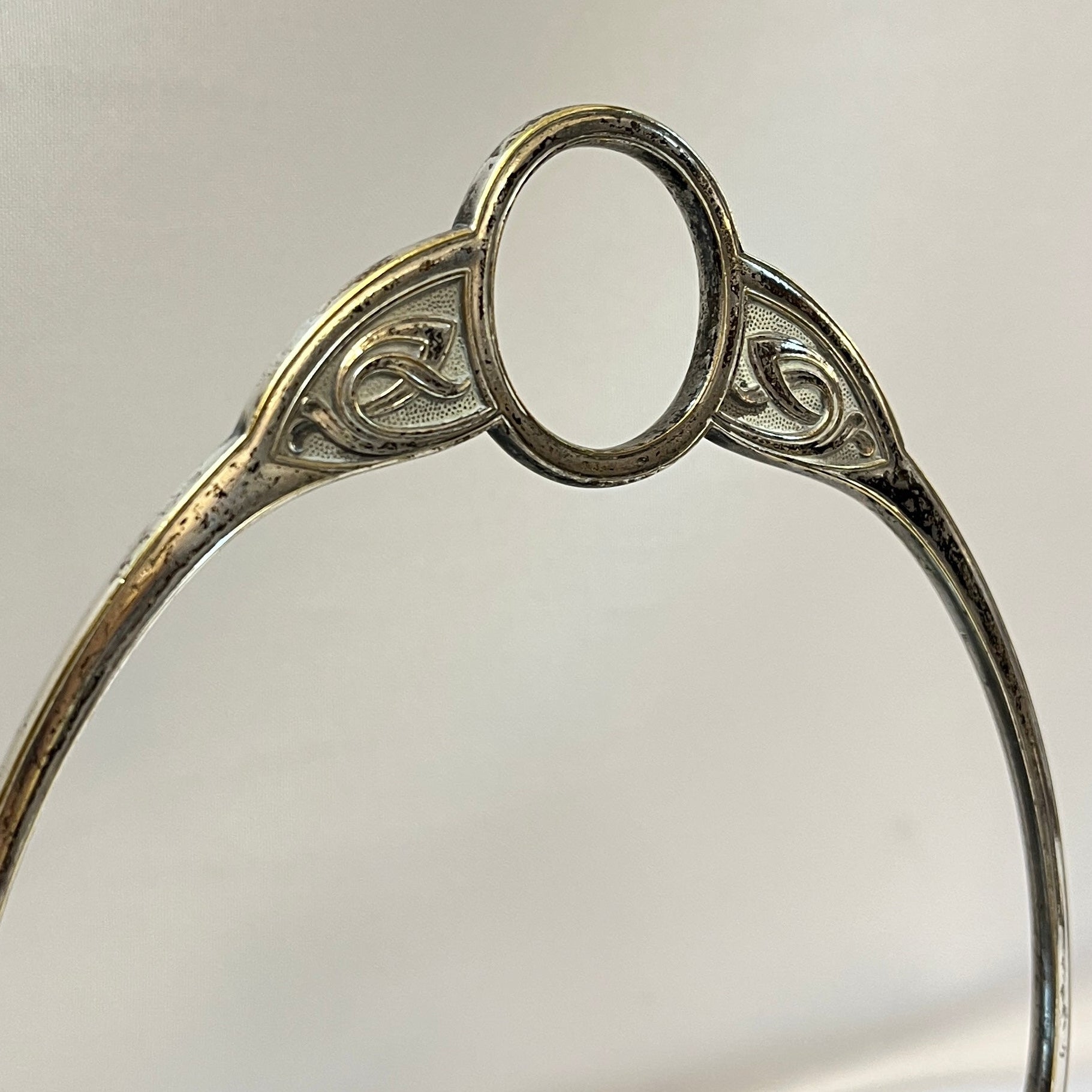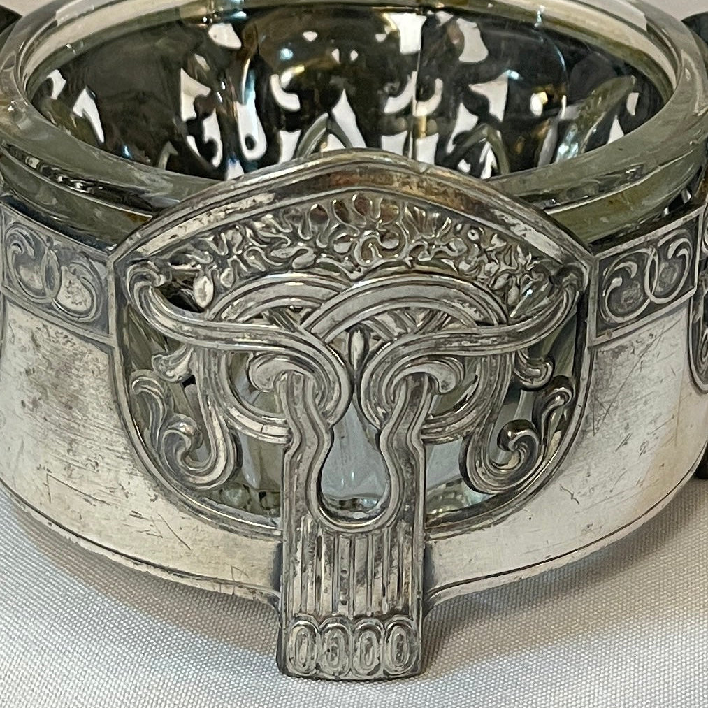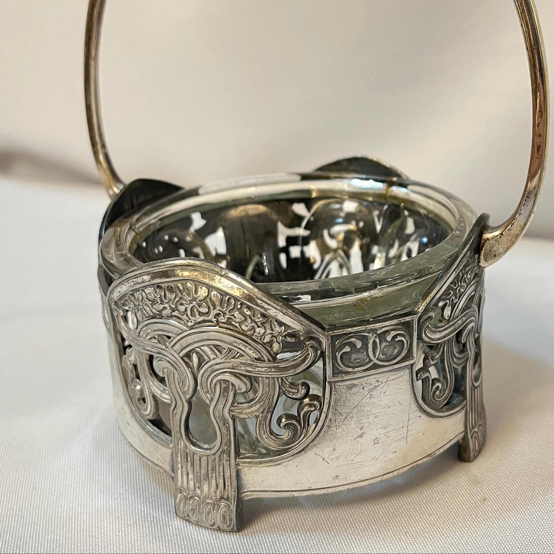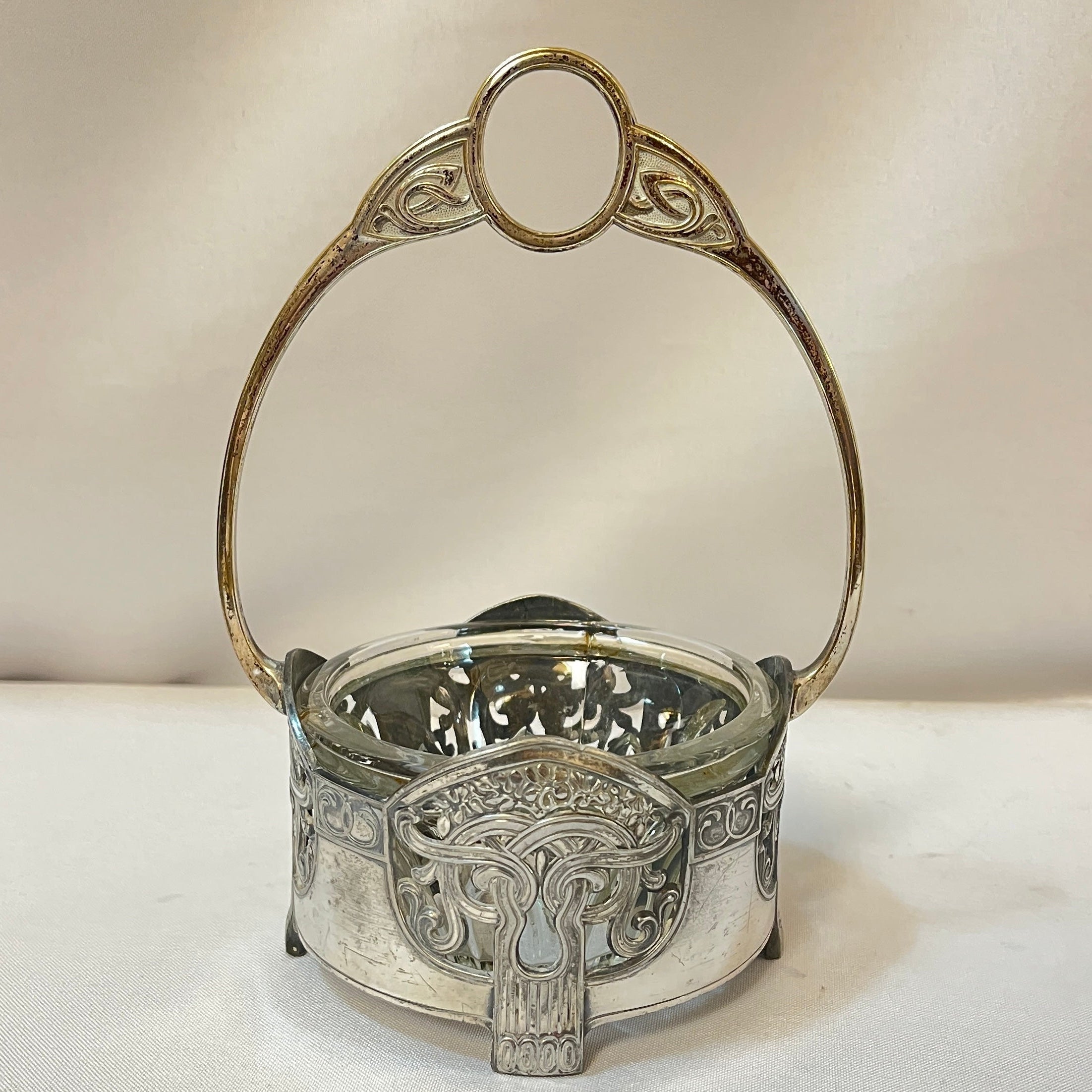 Hermosa canasta de peltre, de inspiración Art Nouveau. La pieza presenta una delicada estructura metálica con una elegante asa superior y refinados relieves ornamentales. Su cuerpo está decorado con sinuosas curvas y motivos florales característicos del estilo, que enmarcan un recipiente interior de vidrio tallado. Un objeto representativo del diseño europeo de fines del siglo XIX y comienzos del XX.