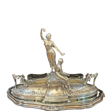 Elegante centro de mesa alemán estilo Art Nouveau, de estaño y vidrio con base de plató. Hermosas siluetas femeninas con la característica floración de su estilo. Se presume que es de principio del siglo XX, año 1920 aproximadamente.