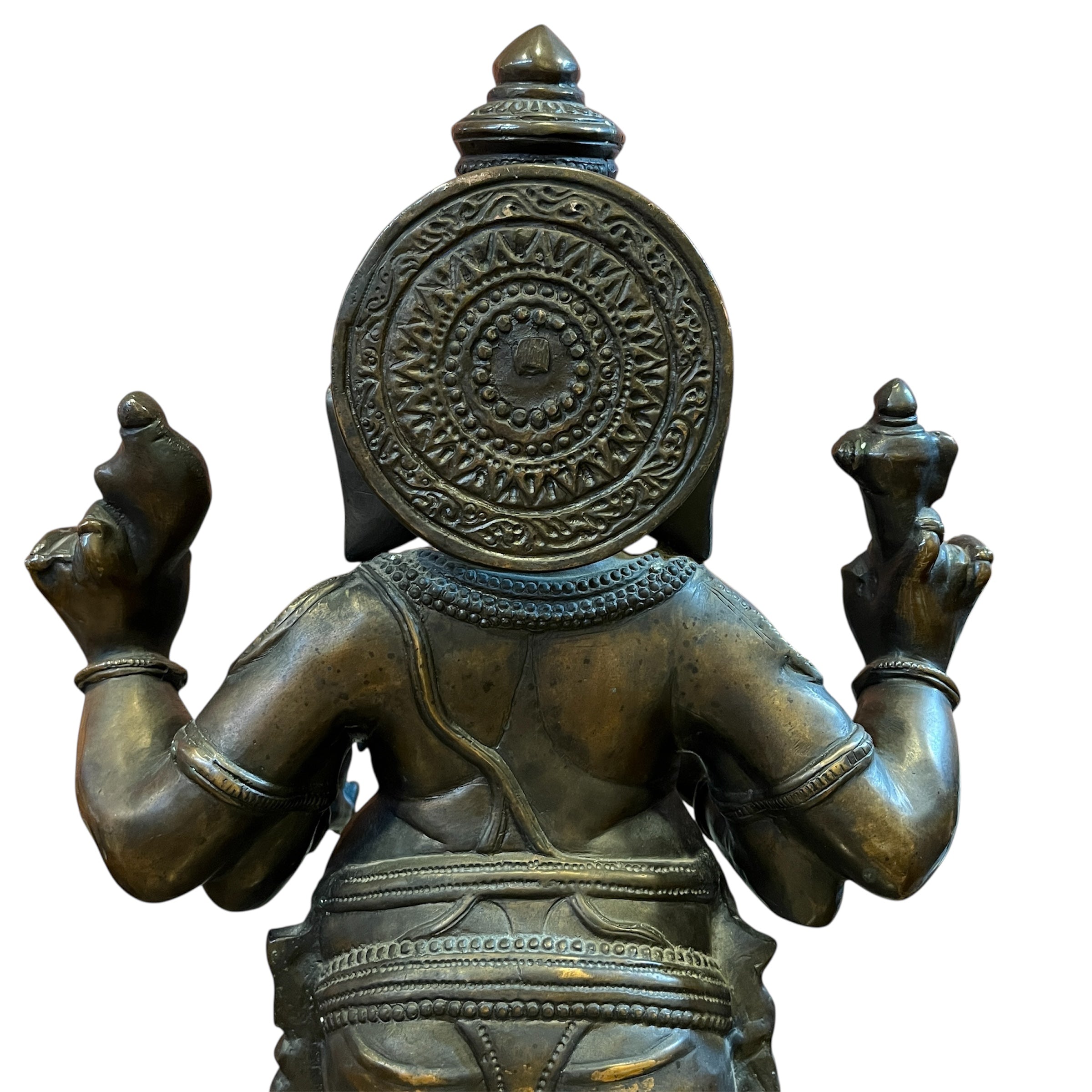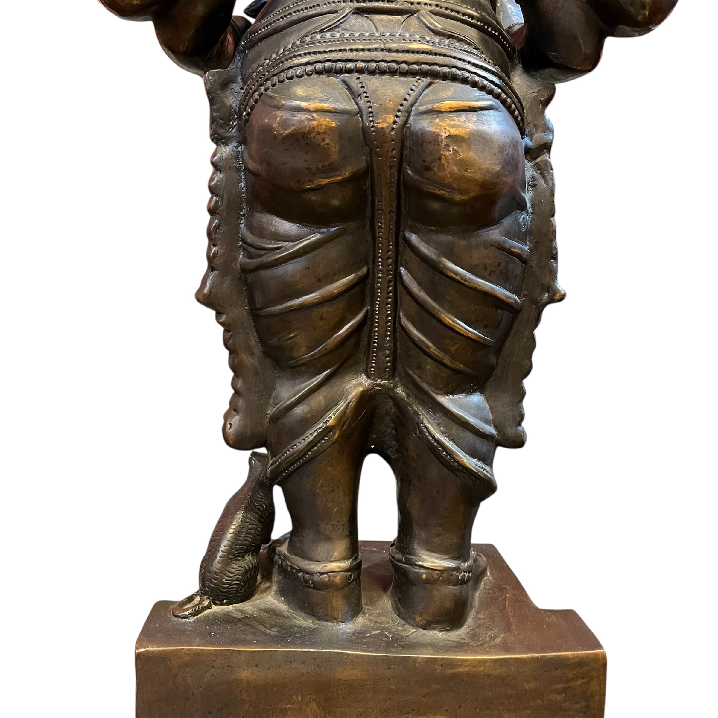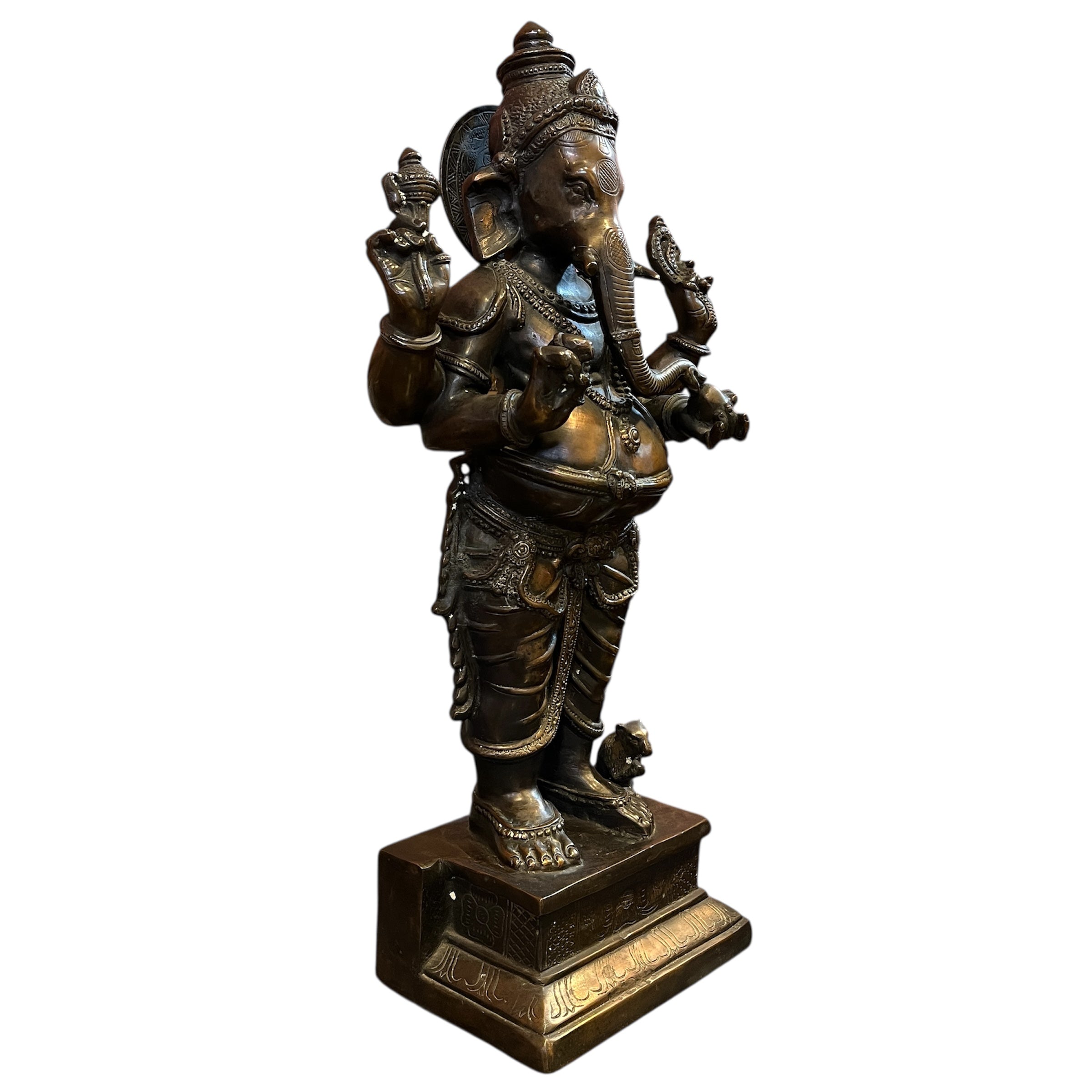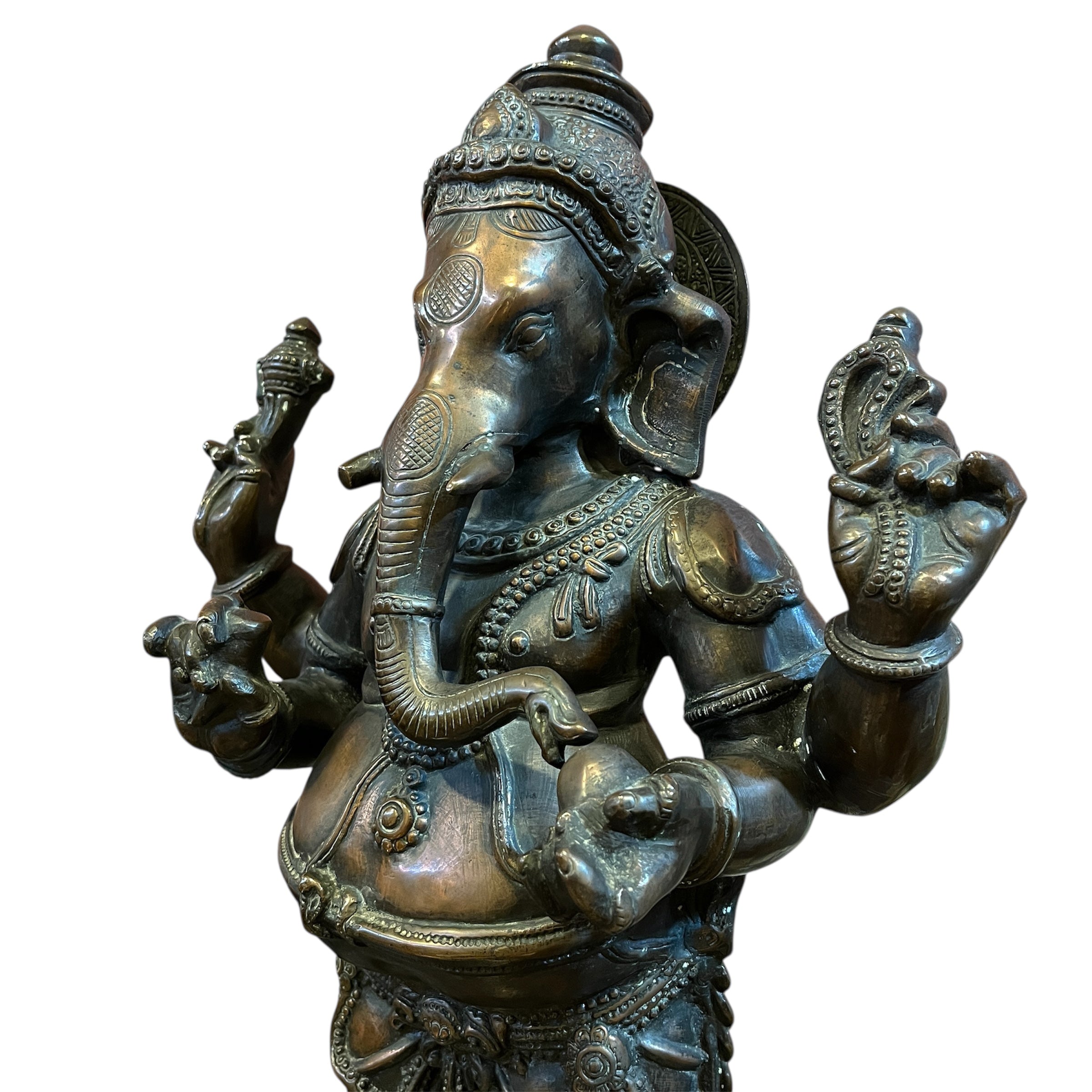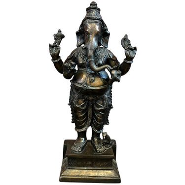 Esta figura, proveniente de la India, es una escultura hecha a mano en bronce, de Ganesha, una de las deidades más veneradas del hinduismo. Reconocible por su cuerpo humano con cabeza de elefante, representa la sabiduría, intelecto y escucha. Se considera como 'removedor de obstáculos’ y ‘abre caminos’, utilizada como guía en nuevos comienzos, trabajos y realización.