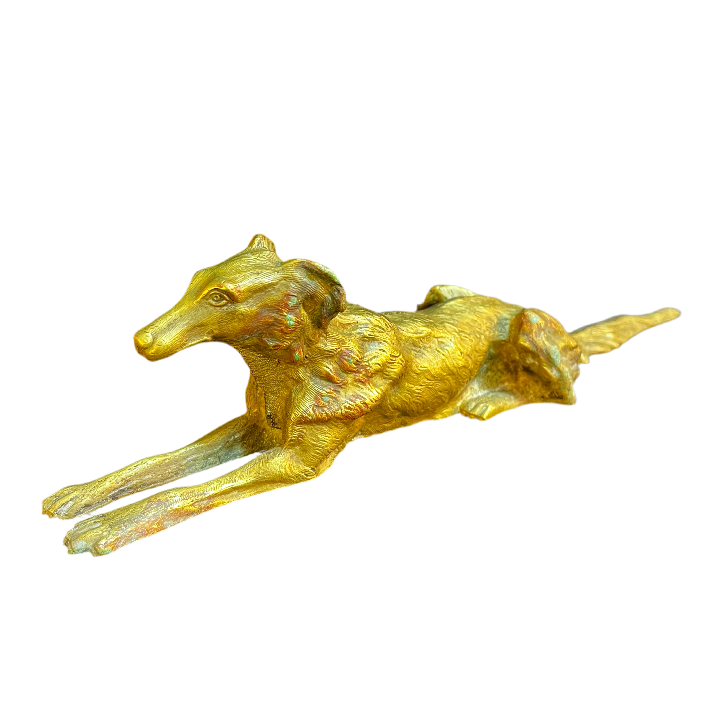 Elegante figura de bronce, de origen francés, representando un precioso galgo recostado en su vientre. La figura captura de manera detallada la anatomía y el pelaje del animal, dándole mucha textura a la figura.
