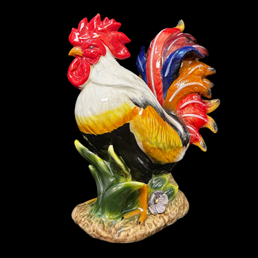 Hermosa figura de porcelana mayólica francesa representando una Gallo. El plumaje de la cola presenta intensos y variados colores, además del vivo rojo de la cresta.