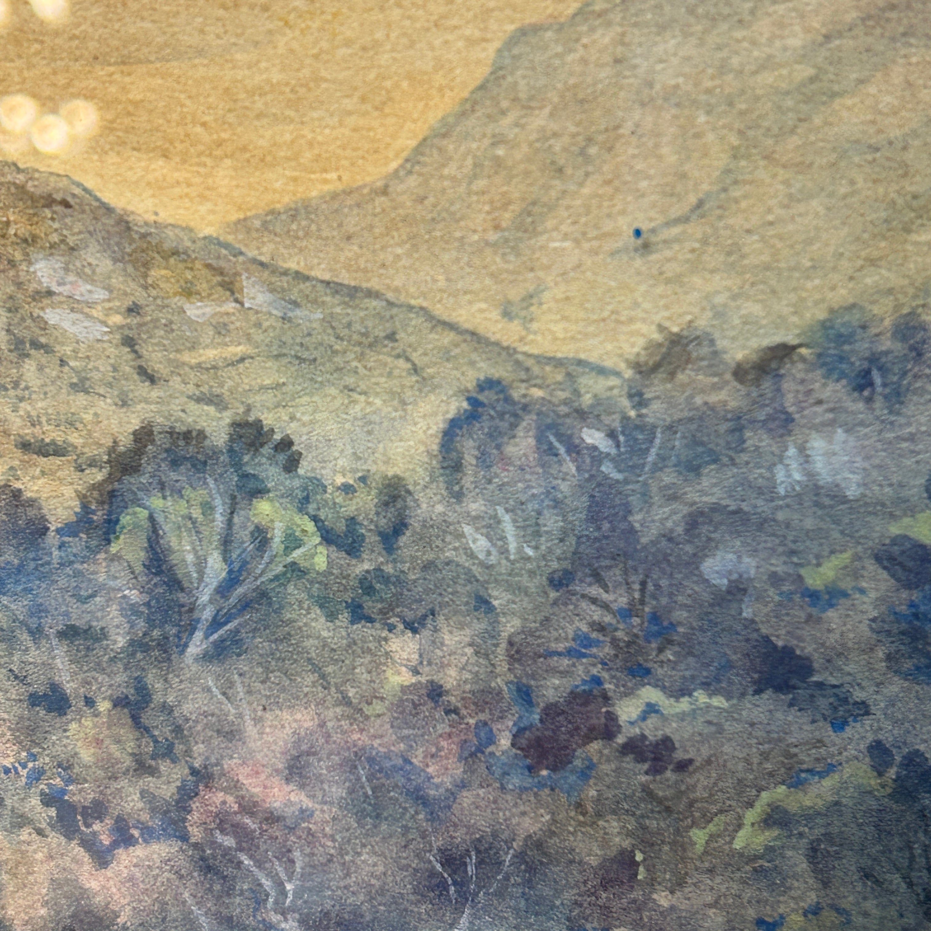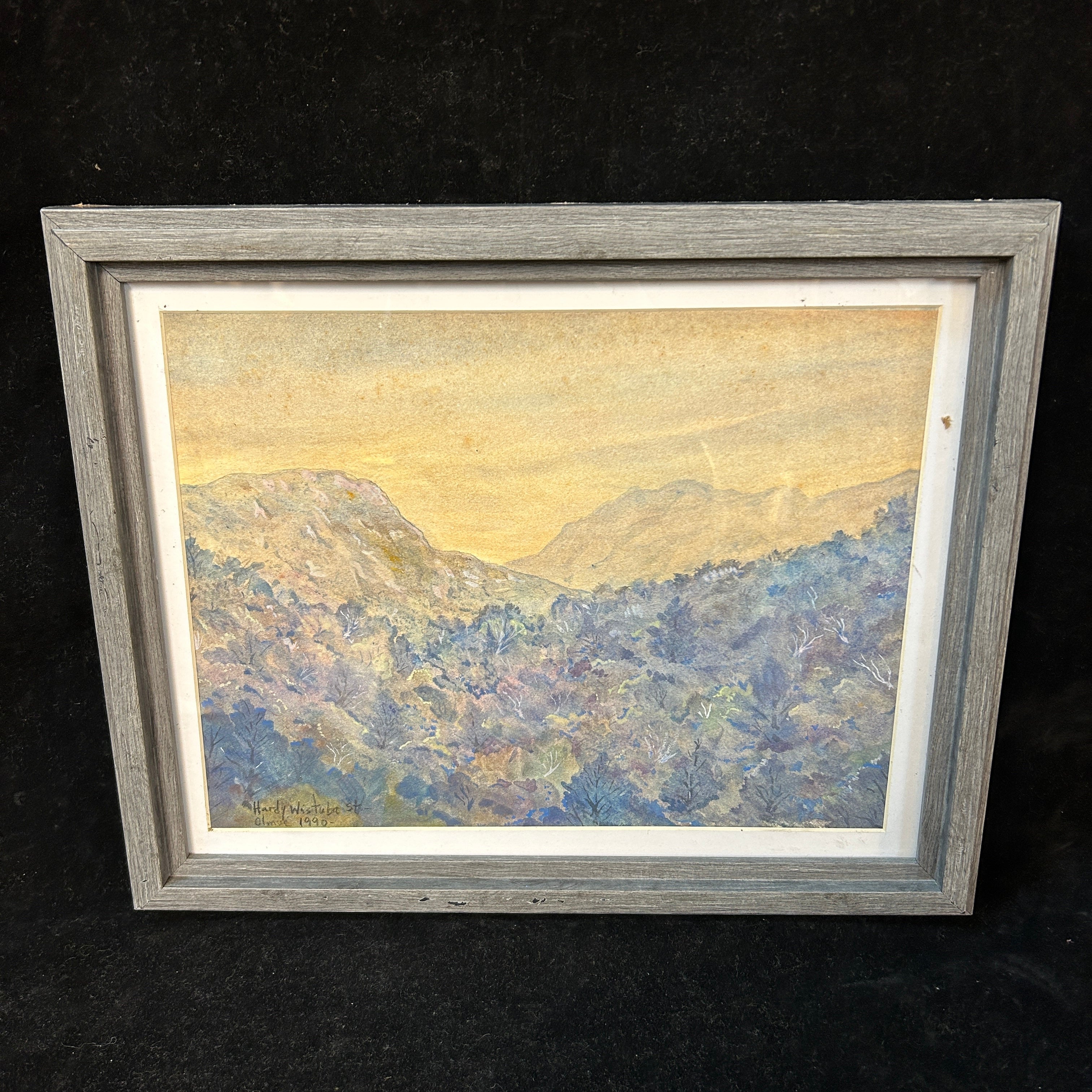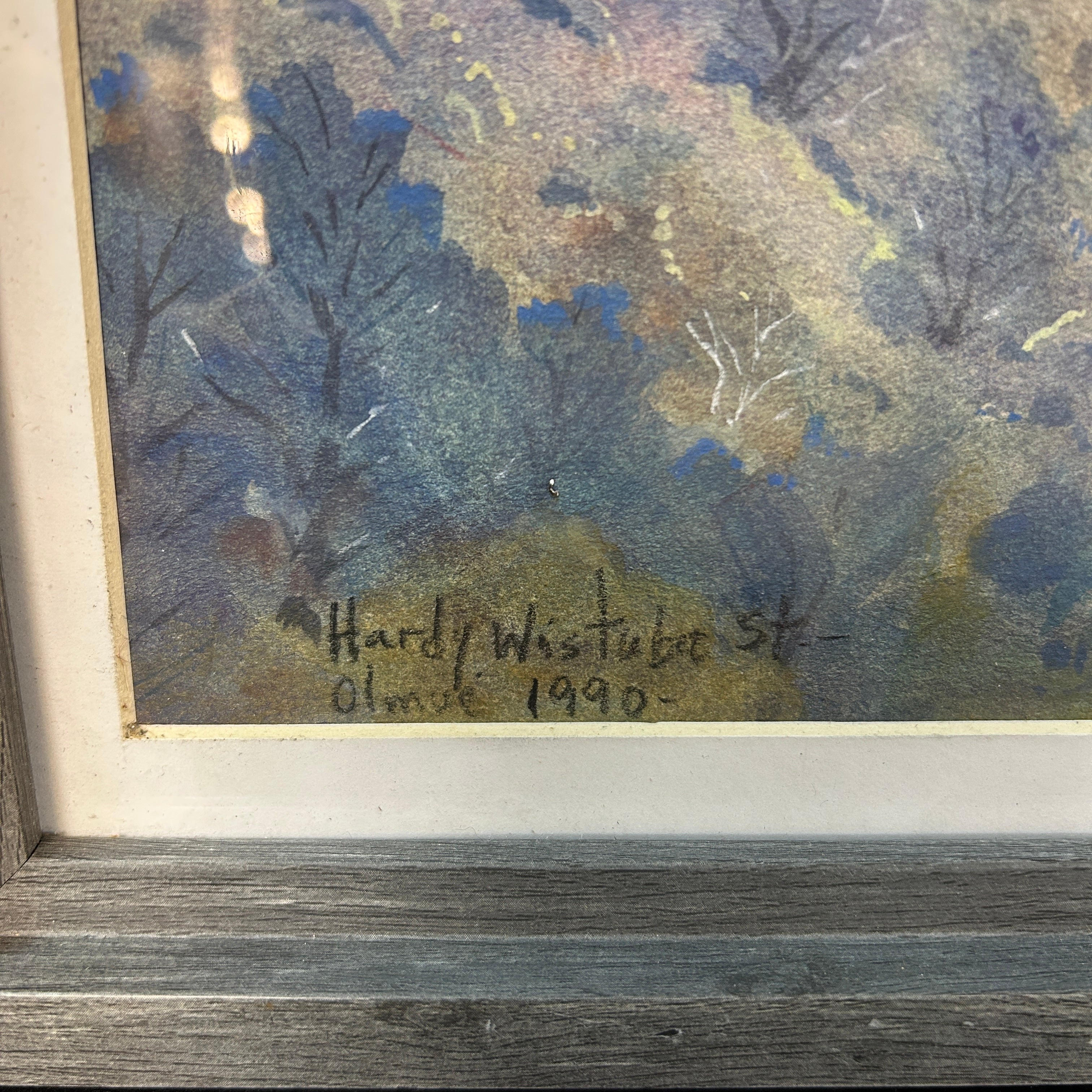 Acuarela del reconocido artista chileno Hardy Wistuba, pintada en 1990, titulada “Olmué”. Este paisaje, en tonos azules y violetas, muestra el gran oficio de este pintor, plasmando no solo la delizadeza con que maneja la técnica de la acuarela, sino que también por la elección de colores, que sublima el paisaje, escapando de la realidad hacia un terreno más impresionista. La obra tiene un marco de madera sobrio y contemporáneo, en un color marengo, muy en línea con la temperatura de la obra.