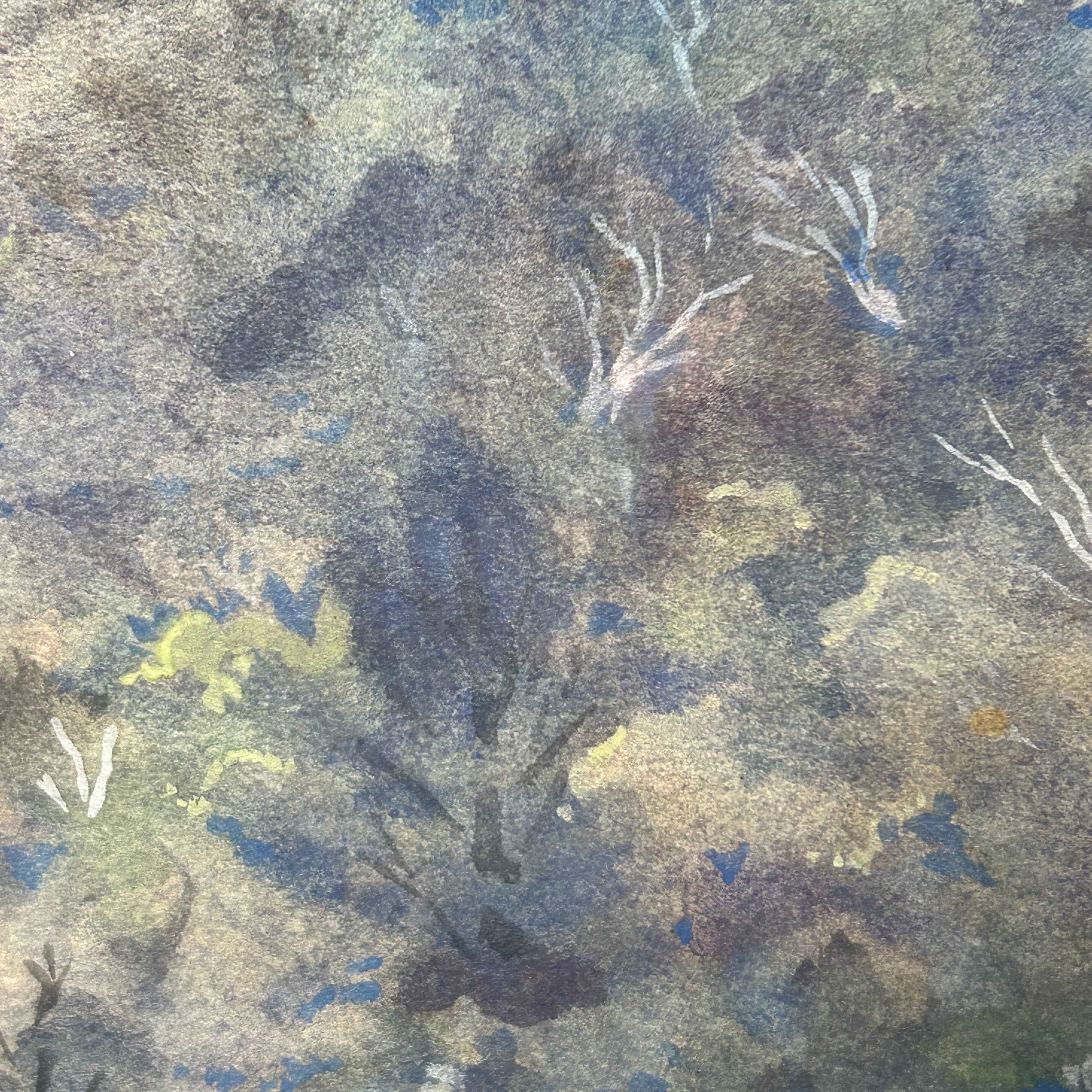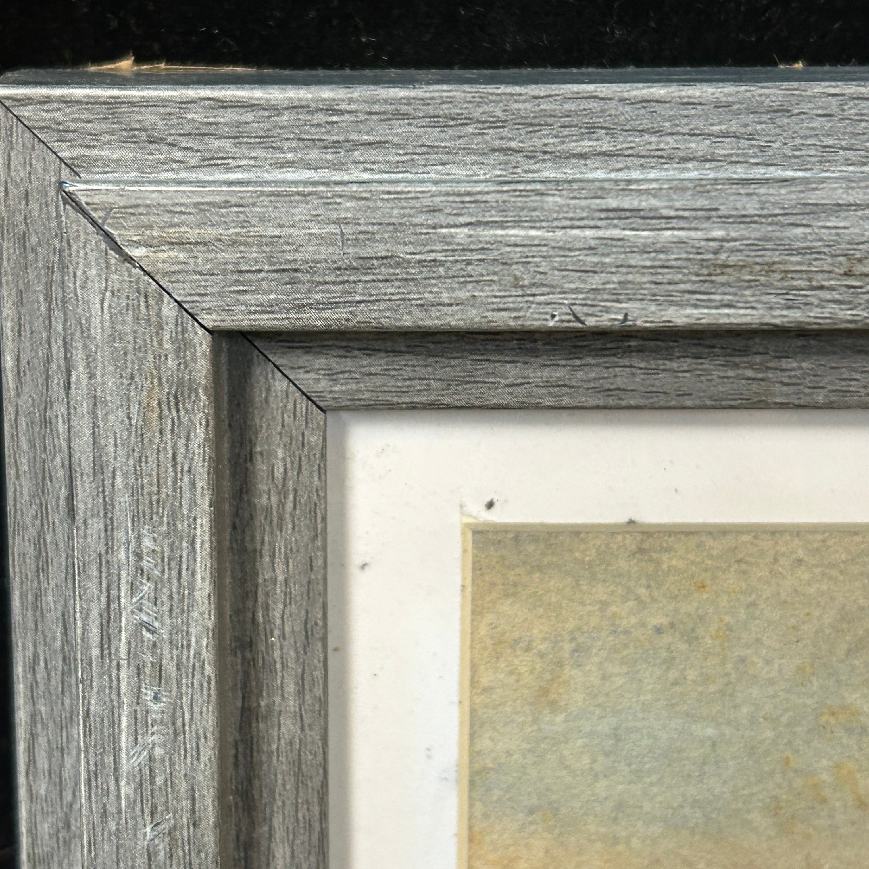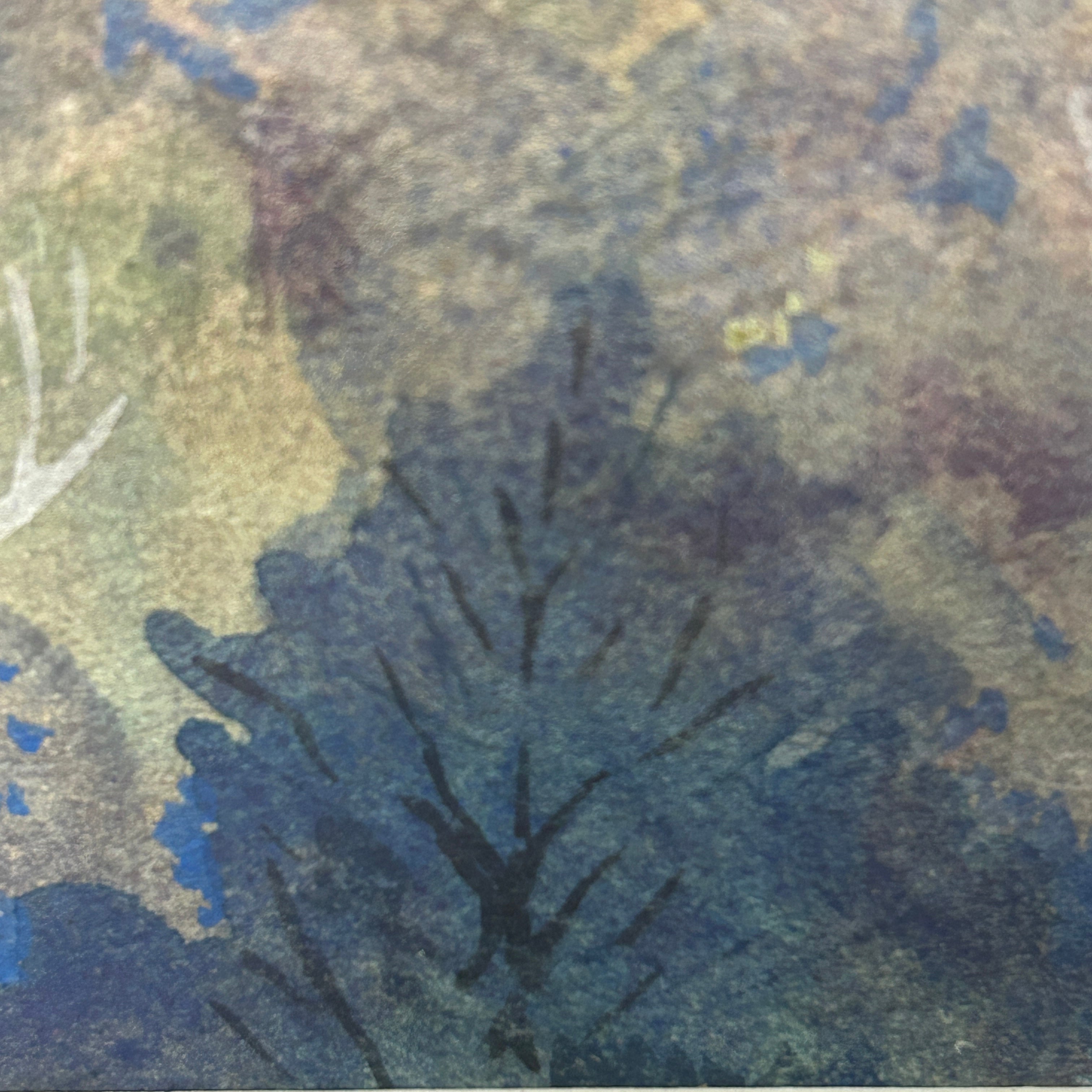 Acuarela del reconocido artista chileno Hardy Wistuba, pintada en 1990, titulada “Olmué”. Este paisaje, en tonos azules y violetas, muestra el gran oficio de este pintor, plasmando no solo la delizadeza con que maneja la técnica de la acuarela, sino que también por la elección de colores, que sublima el paisaje, escapando de la realidad hacia un terreno más impresionista. La obra tiene un marco de madera sobrio y contemporáneo, en un color marengo, muy en línea con la temperatura de la obra.