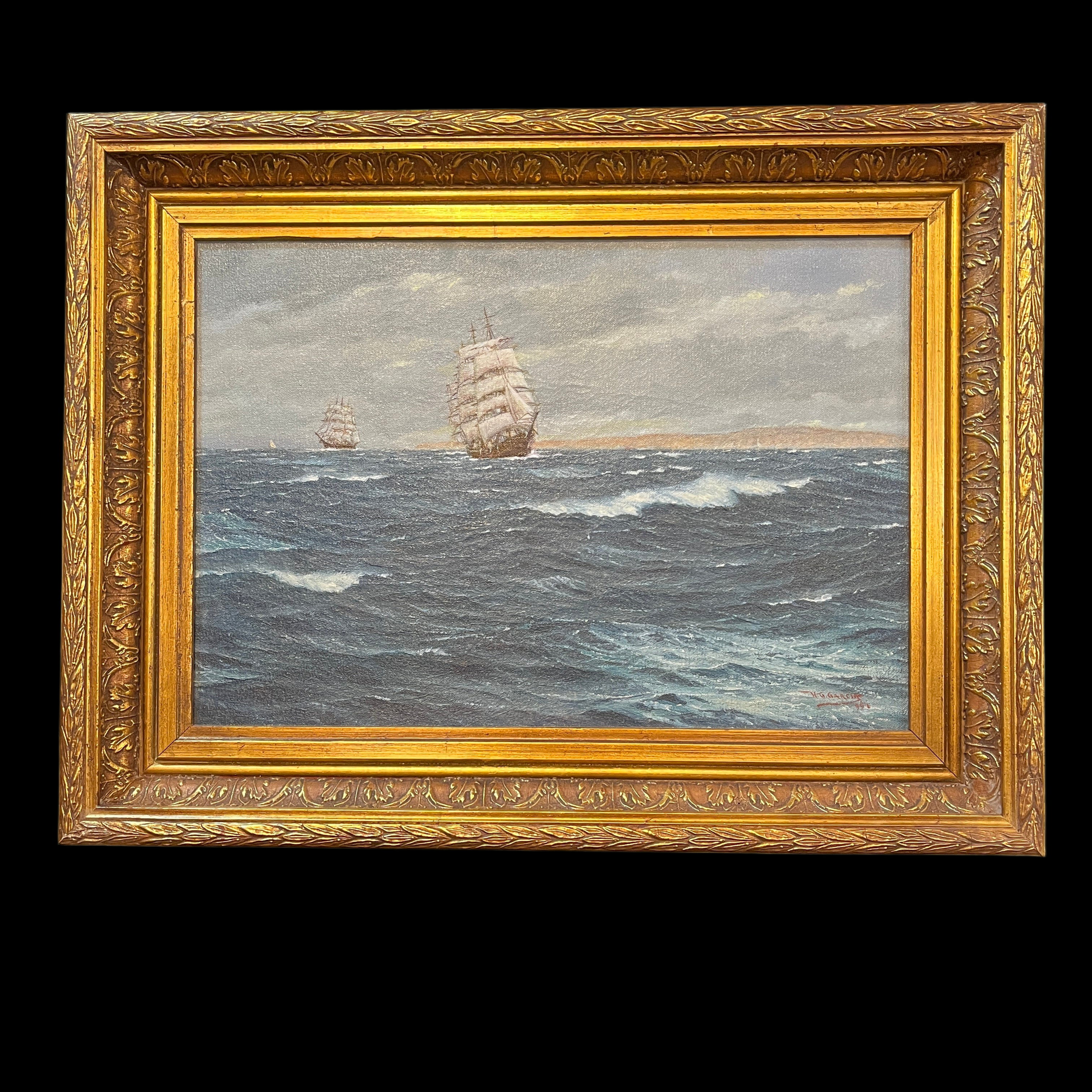 Hermosa marina del pintor chileno Horacio García. El cuadro retrata dos embarcaciones el alta mar. Se puede apreciar un mar agitado y un cielo nublado acompañando ambas embarcaciones.