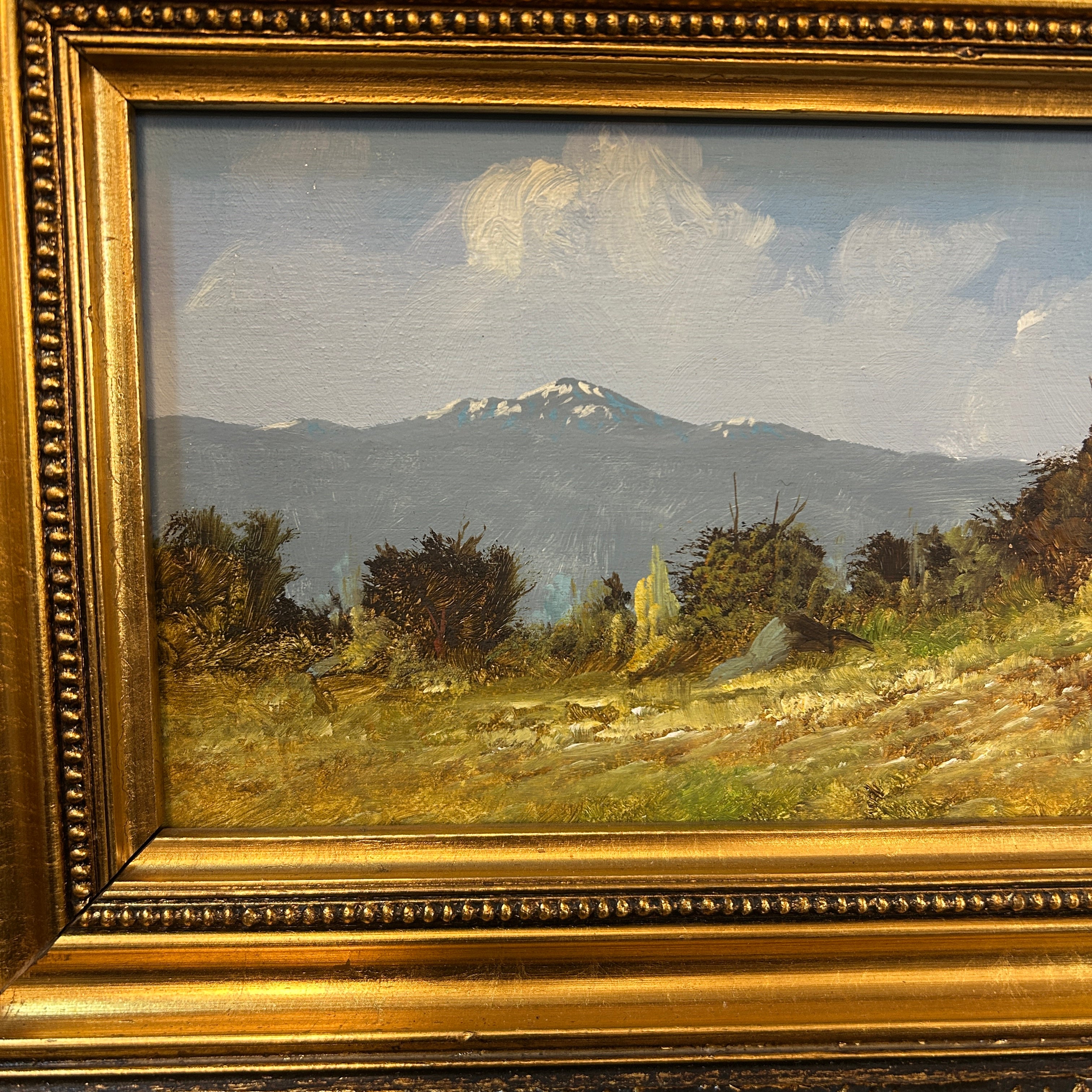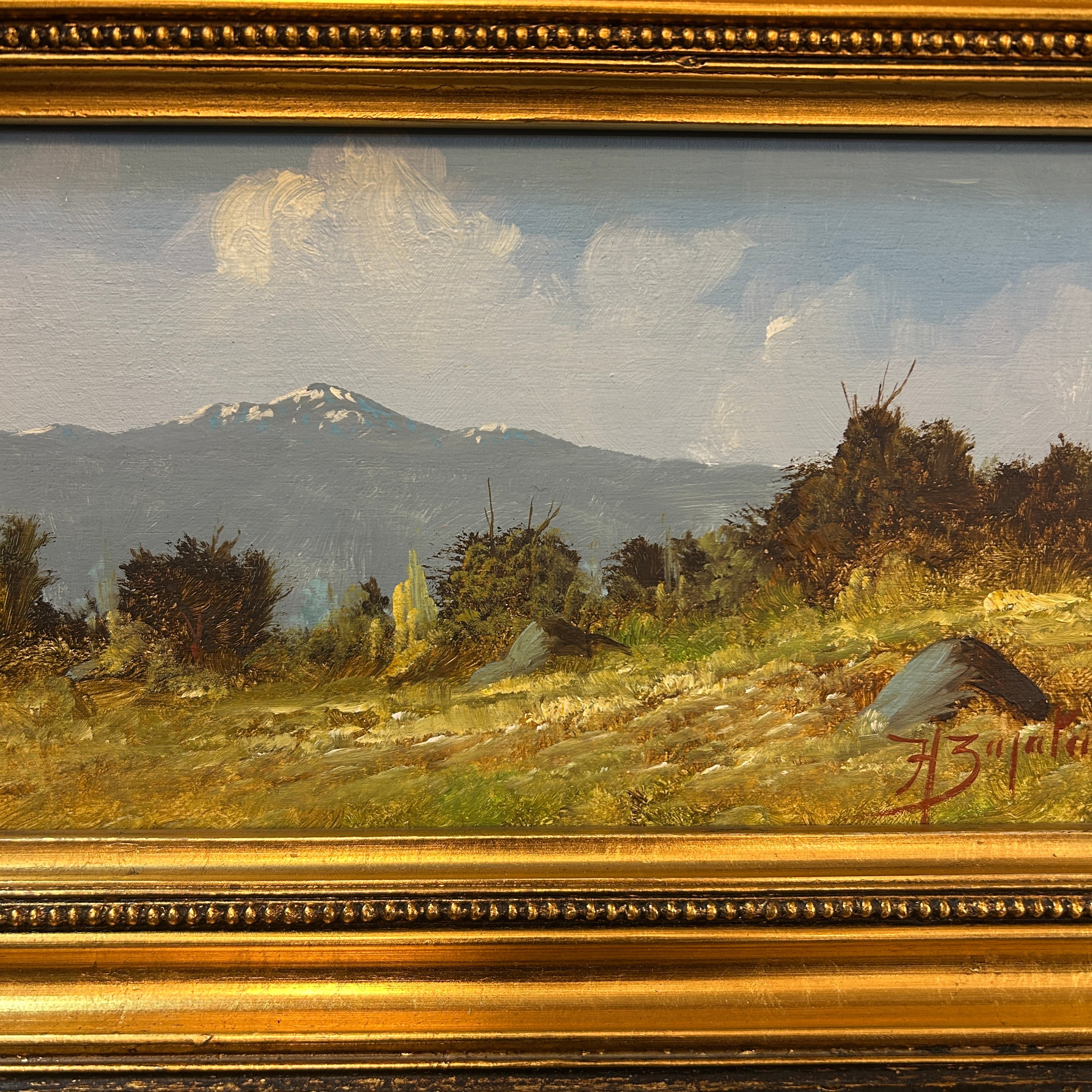 Bello óleo sobre madera del pintor chileno Hugo Zapata. La obra representa un encantador paisaje campestre, con variedad de vegetación nativa. En el fondo se aprecia la imponente cordillera, enmarcada por suaves formaciones nubosas. El cuadro está realzado por un  marco de madera tallada con acabado dorado.