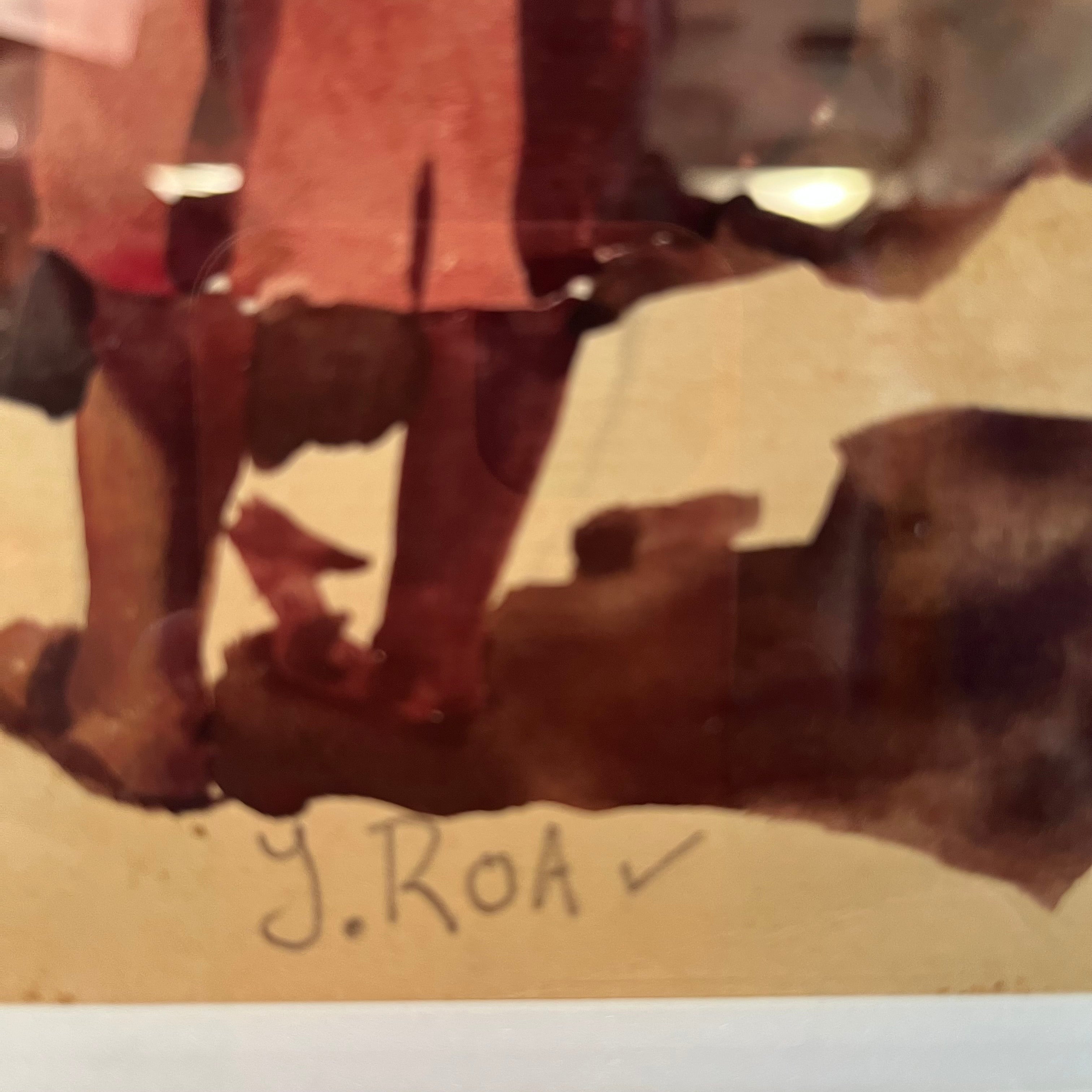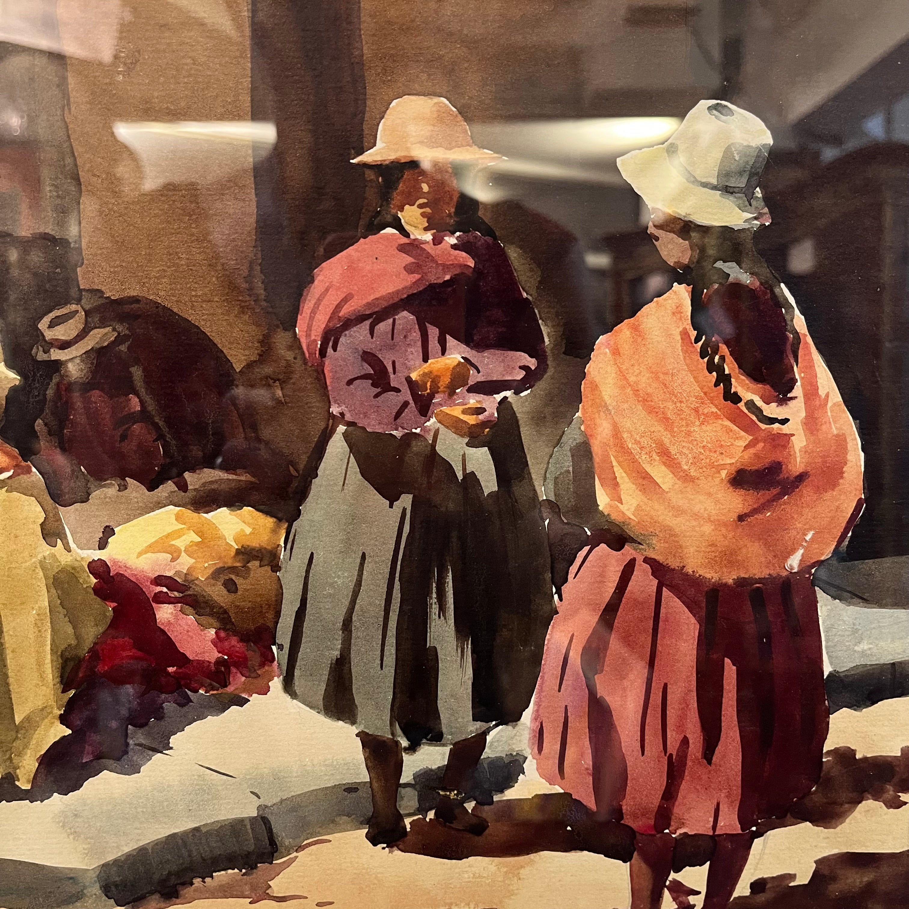 Atípica acuarela del pintor chileno Israel Roa, que retrata una hermosa escena de mujeres del norte, las clásicas cholas interactuando entre sí, en una calle. La pintura de intensos colores y marcadas siluetas encanta a primera vista con su singularidad.