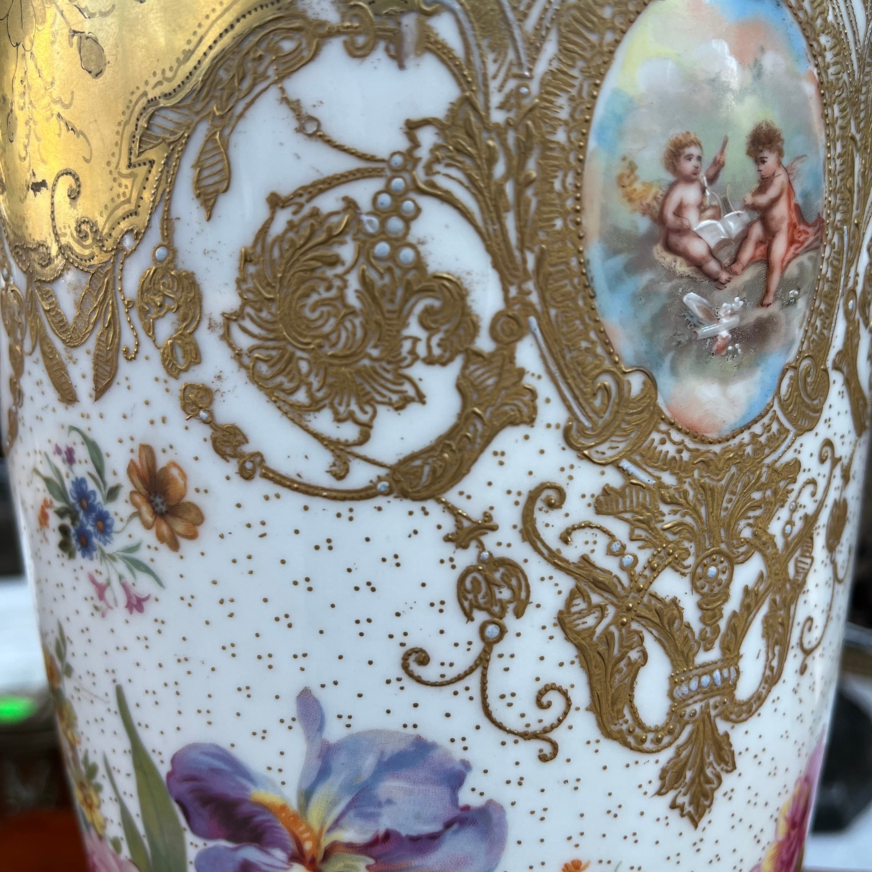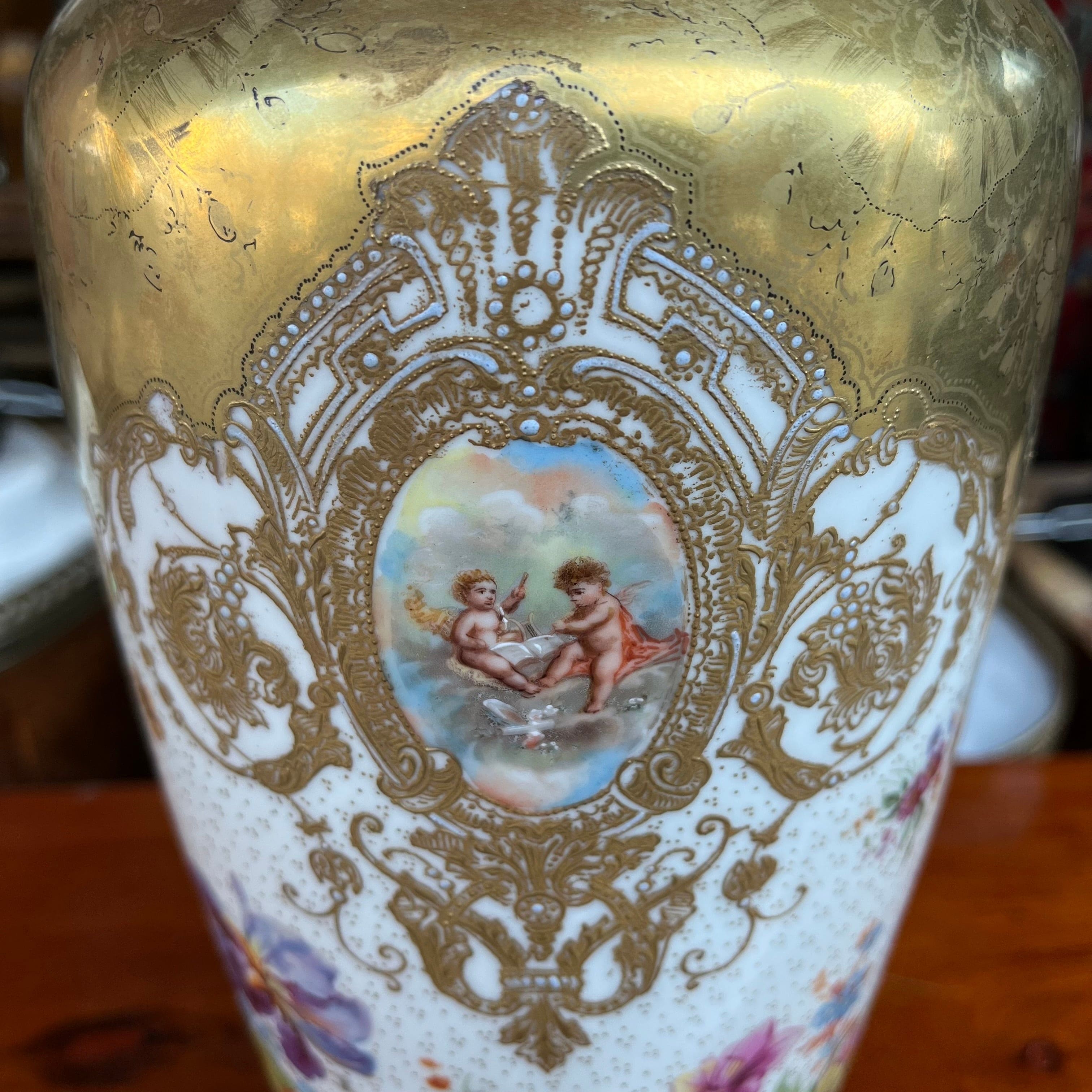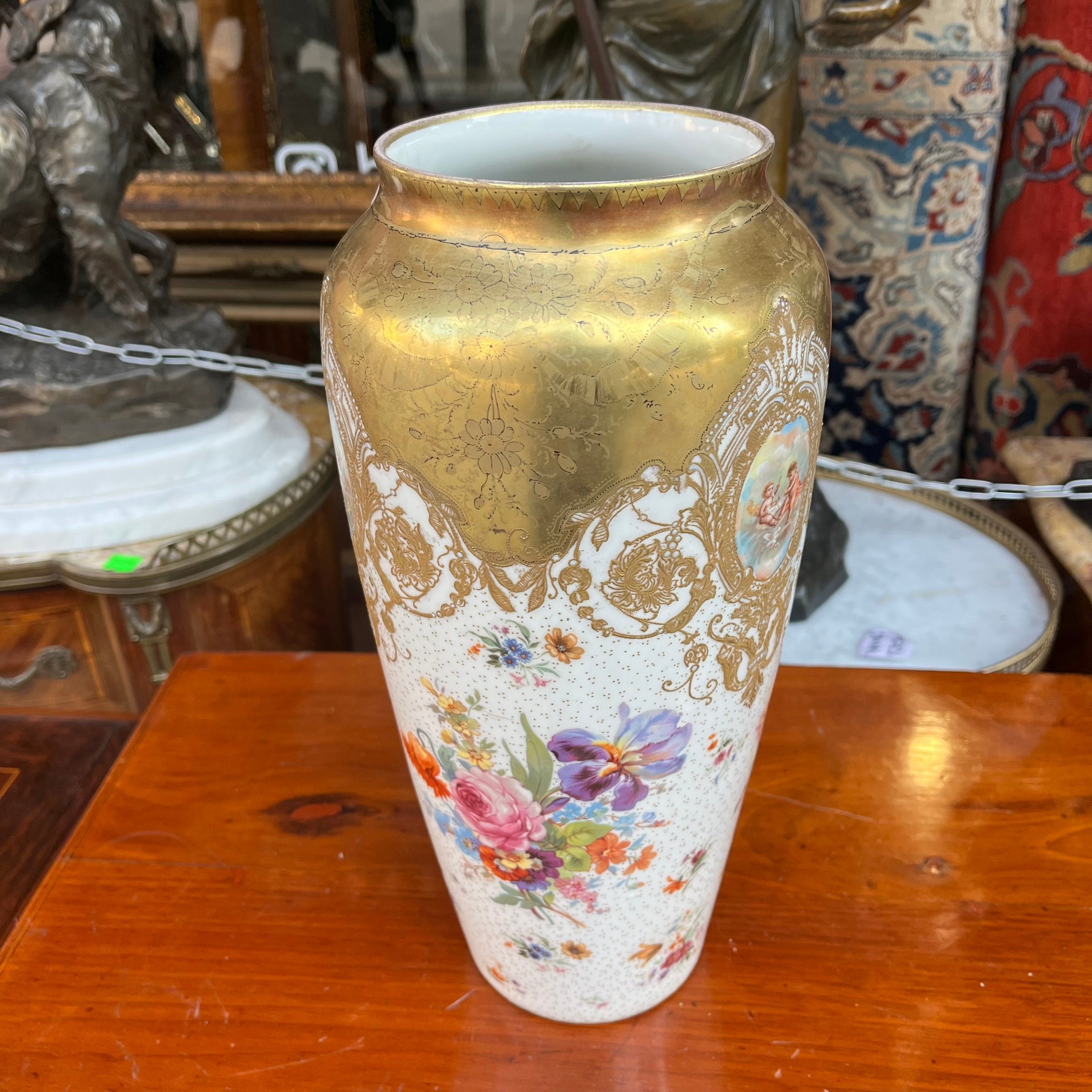 Hermoso florero de origen francés estilo Sevrès, con decoración policrómada dorada, con diseños florales y querubines.