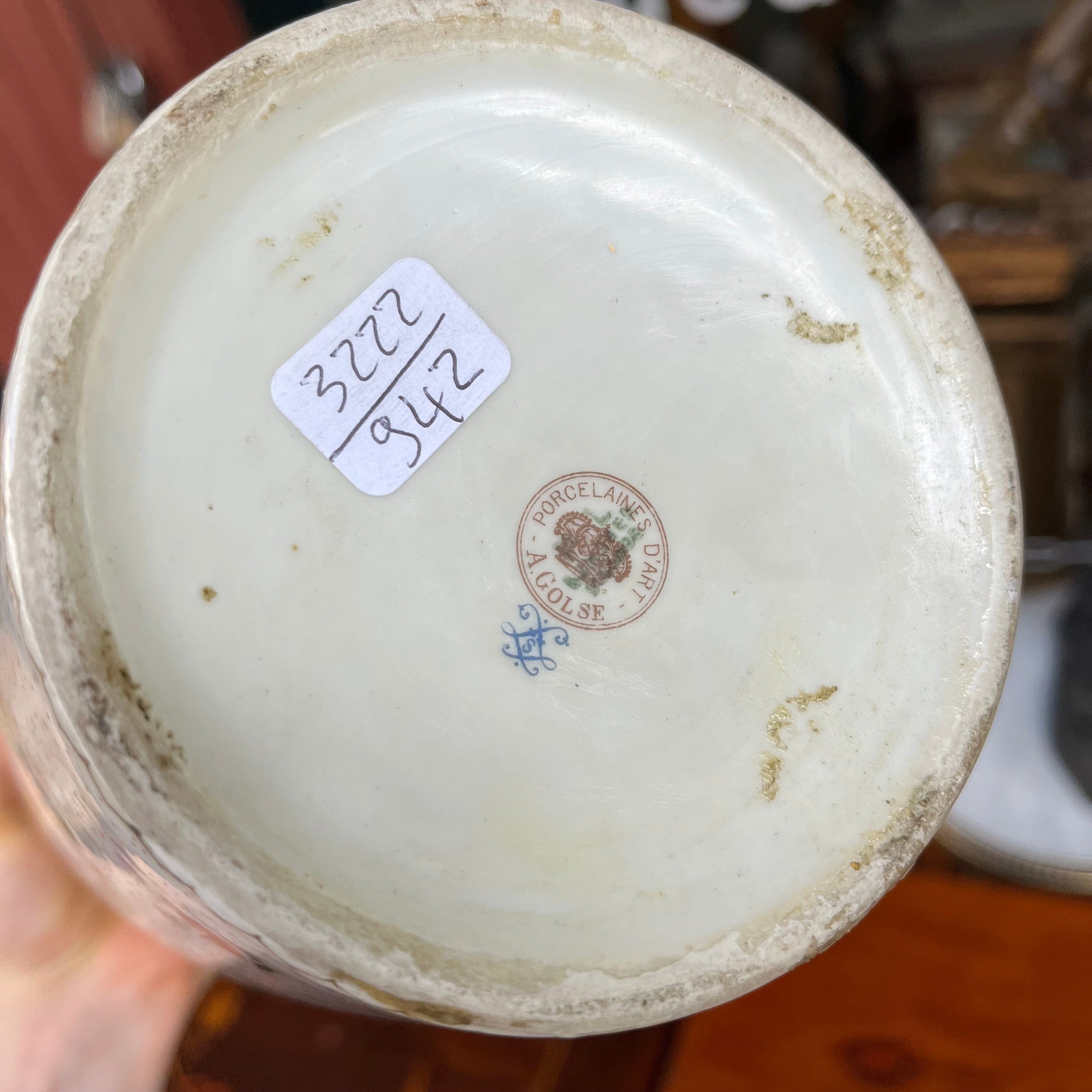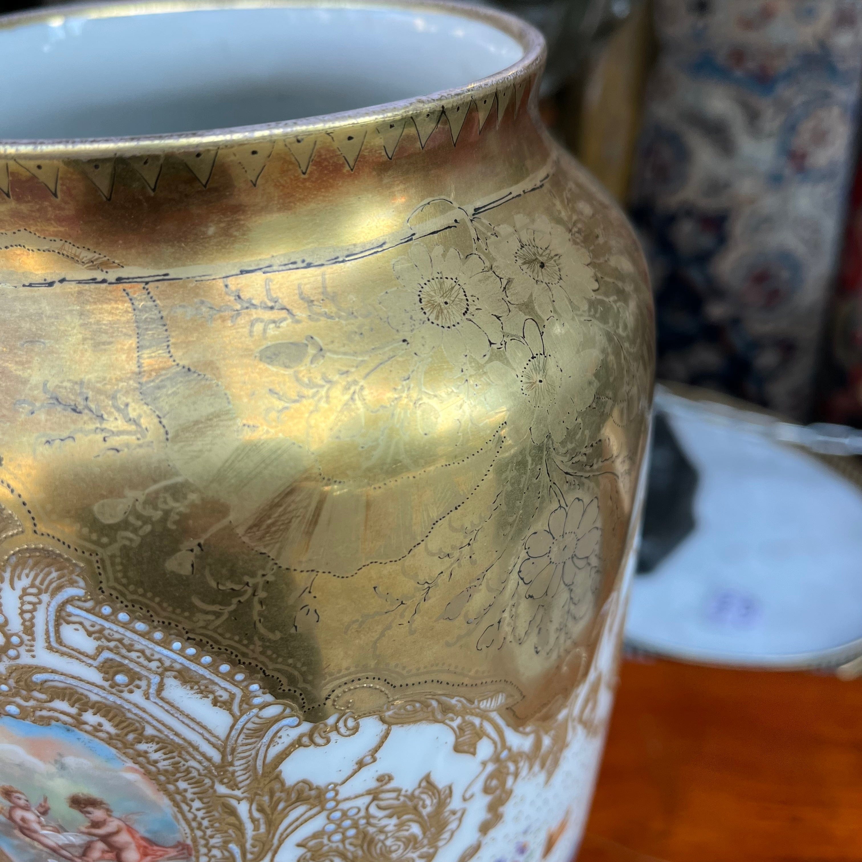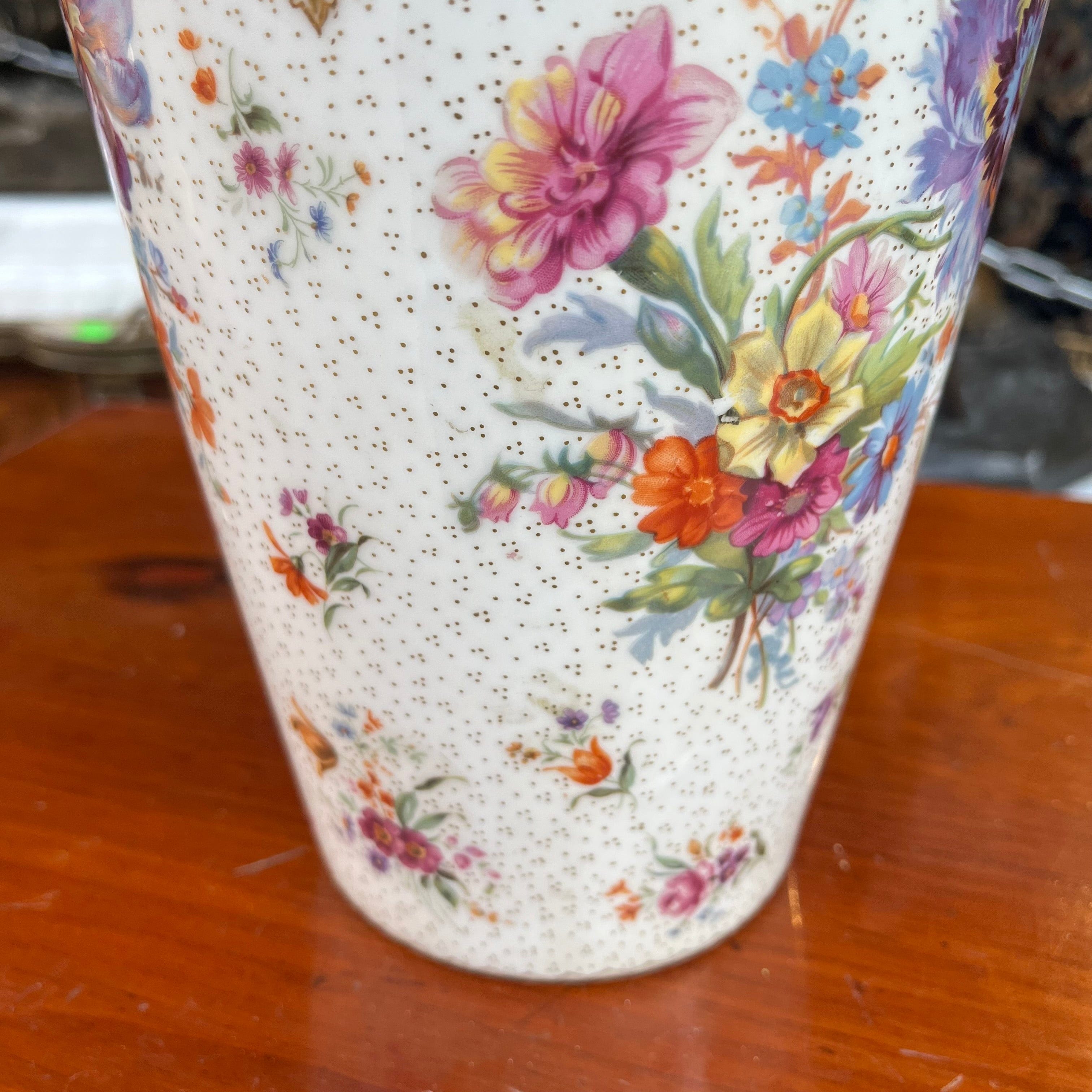 Hermoso florero de origen francés estilo Sevrès, con decoración policrómada dorada, con diseños florales y querubines.