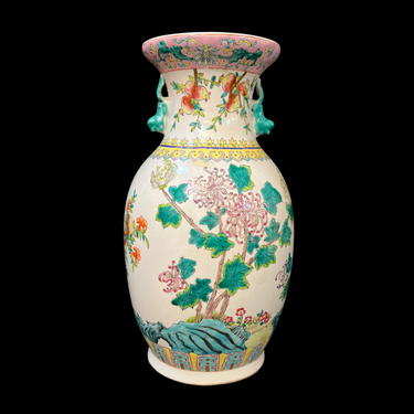 Hermoso jarrón de porcelana china famille rose representando un cerezo en flor, con vivos tonos verdes y rosados.