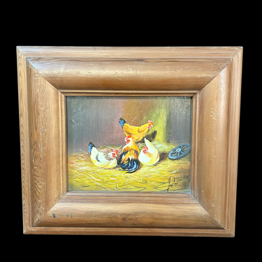 Luminosa pintura del talentoso pintor chileno Joelse que retrata 4 gallinas en lo que puede ser un gallinero. Es un cuadro donde se pueden apreciar los detalles realistas de cada gallina, sus plumas, rostros y movimiento, entregando la sensación de estar presente en una escena viva.