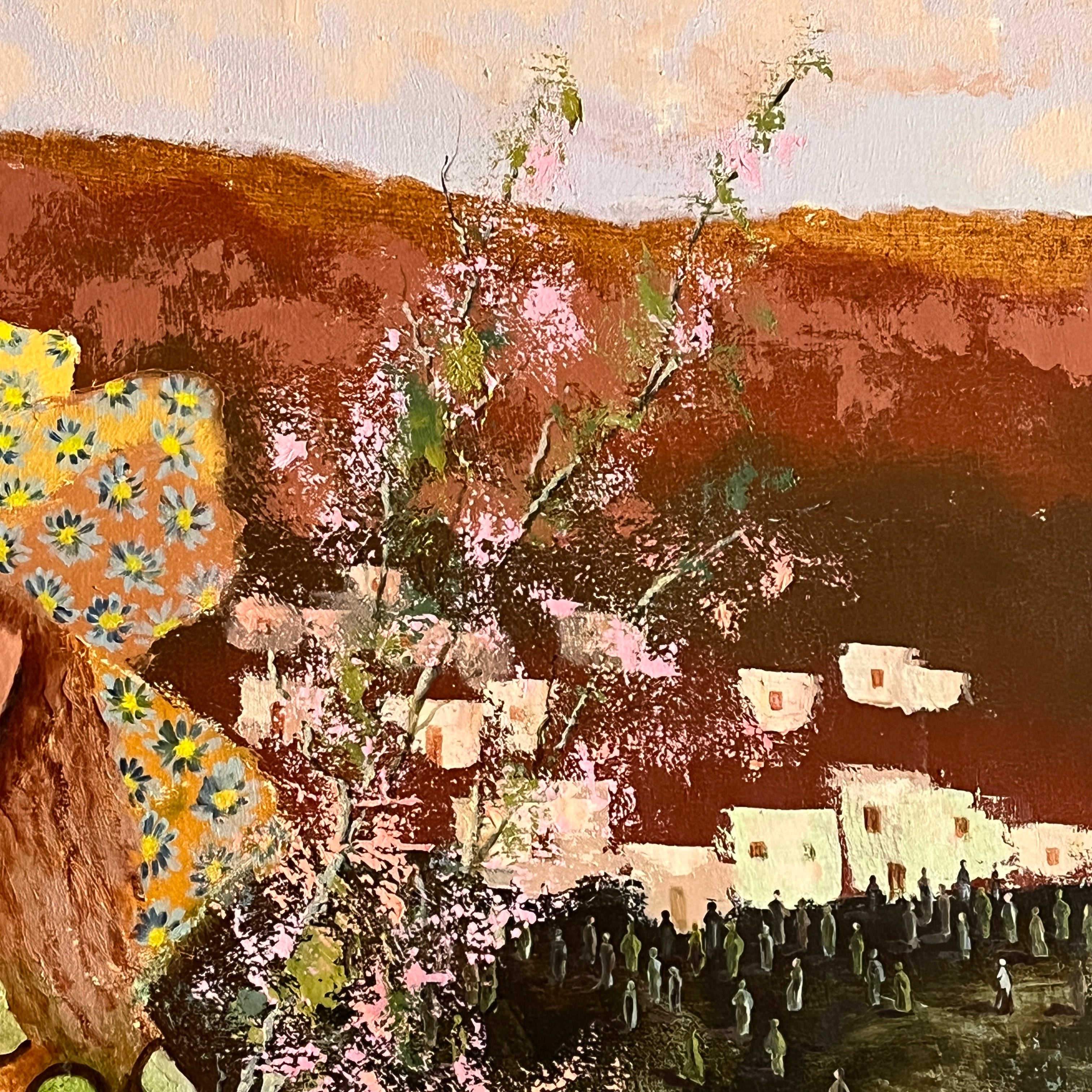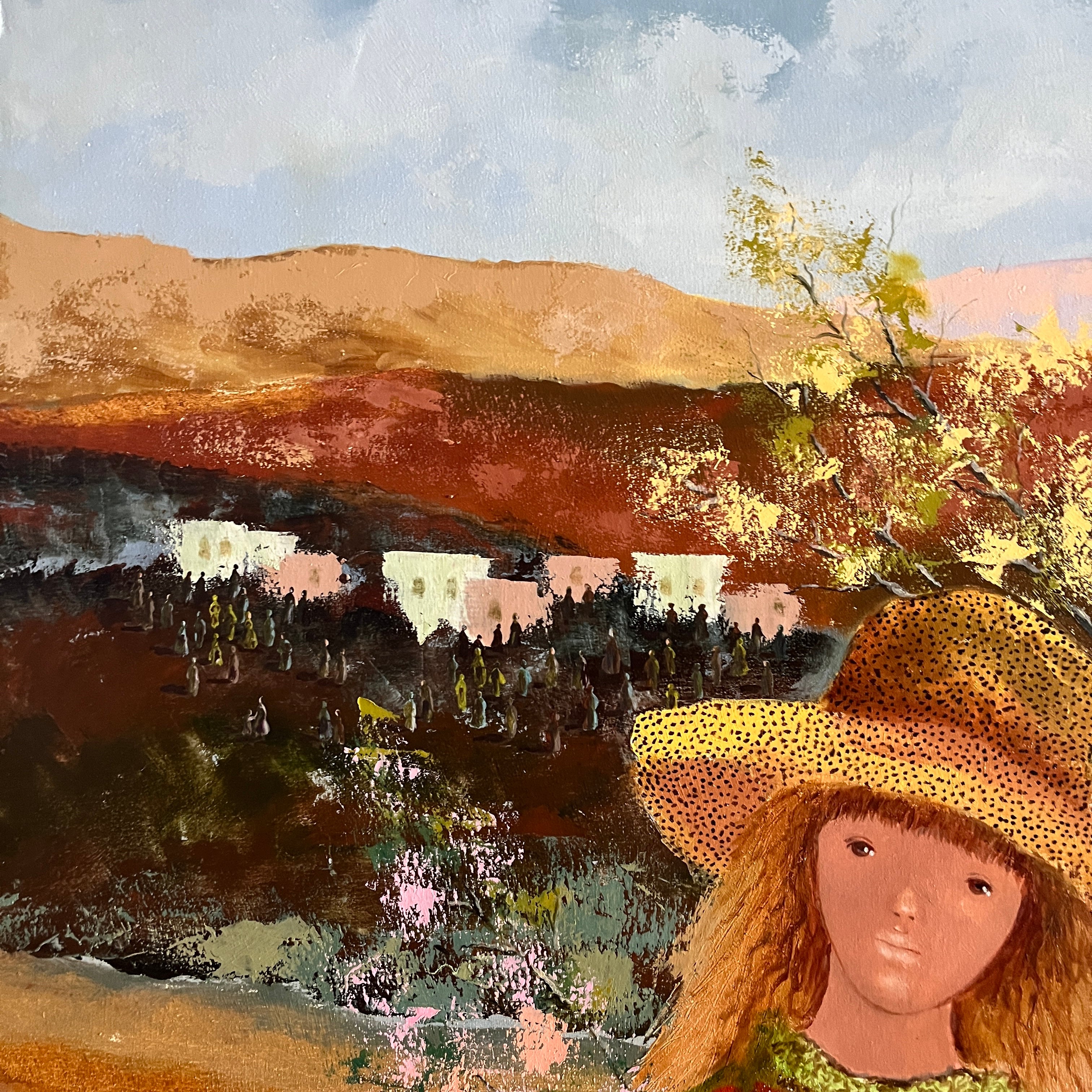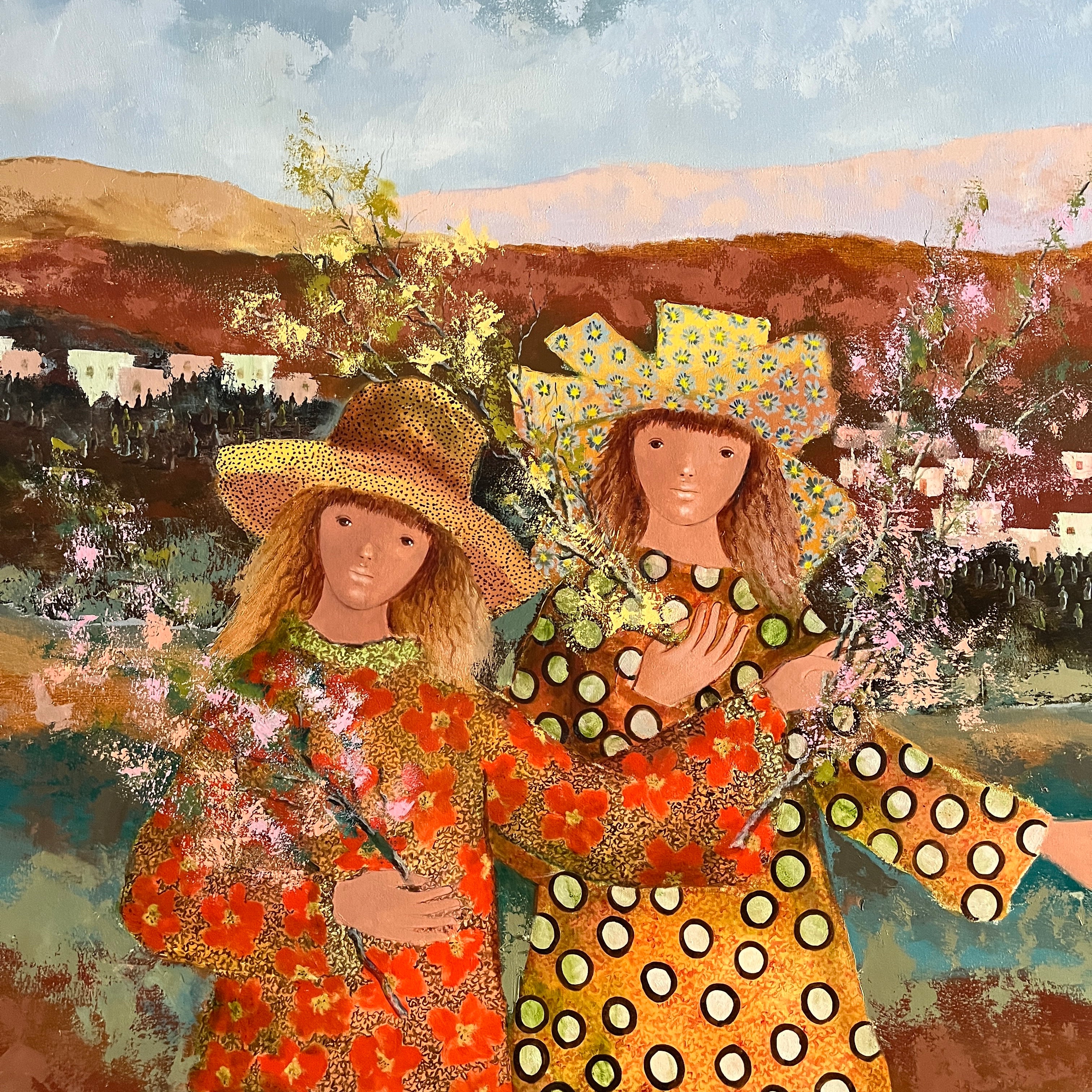 Óleo sobre tela del pintor chileno José de Rokha (1927-1994), representando a dos jóvenes, con coloridos vestidos y sombreros, que llevan ramas con flores en sus manos. De fondo, un paisaje de cerros en tonos cálidos y terrosos, cruzados por una franja celeste que sugiere un río. Sobre los cerros se ven algunas casas blancas y siluetas de personas. Esta figura de las dos jóvenes, presentes en varias obras del artista, va en línea con la búsqueda de José de Rokha de capturar un fragmento de lo latinoamericano, a partir del uso del color, el gesto y el paisaje.