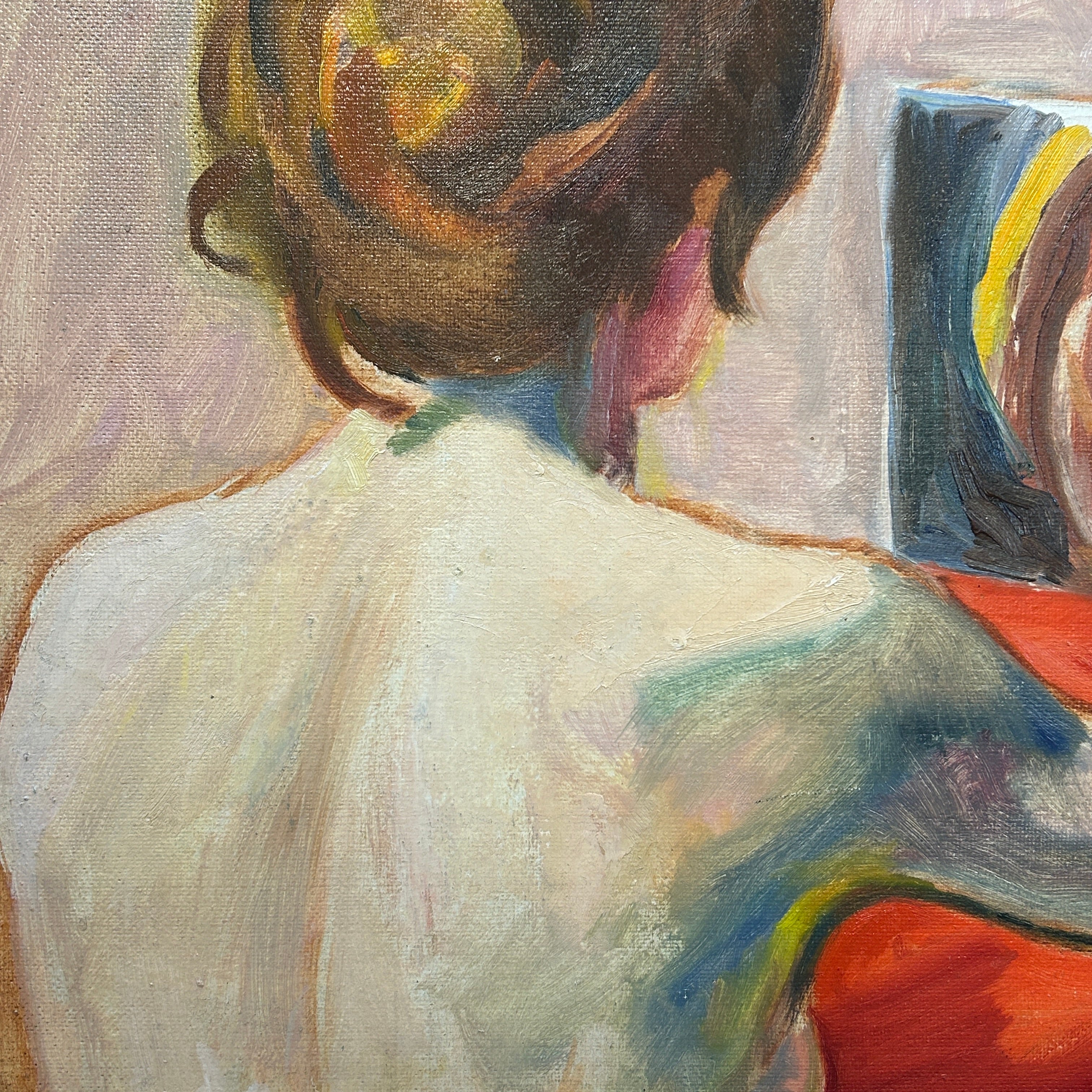 Íntimo cuadro de Larraín (1899-1994) que muestra una mujer de espalda desnuda a quien se le ve su rostro a partir de un espejo que sostiene en la mano.