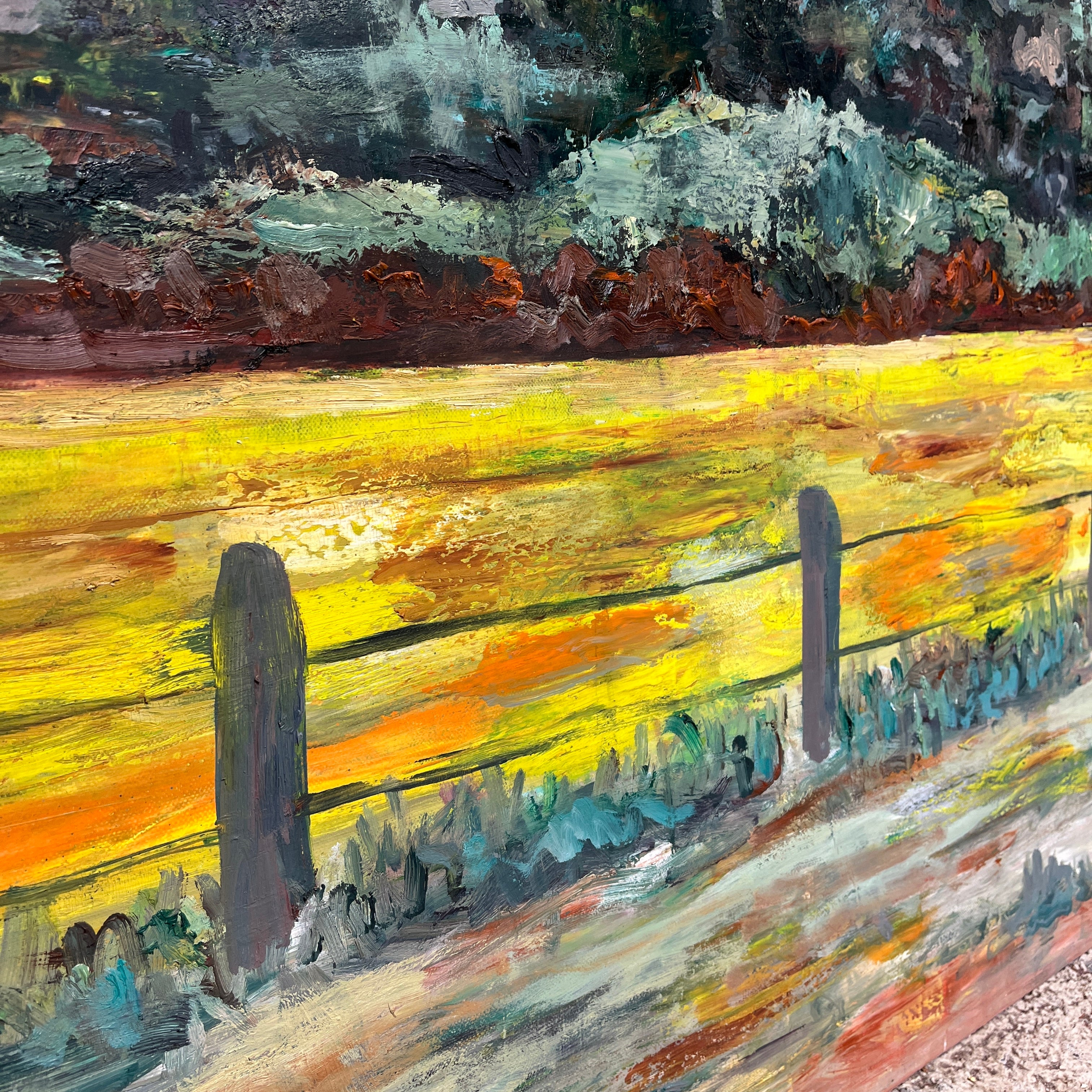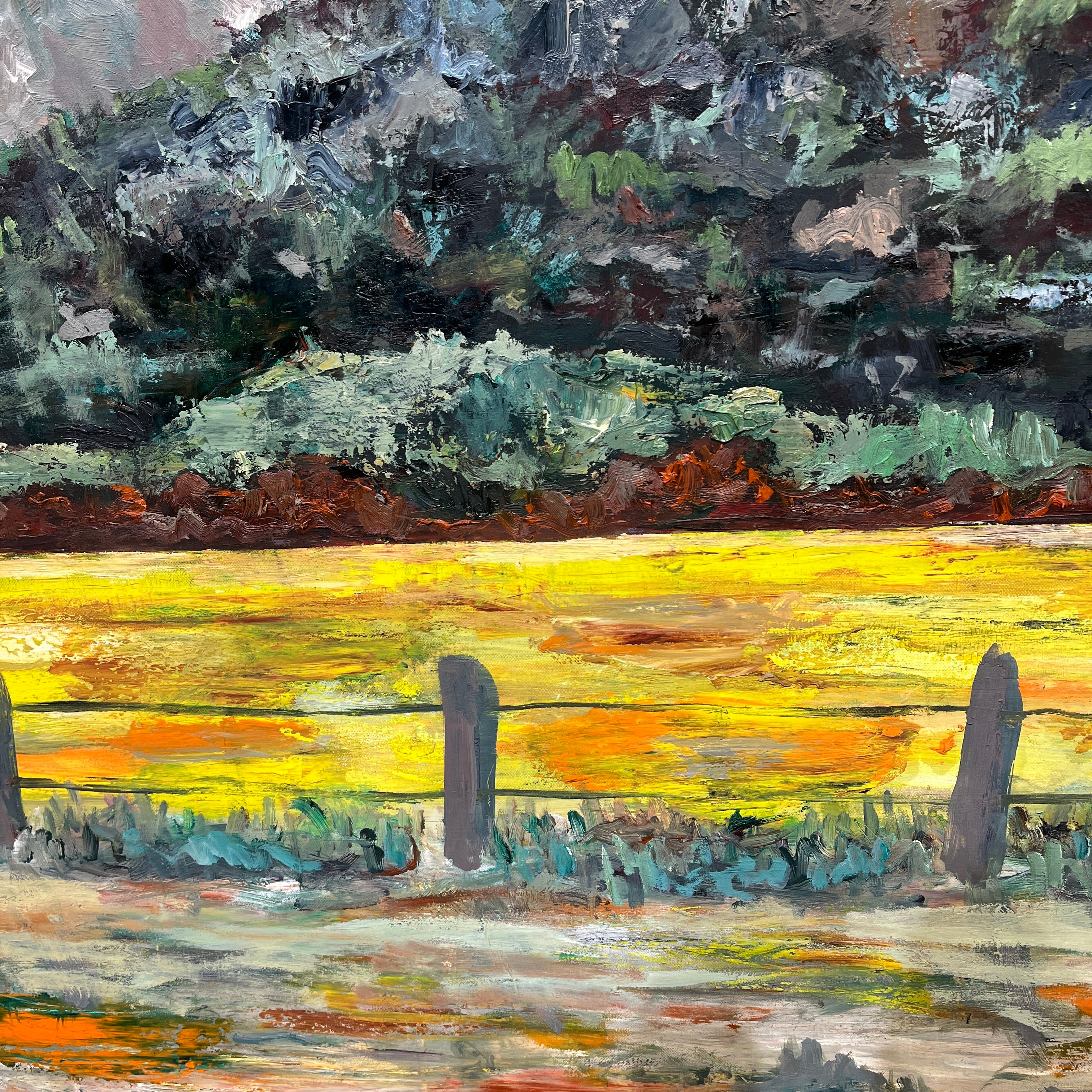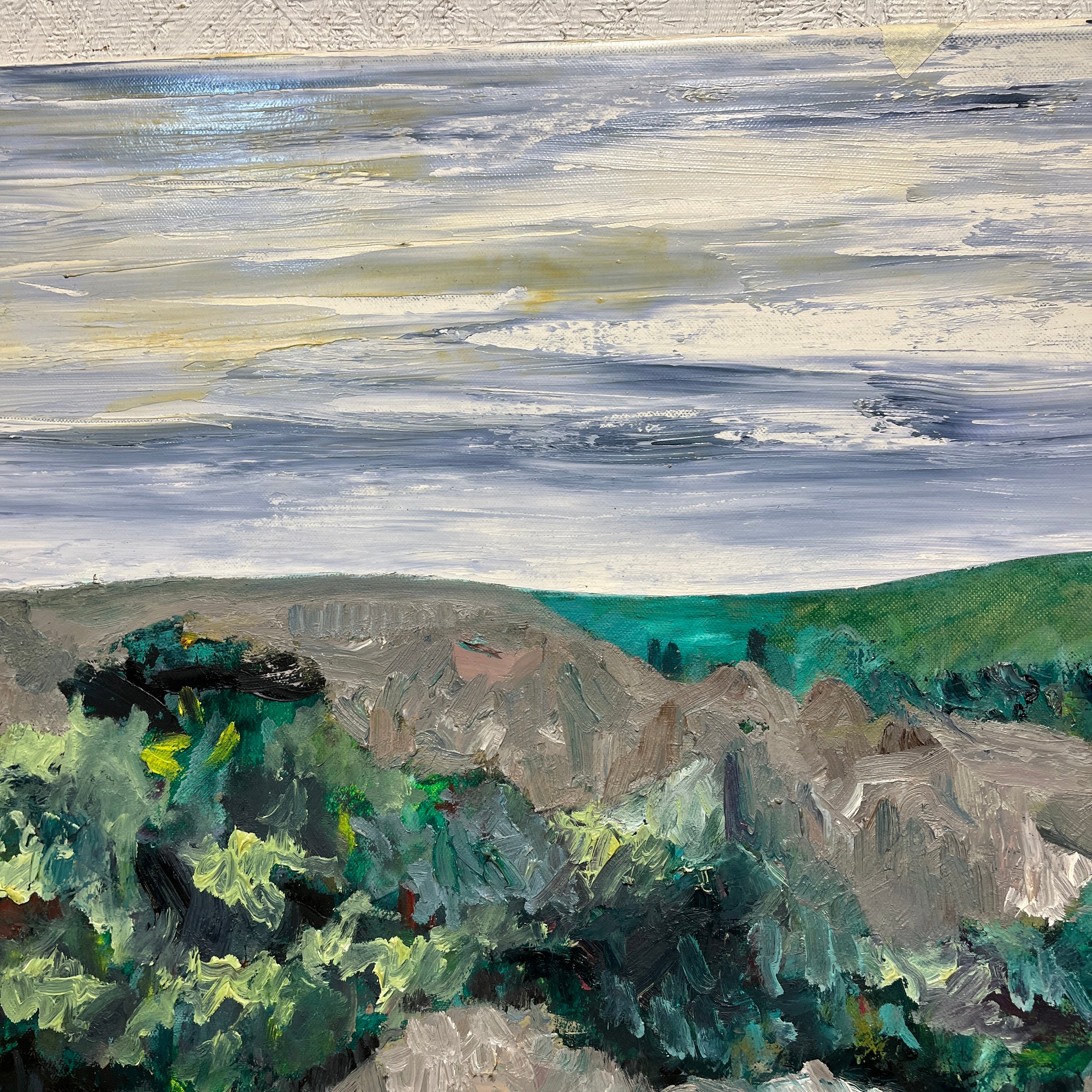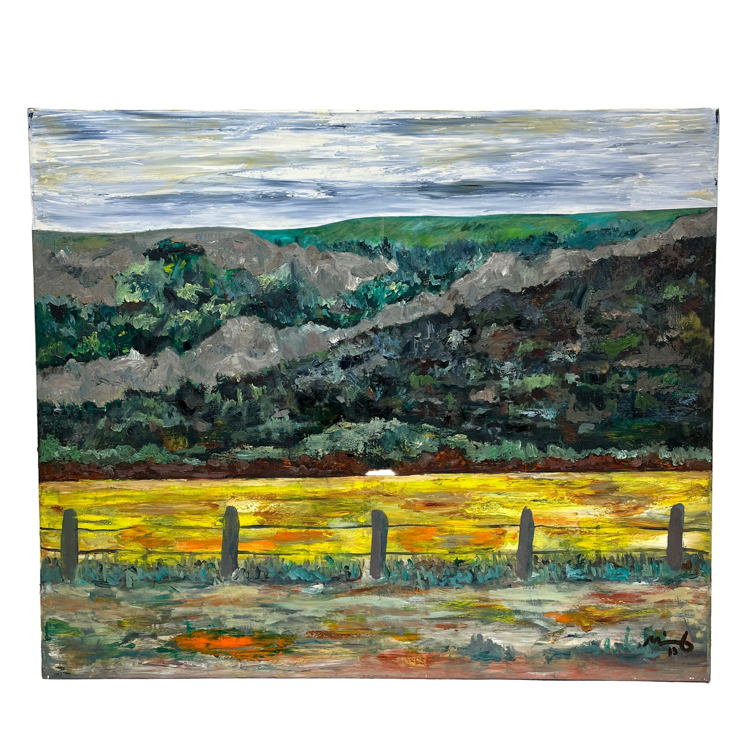 Óleo sobre tela del pintor Luis Márquez P. La obra representa un paisaje en el que se ve un cerro y un pastizal, pintados con trazos expresivos y una mezcla de tonos de verde, que van desde tonos oscuros hasta una combinación con amarillo. La obra sugiere una recorte del paisaje, similar a la vista de un viaje en carretera por Chile.