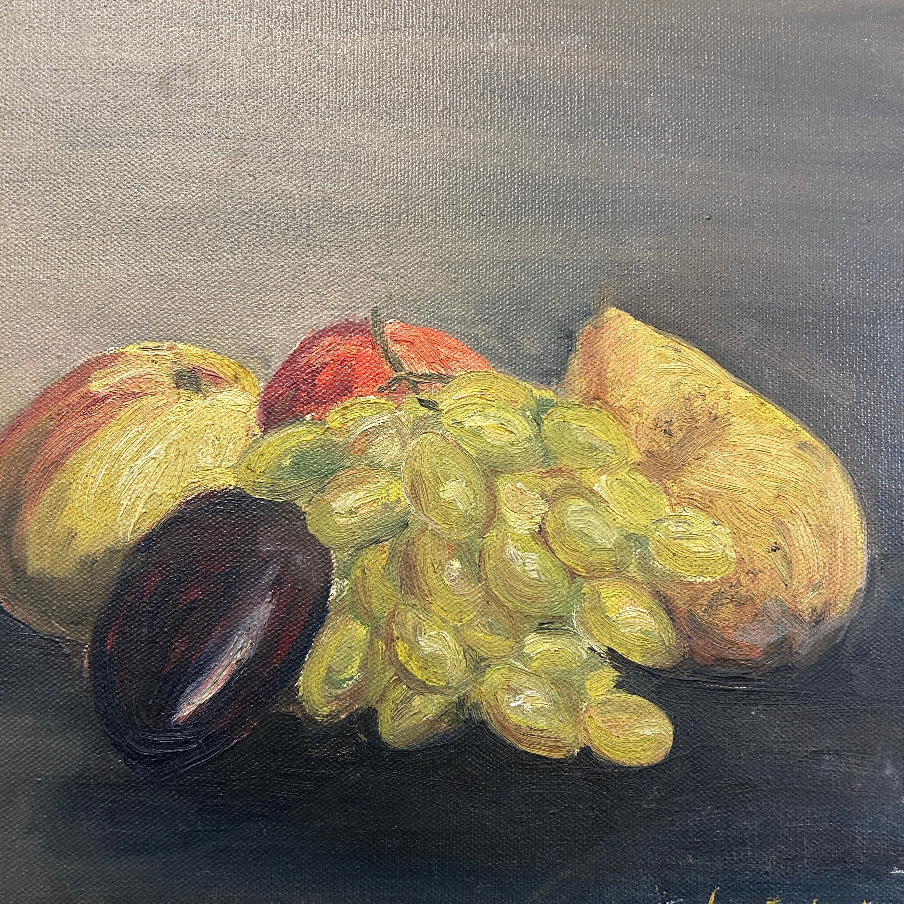 Tradicional bodegón del pintor chileno Luís Torterolo, donde podemos apreciar una interesante selección de frutas para ser retratadas. Juega con las formas y colores, resalta en frente una ciruela oscura que contrasta con las de más atrás en tonos amarillos, rojos y verdes claro.