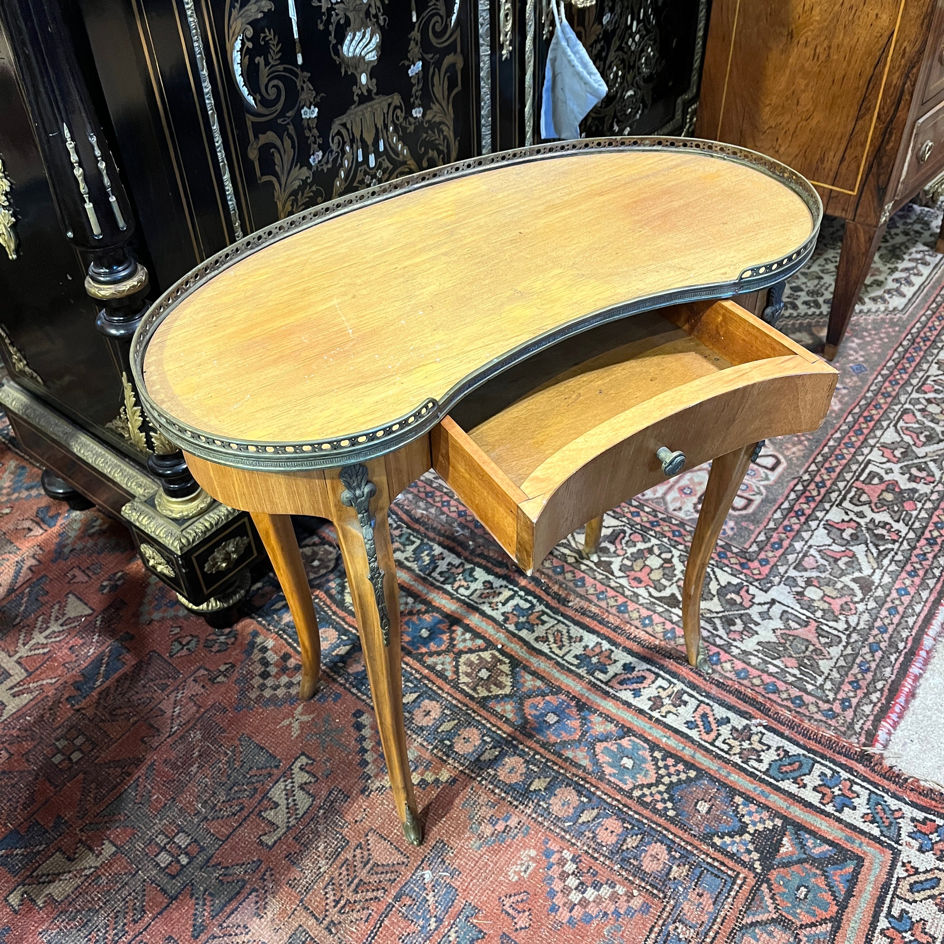 Bella mesa de apoyo de origen francés estilo Luis XVI en forma de riñón, hecha de madera frutal, con patas curvas, aplicaciones y cintillo de bronce. La mesa tiene un cajón.