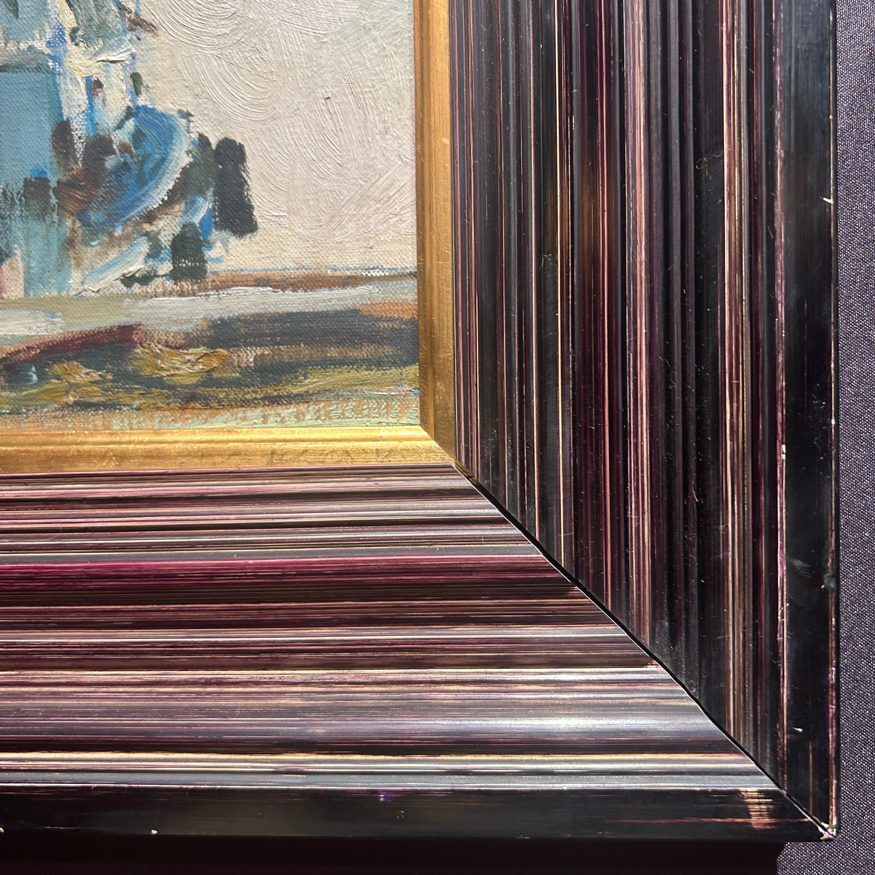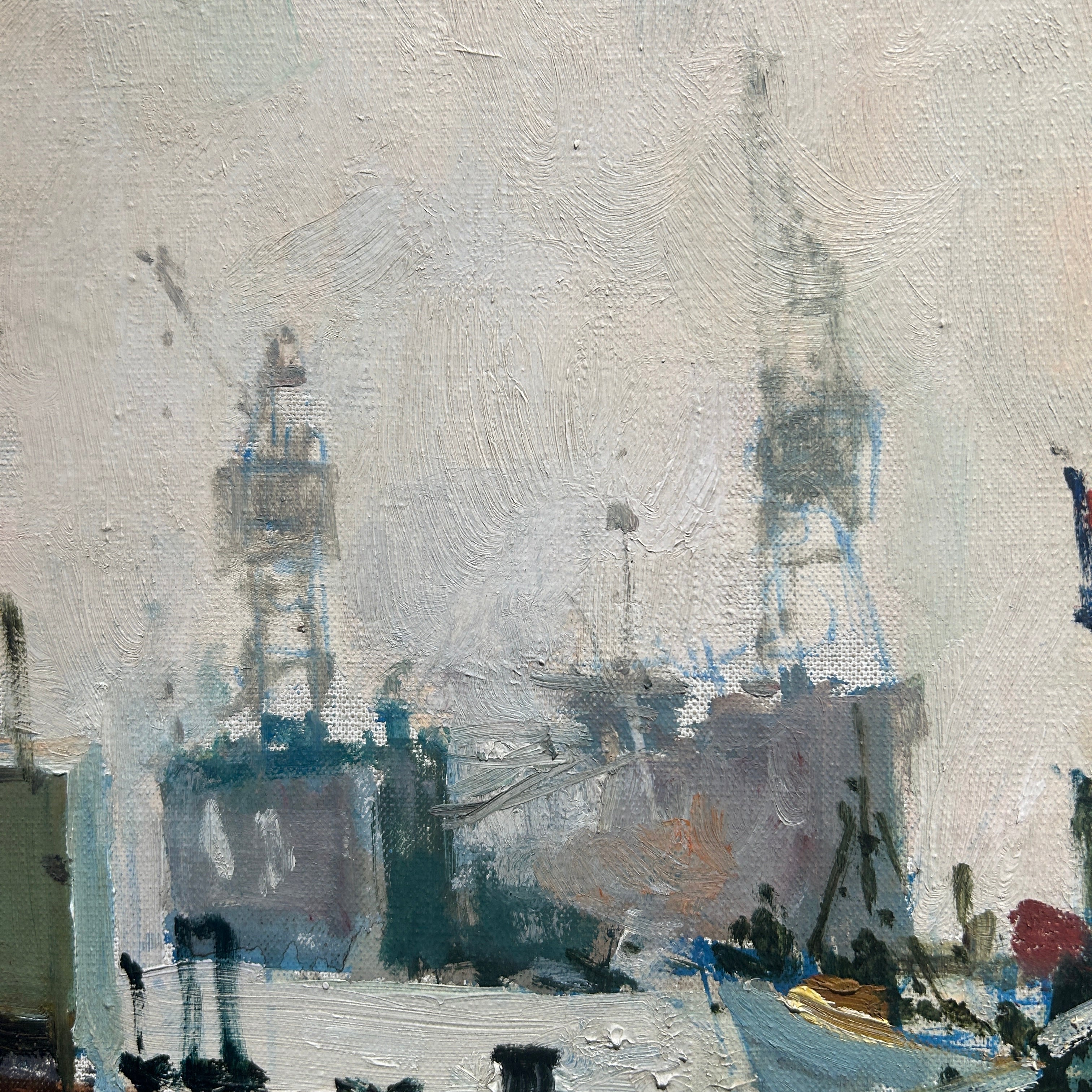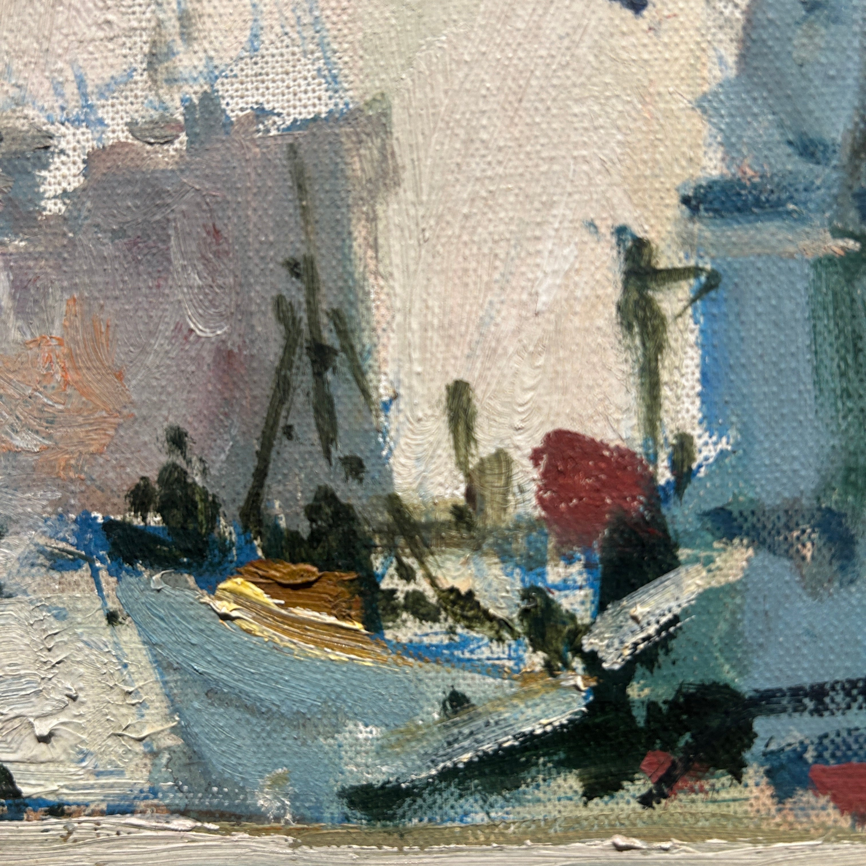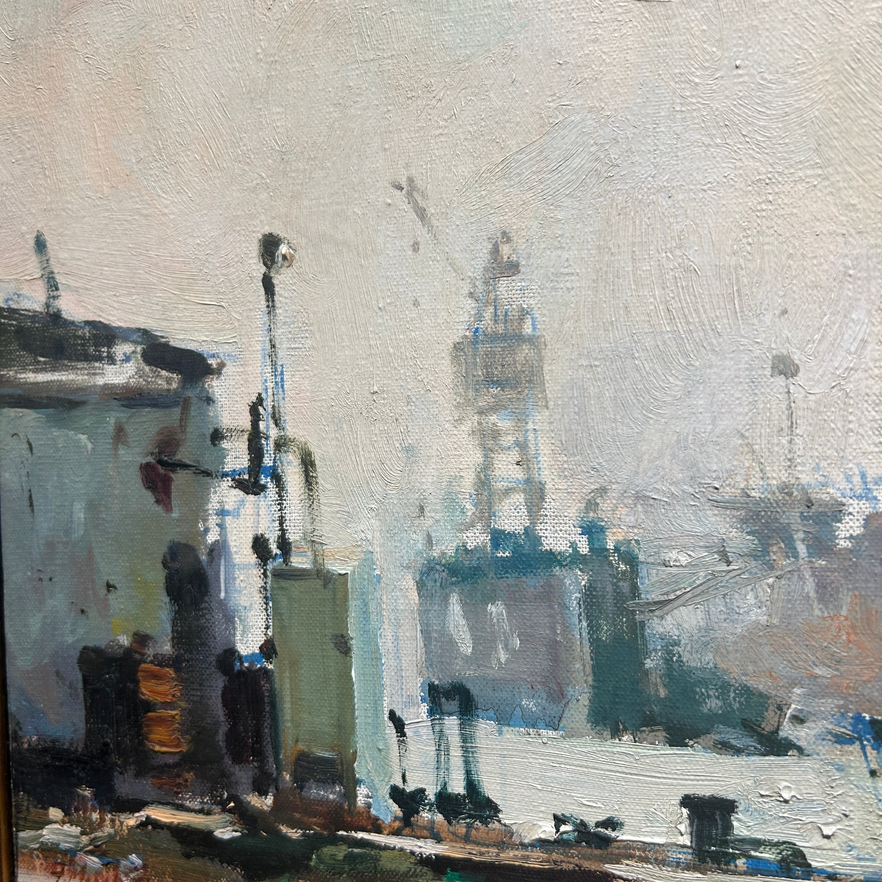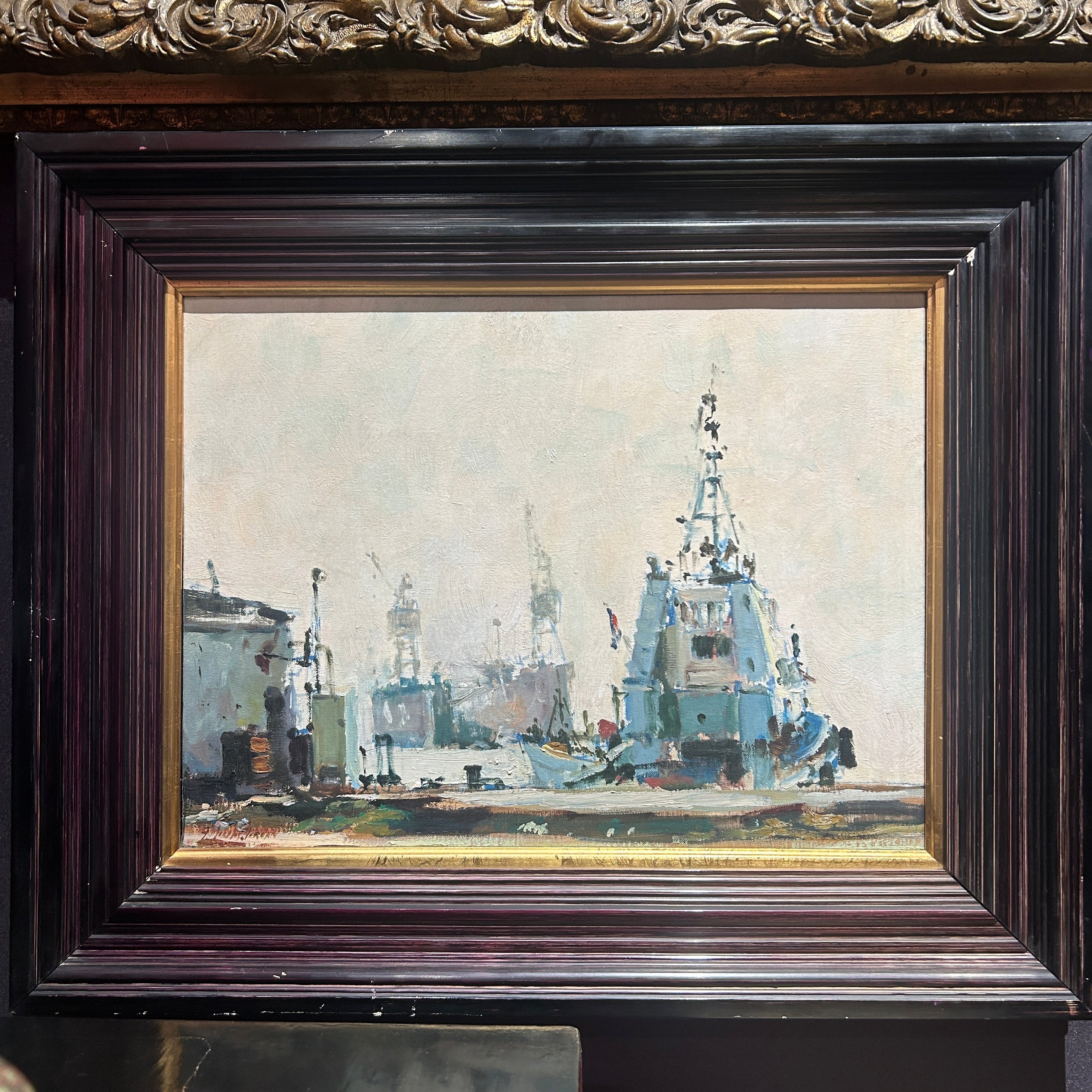 El gran artista chileno Fernando Morales Jordán presenta un bello óleo sobre tela inspirado en la observación de buques de guerra fondeados en un puerto con grúas al fondo, presumiblemente en Valparaíso. El marco es de madera y yeso pintado.