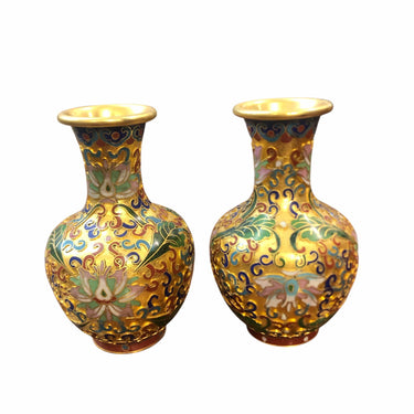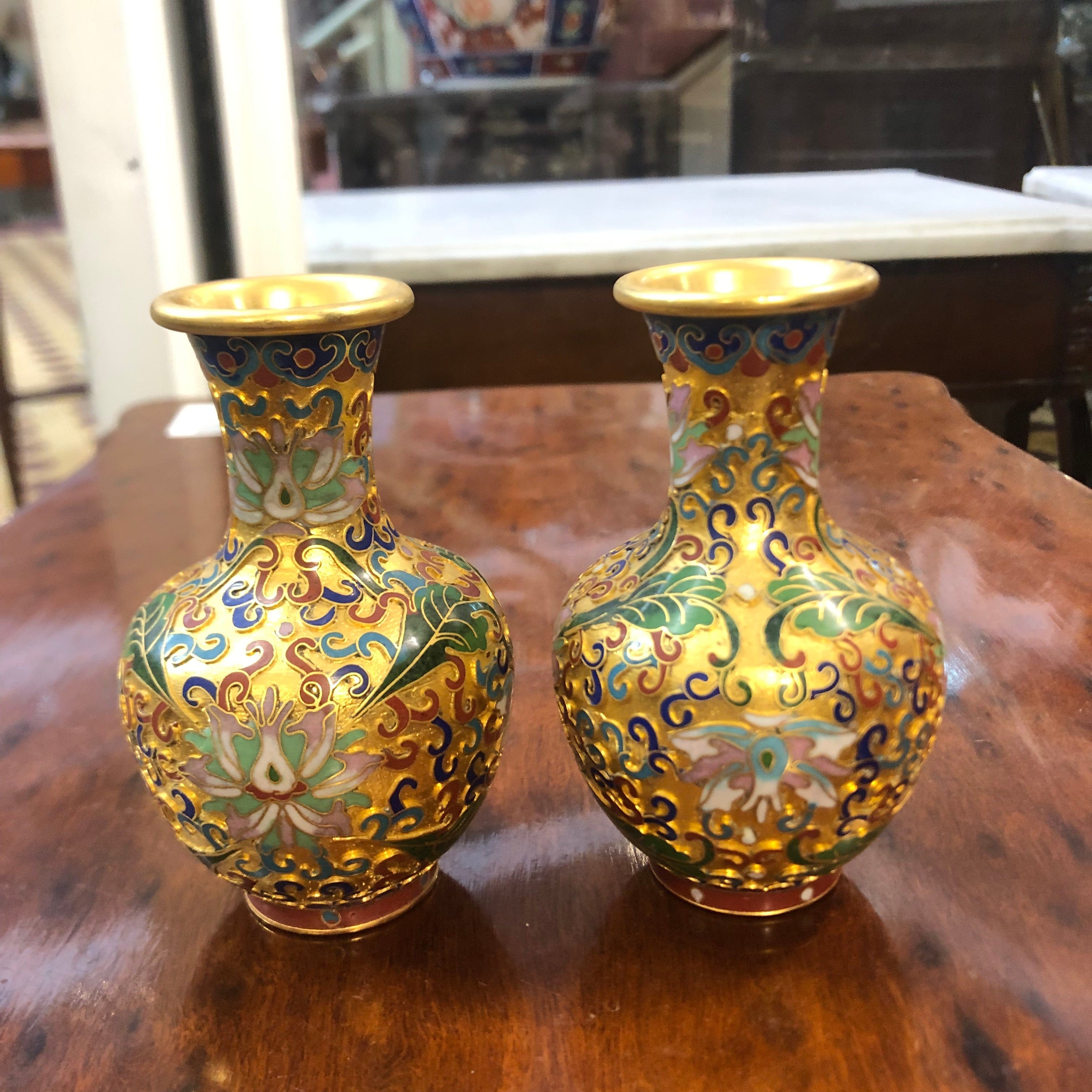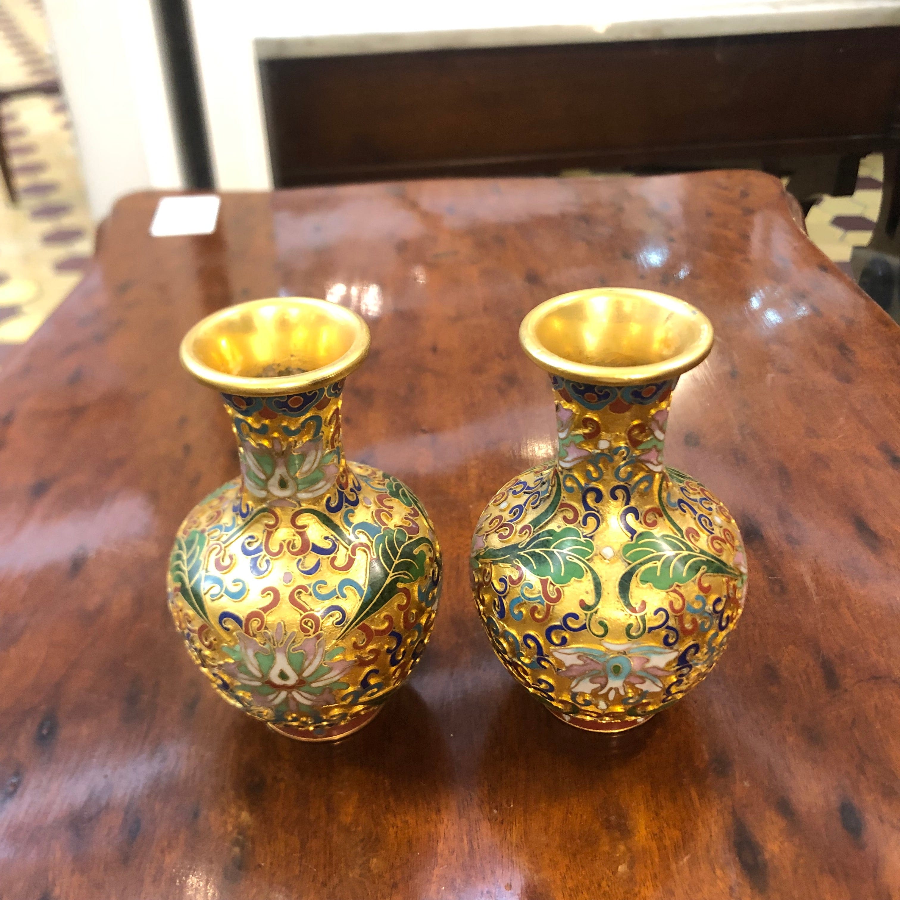 Bello par de jarrones cloissone miniatura , diseño de flores sobre dorado.
