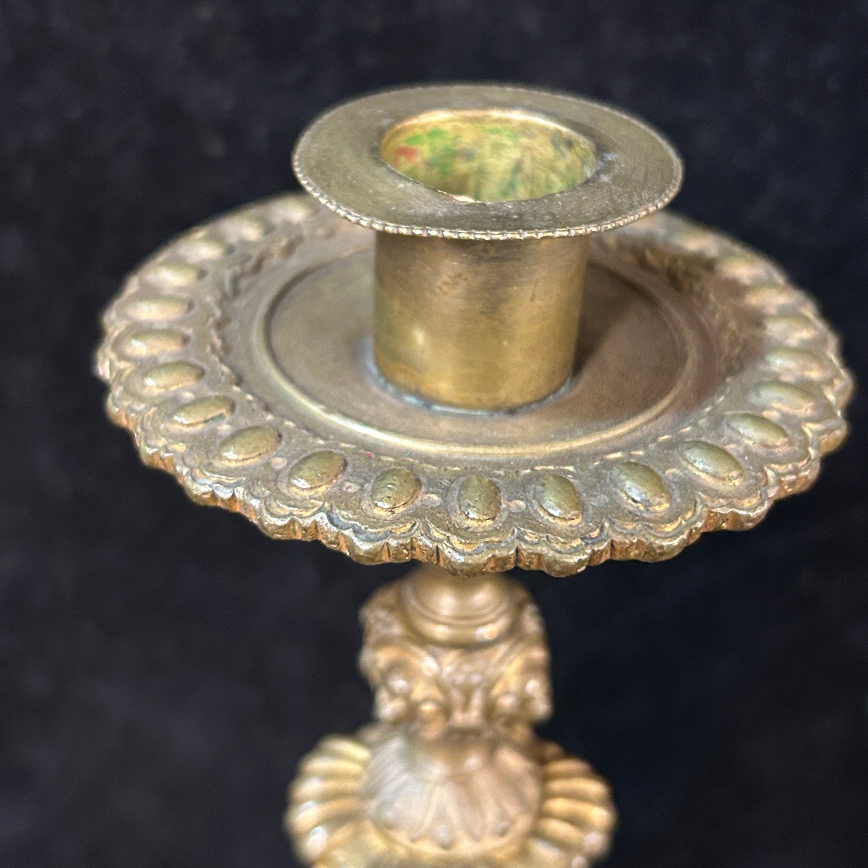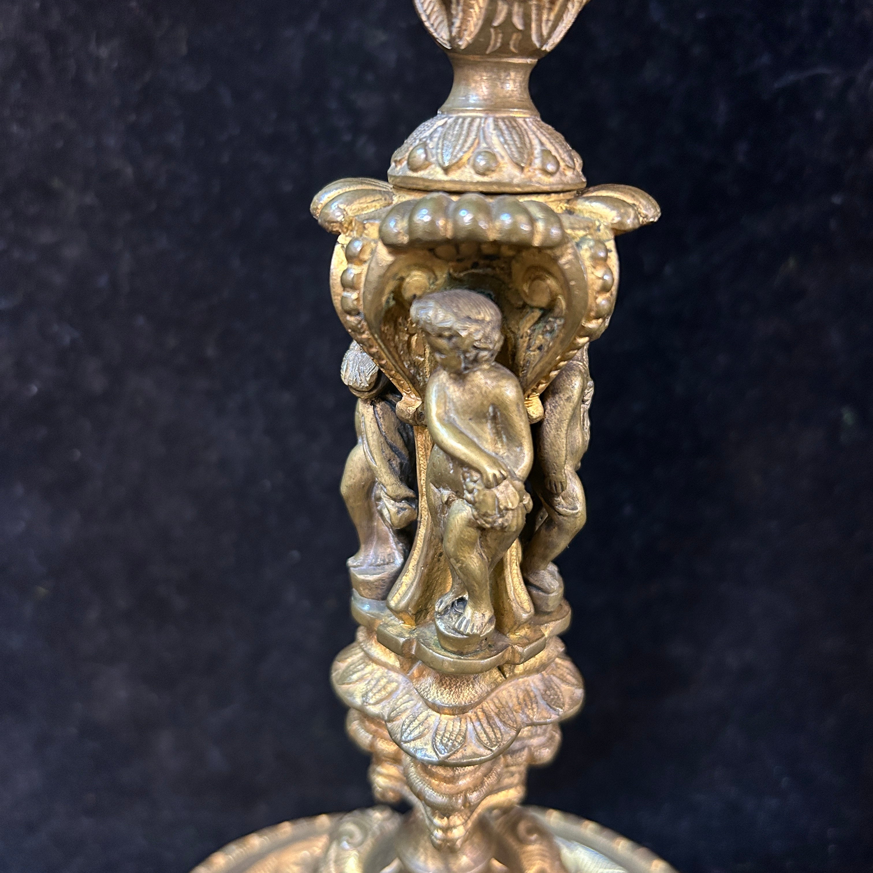 Pareja de bellos candelabros rusos en bronce, con mangos con relieves detallados y figuras talladas con motivos de de femineidad y cosecha.