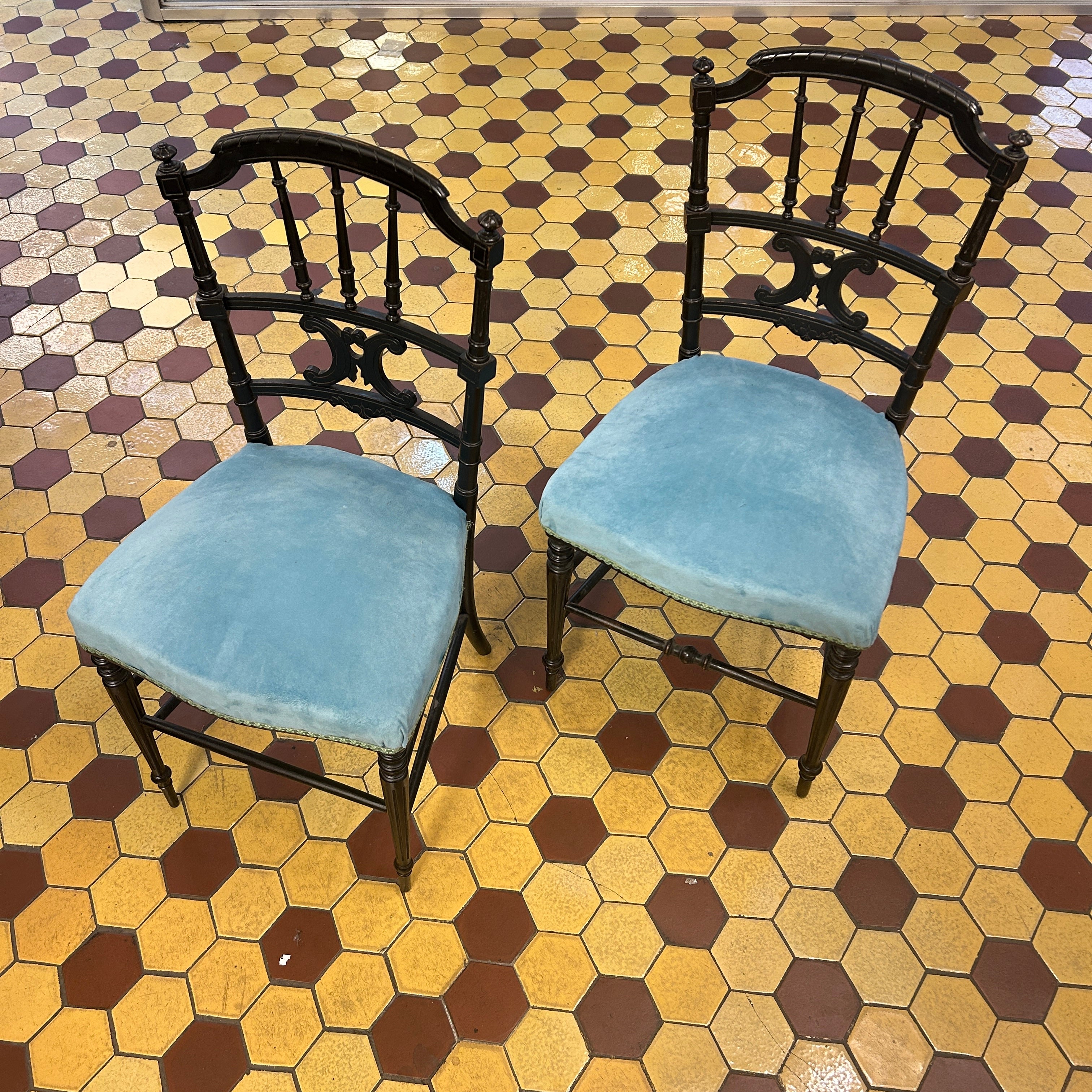 Pareja de sillas francesas Napoleon III lacadas tapiz terciopelo turquesa