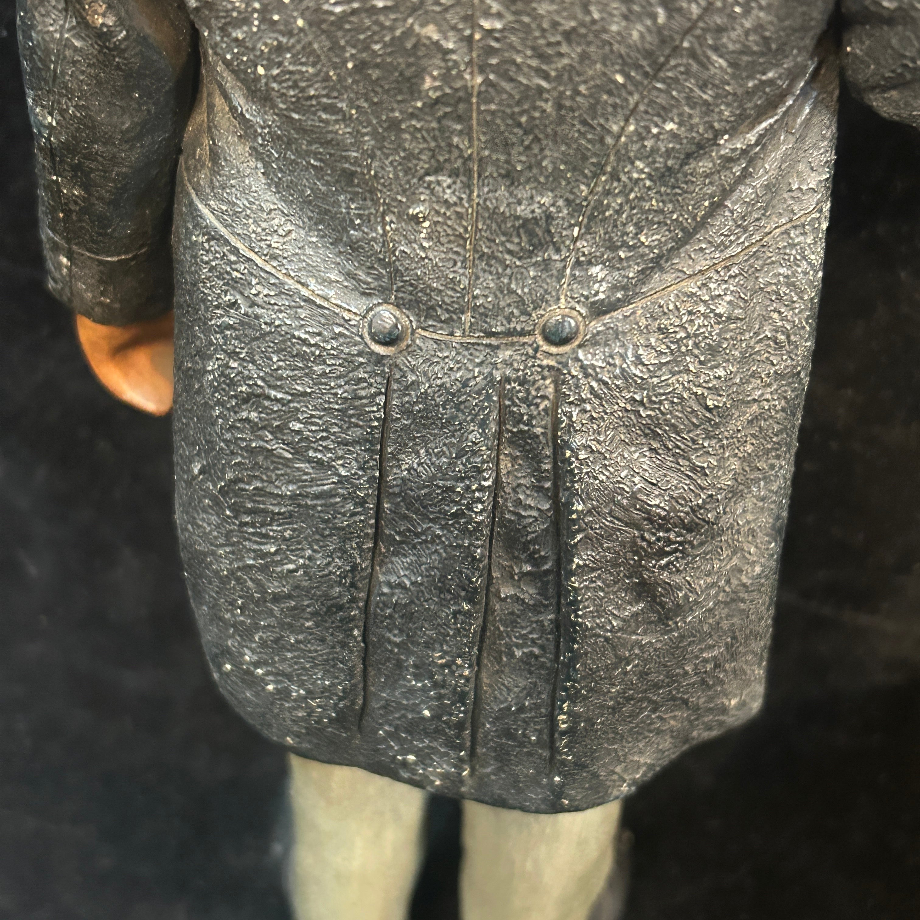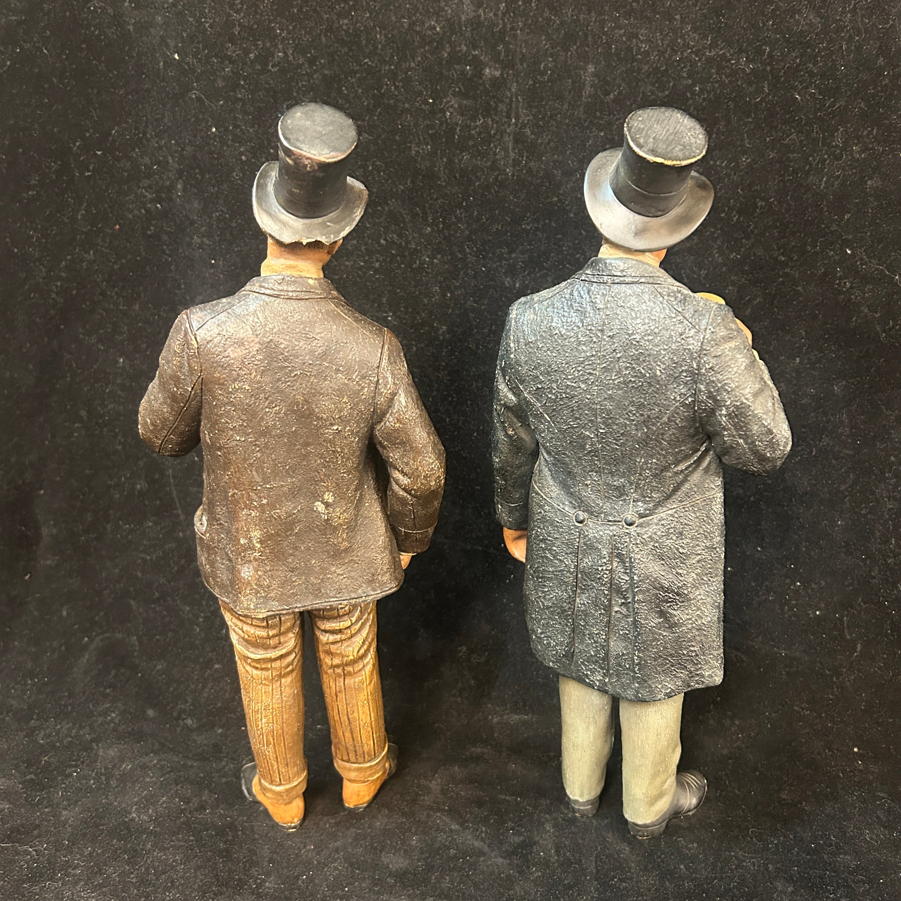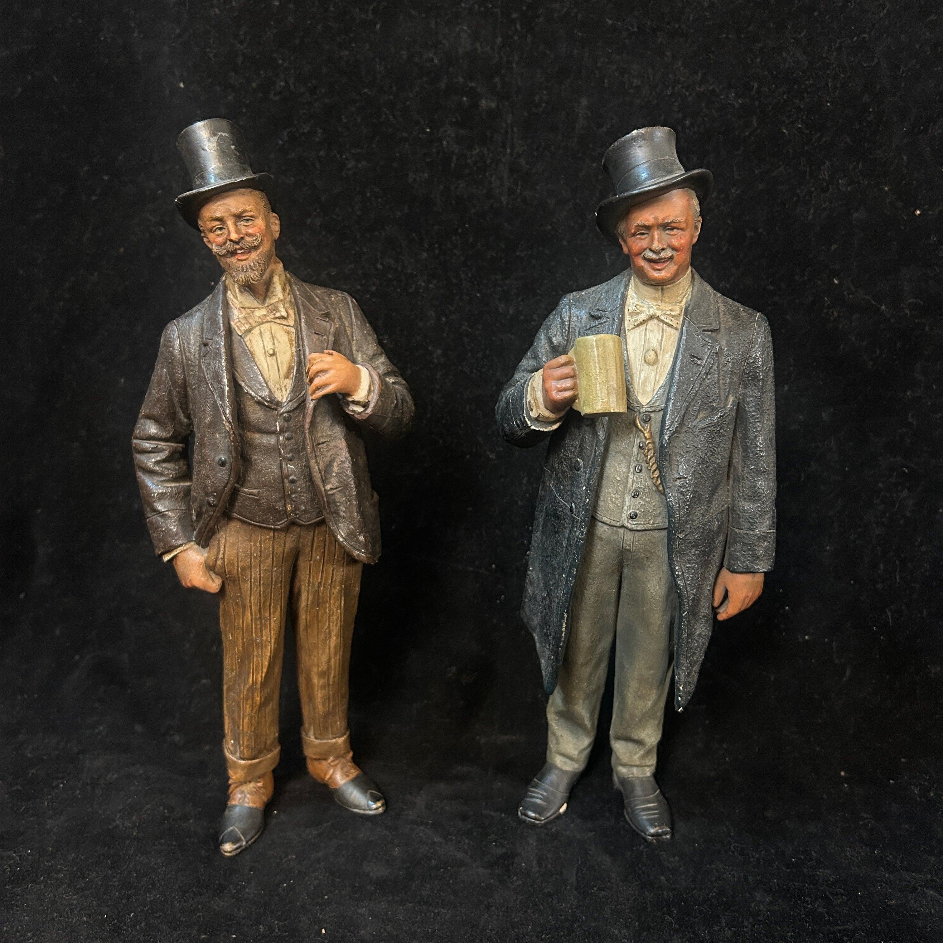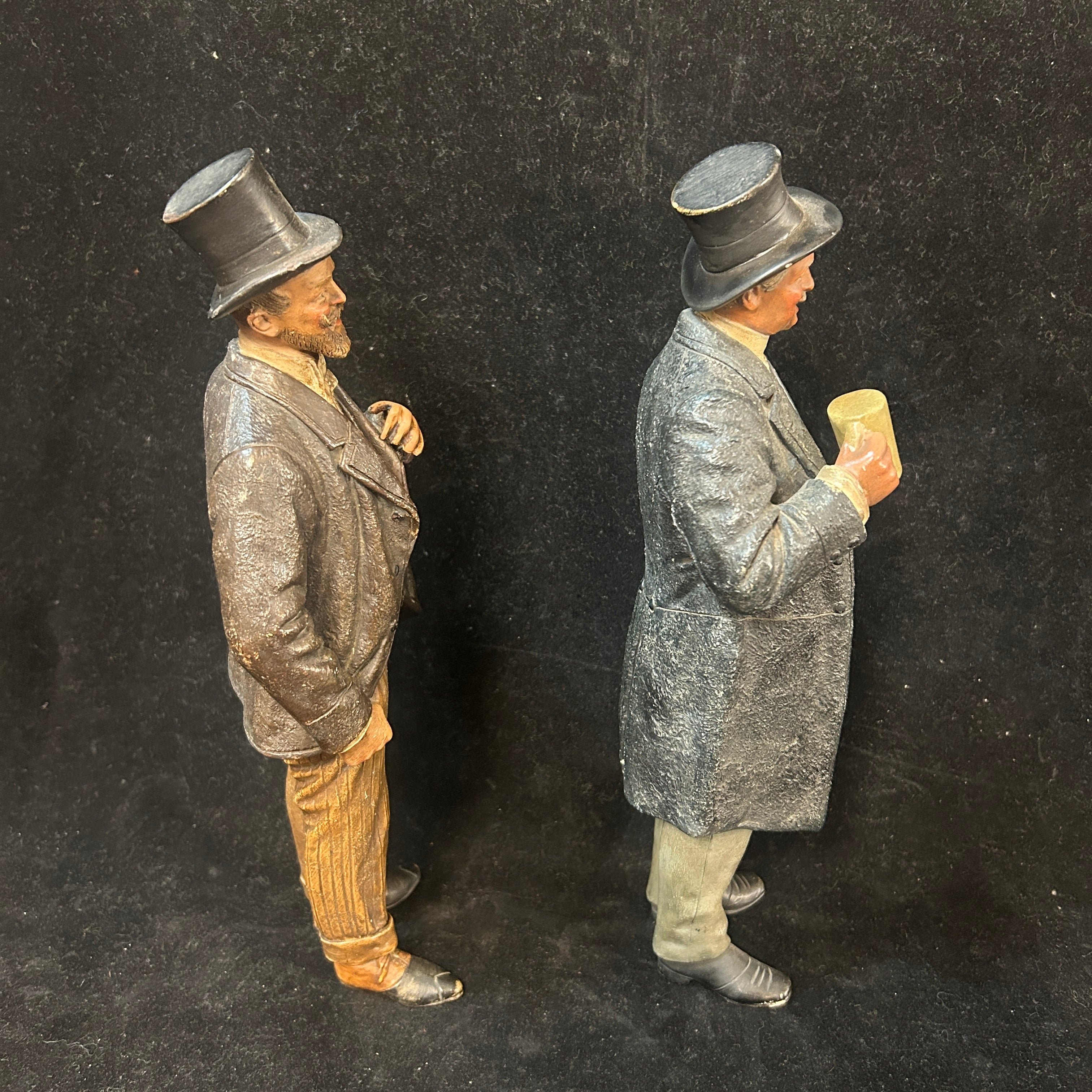 Pareja de figuras de terracota francesa, representando a un par de caballeros de x época, vestidos con traje y sombrero de copa, con un gesto relajado y de goce. Uno de ellos tiene una jarra de cerveza en su mano, aludiendo a un contexto más cotidiano y relajado.