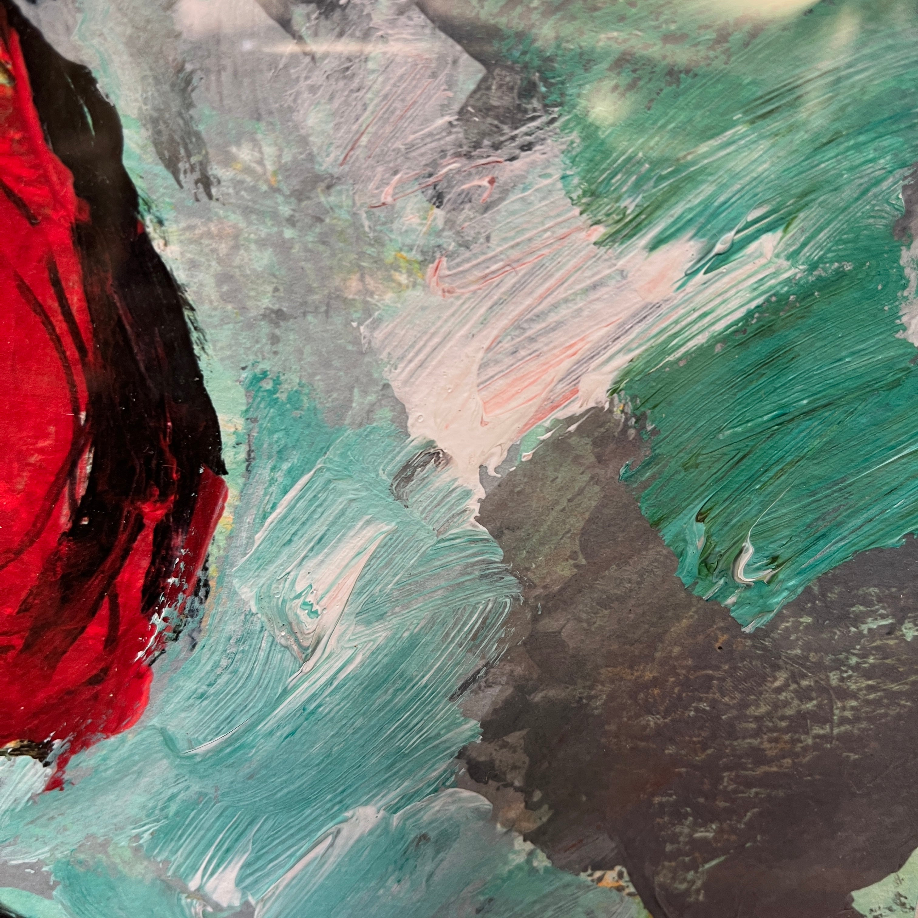 Acrílico sobre papel del artista chileno Vittorio Queirolo, representando tres rosas rojas con su particular y reconocible estilo. Las flores, de colores saturados, están sobre un fondo de trazos grises y calipso. La obra tiene un marco contemporáneo, de diseño minimalista, pintado en dorado.